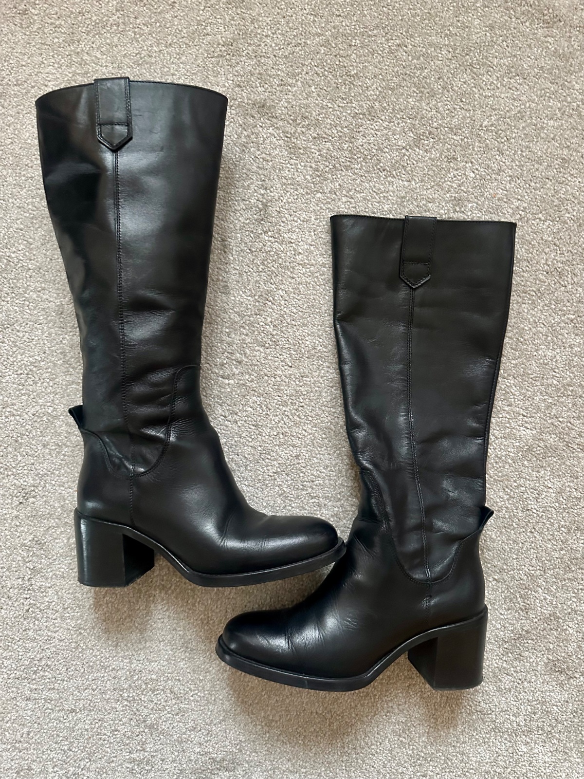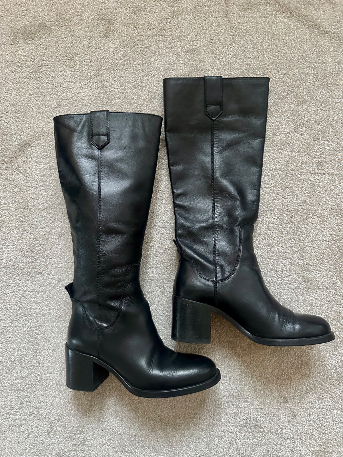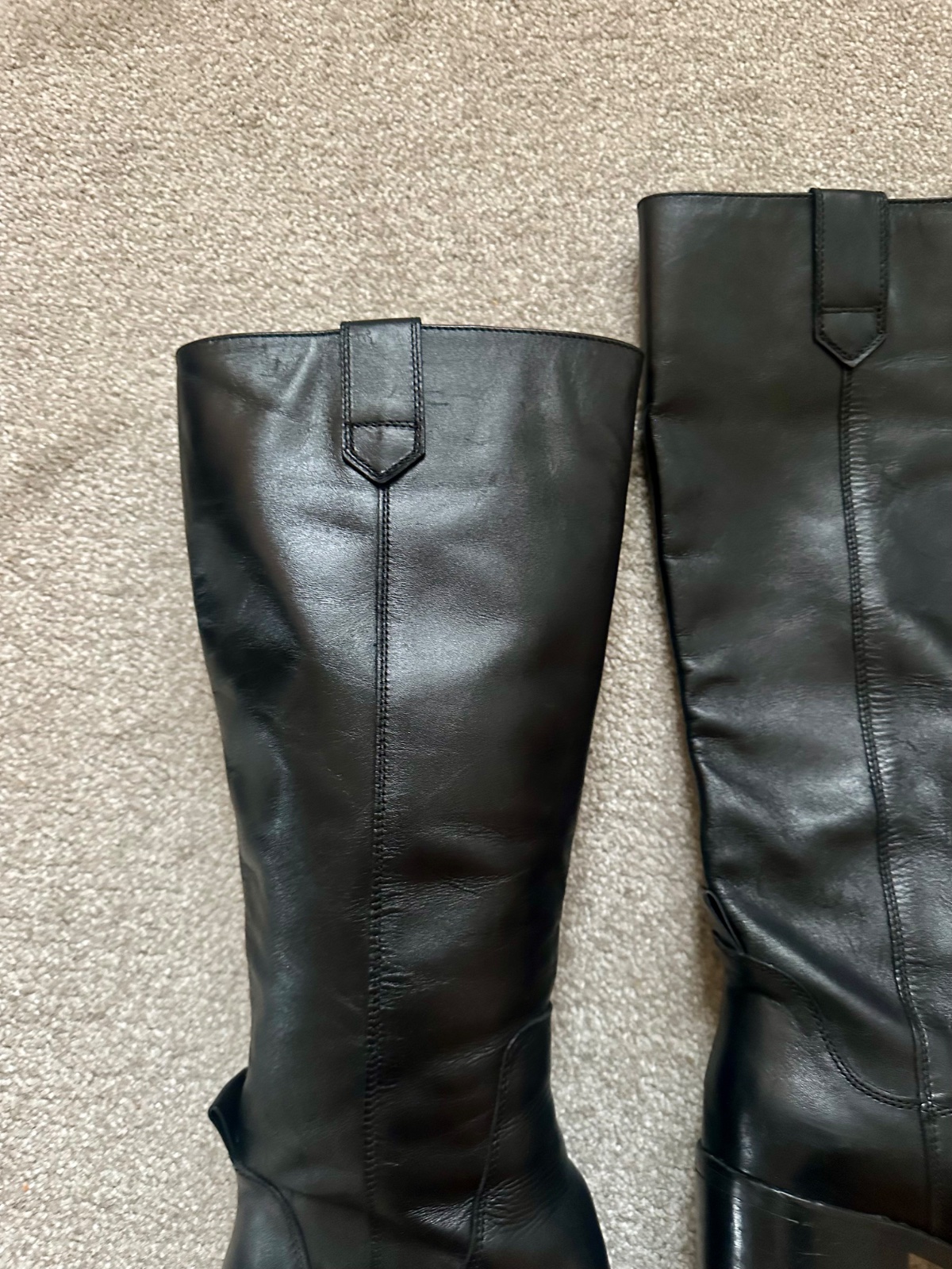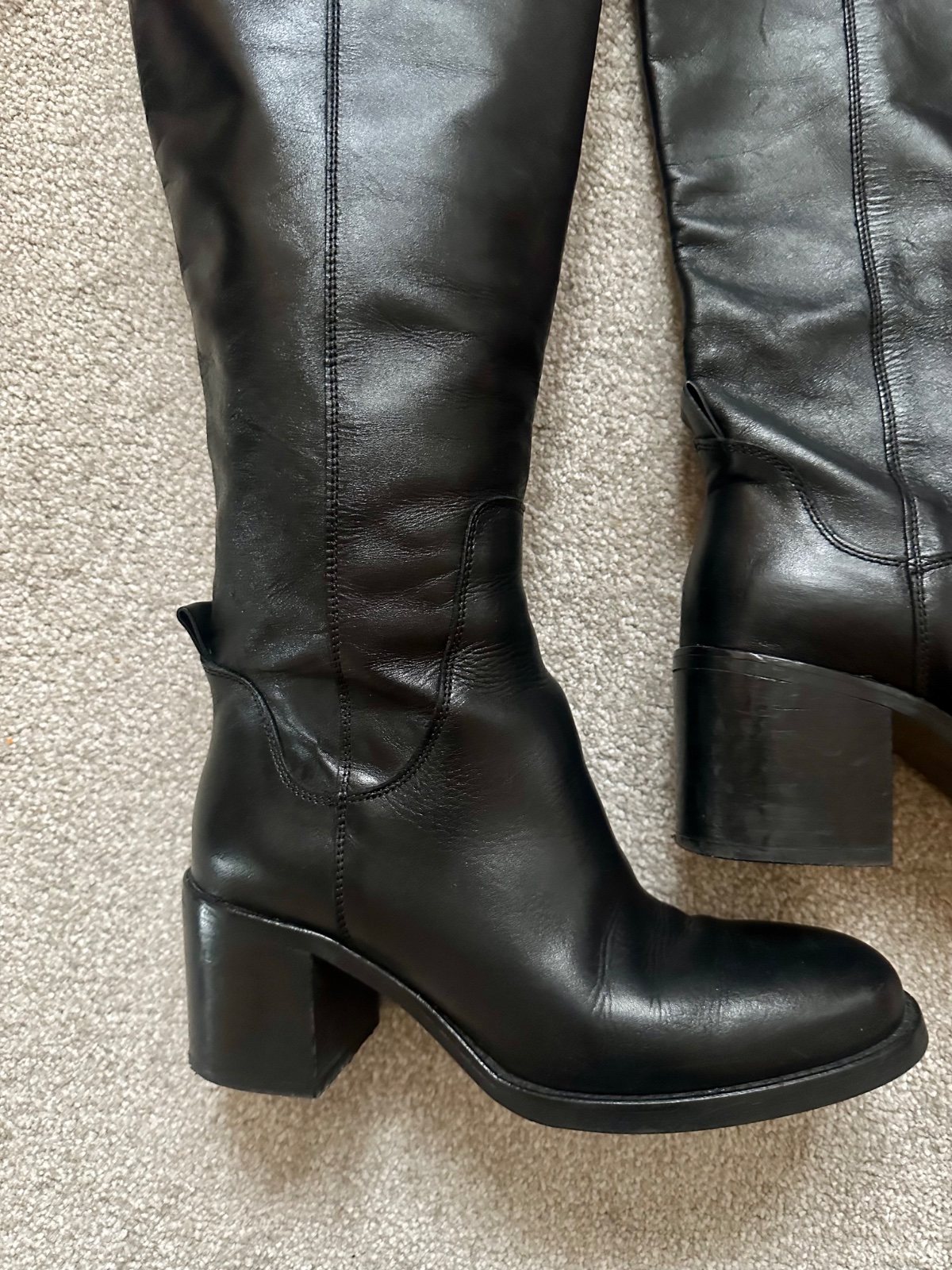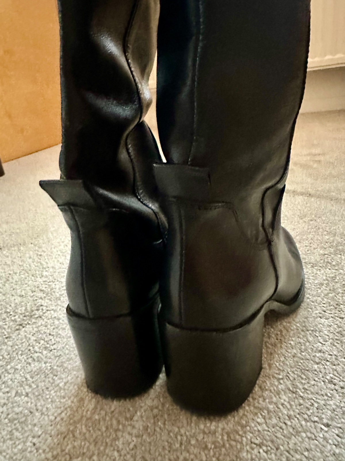 Sú vysoké, hneď pod koleno. Raz obuté. Veľmi kvalitná koža. Podpätok 3-4 CM, zamaskovaný pod model bez podpätku. Sú krásne,mne žiaľ po pôrode sú úzke. Pôvodná cena 130€
