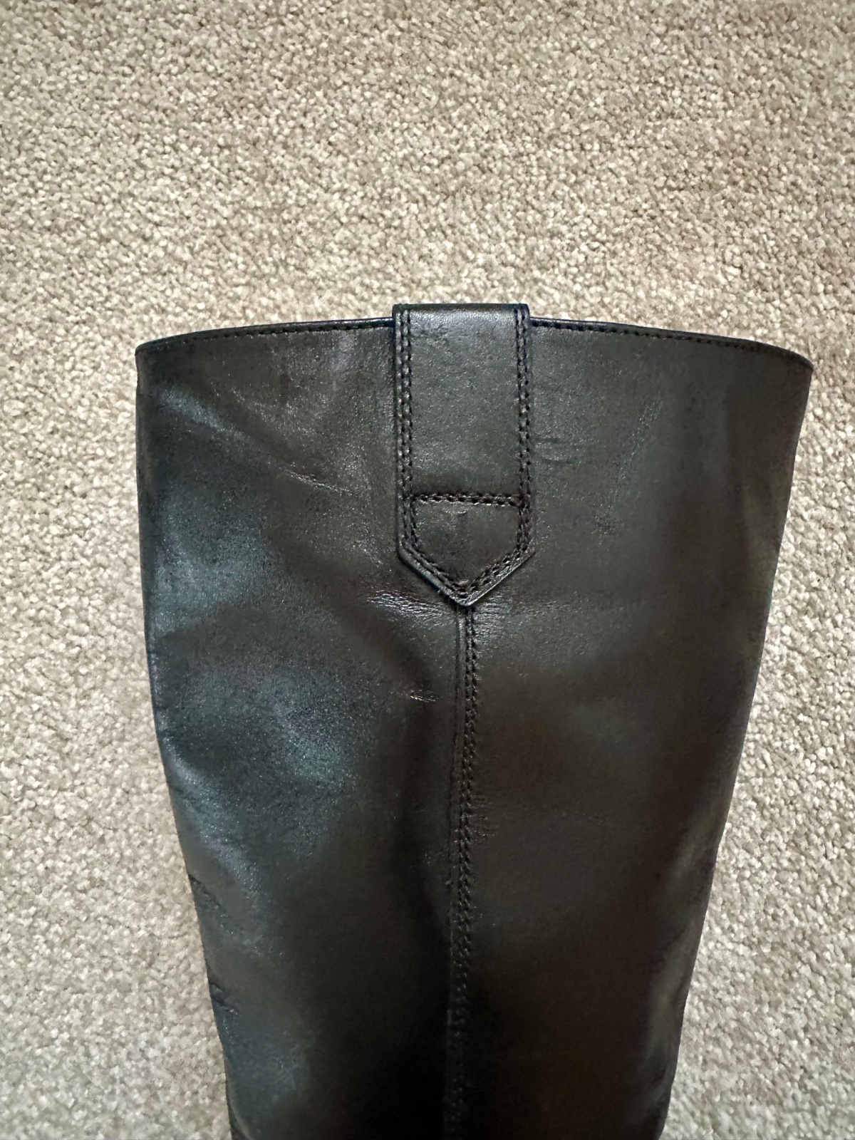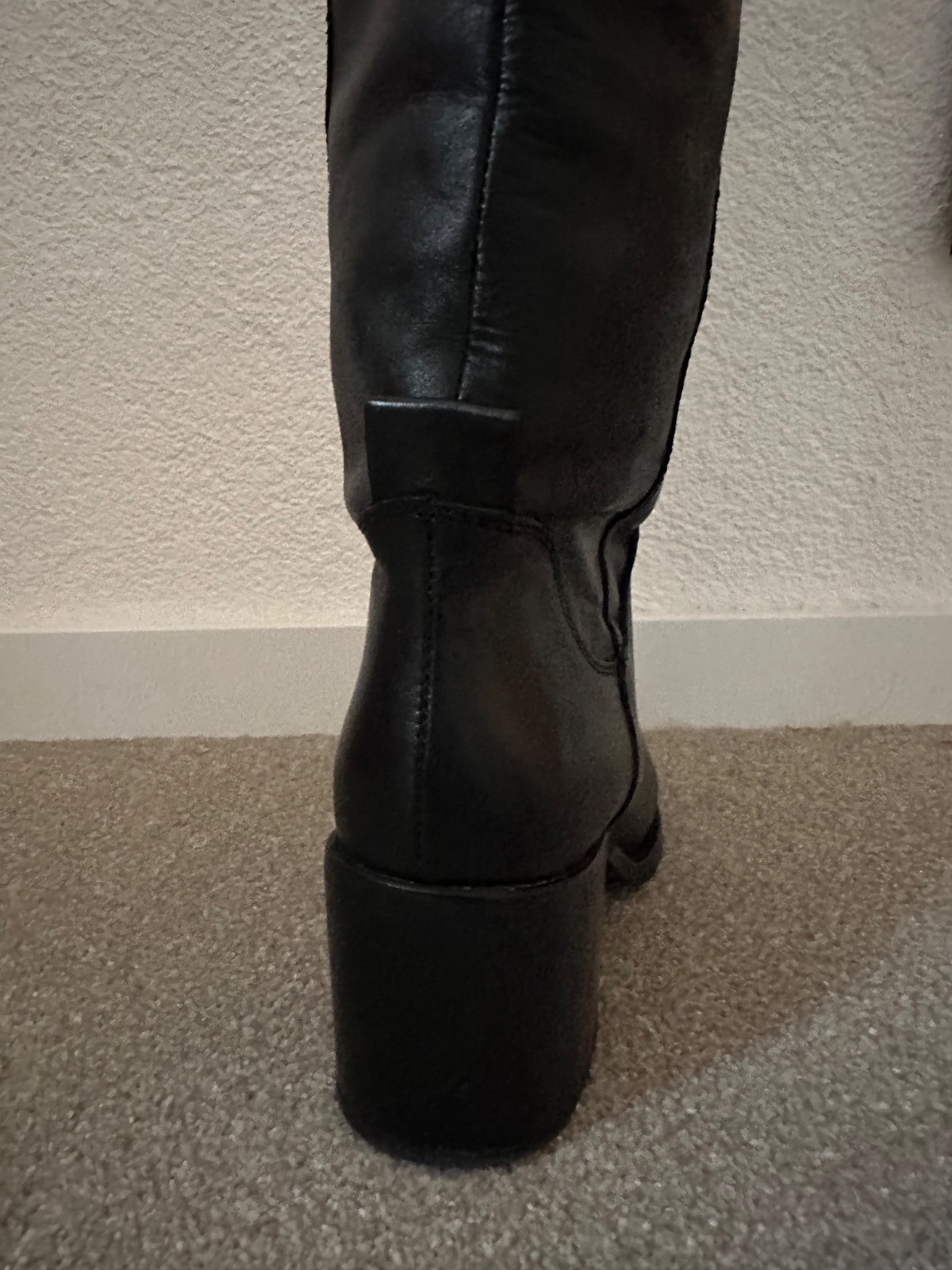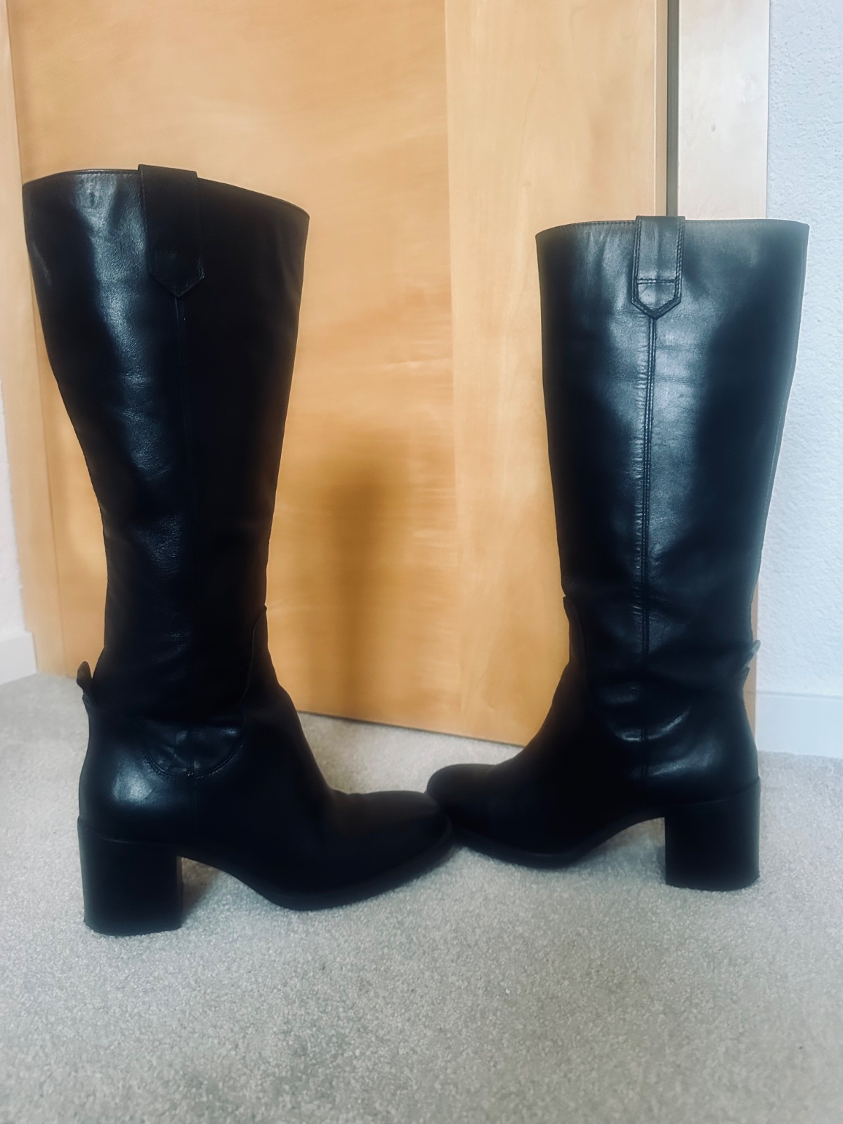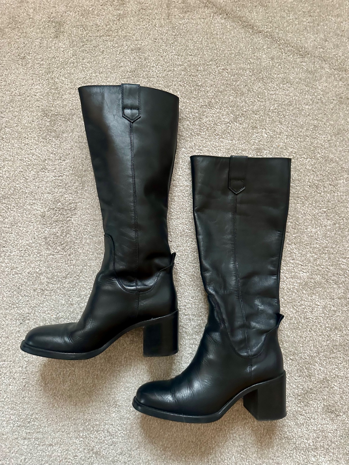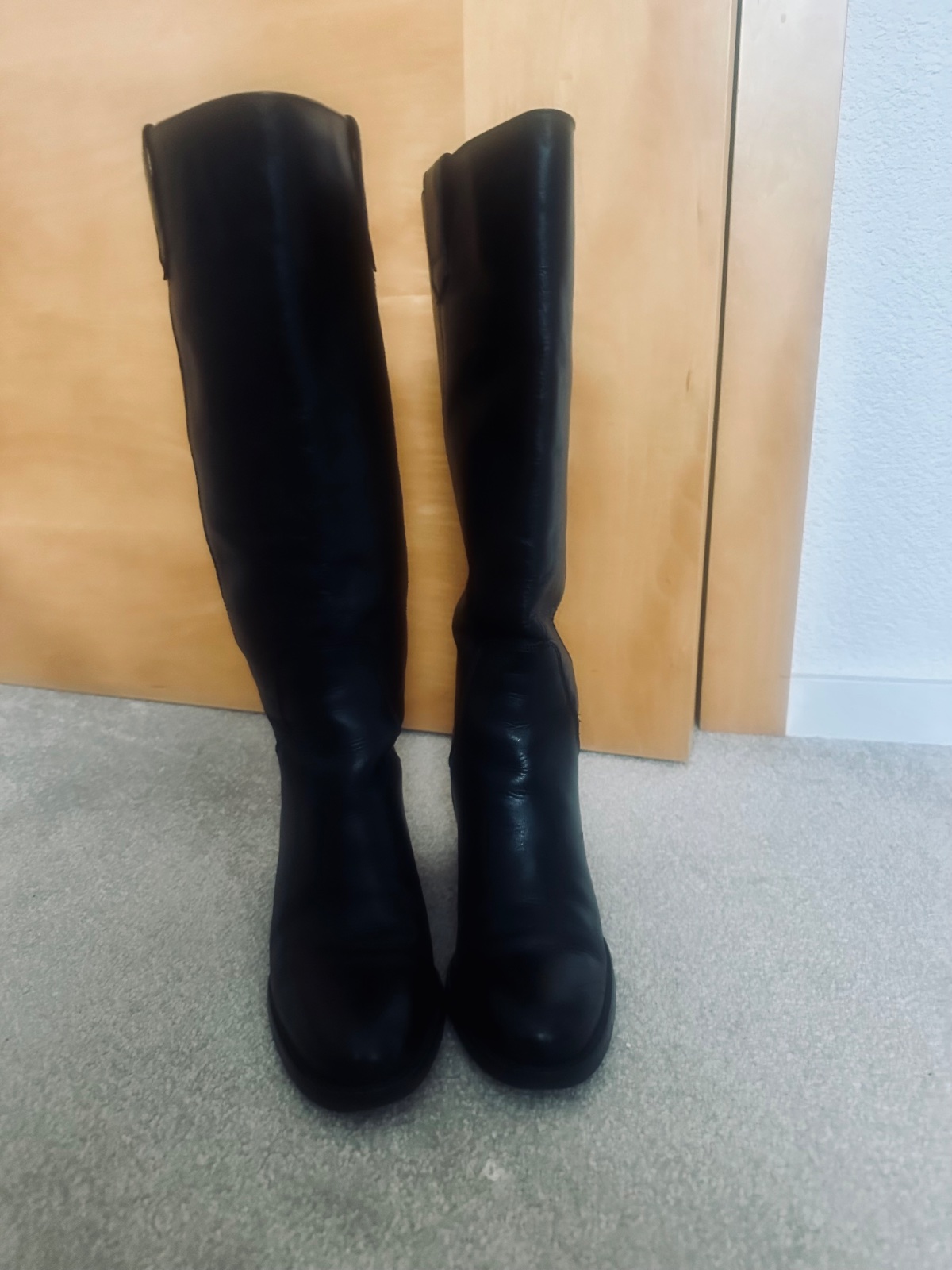 Sú vysoké, hneď pod koleno. Raz obuté. Veľmi kvalitná koža. Podpätok 3-4 CM, zamaskovaný pod model bez podpätku. Sú krásne,mne žiaľ po pôrode sú úzke. Pôvodná cena 130€