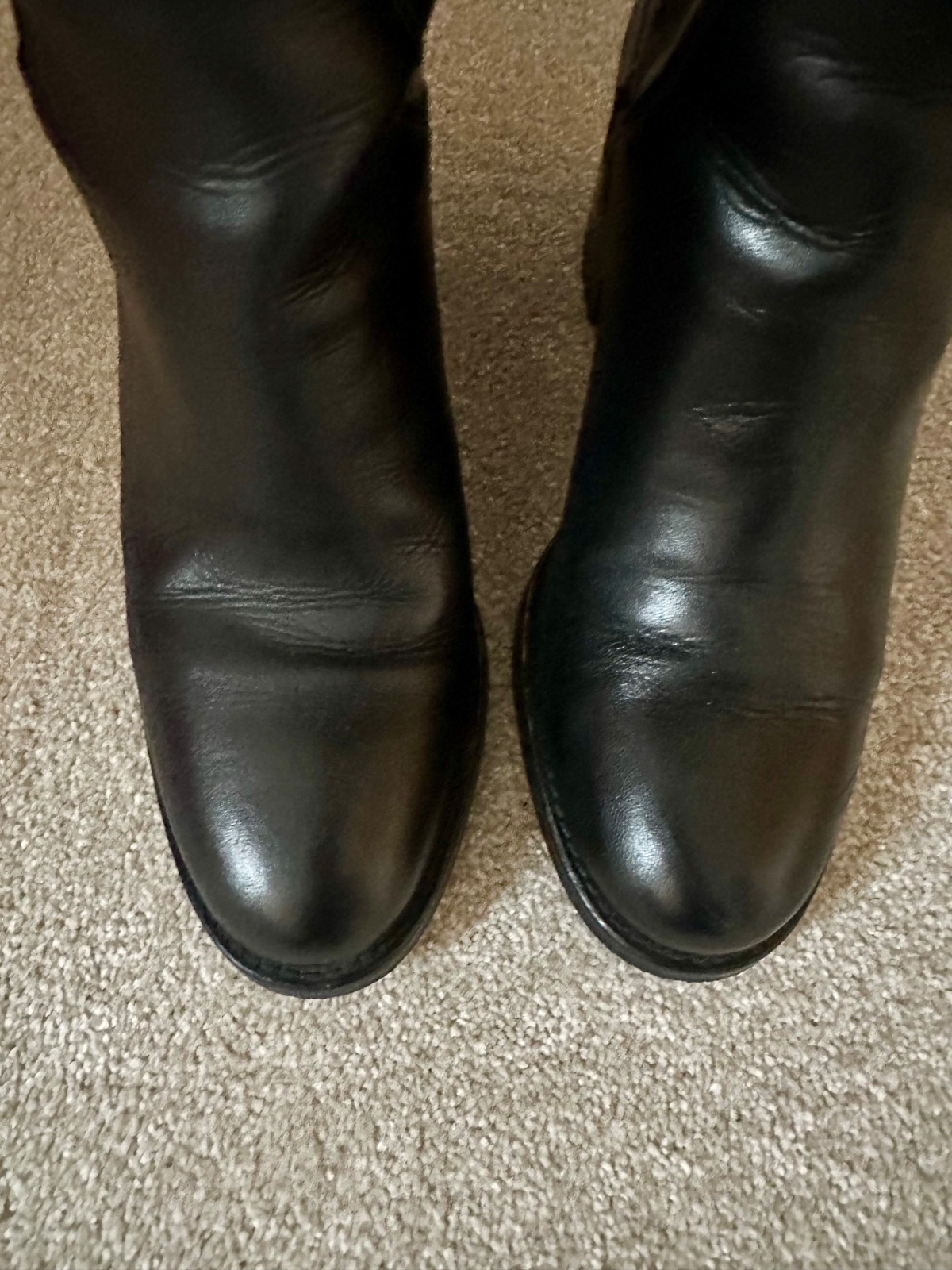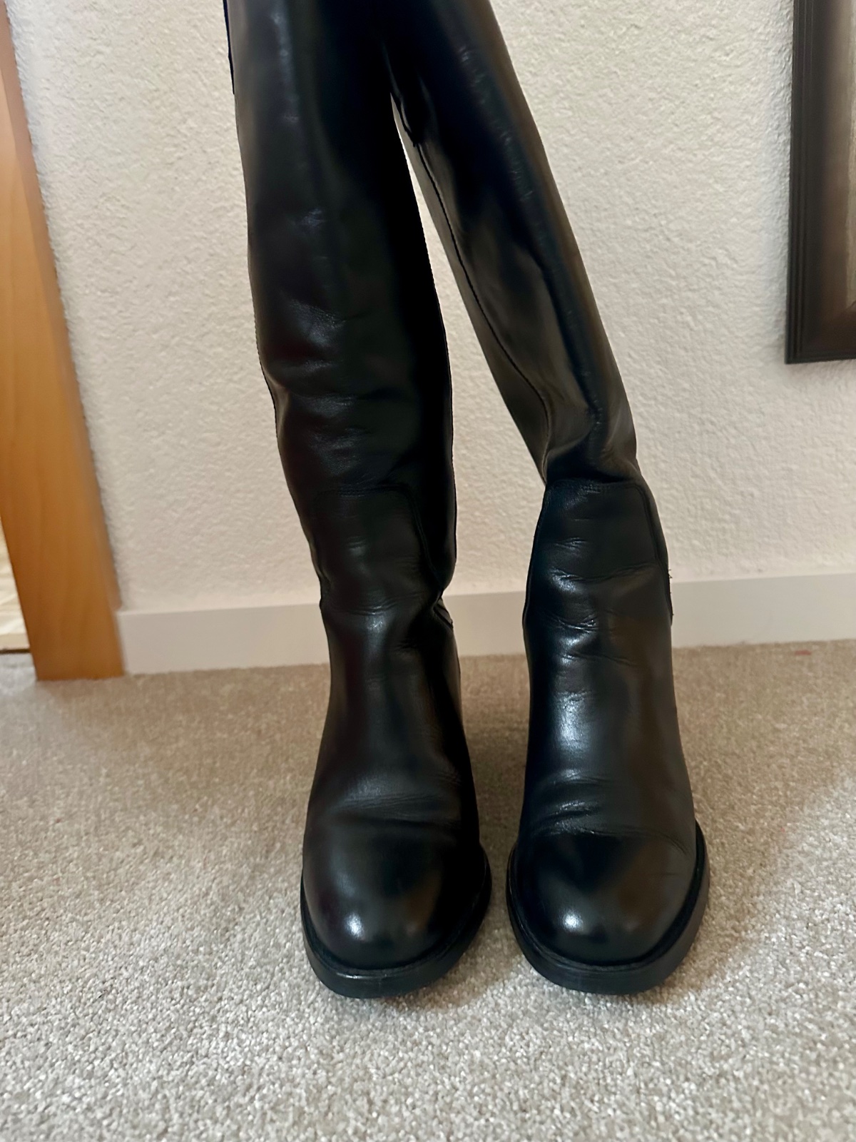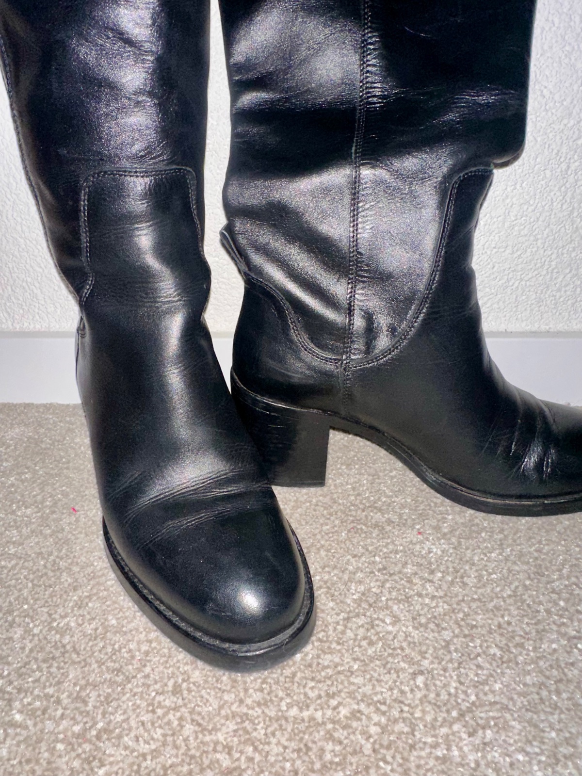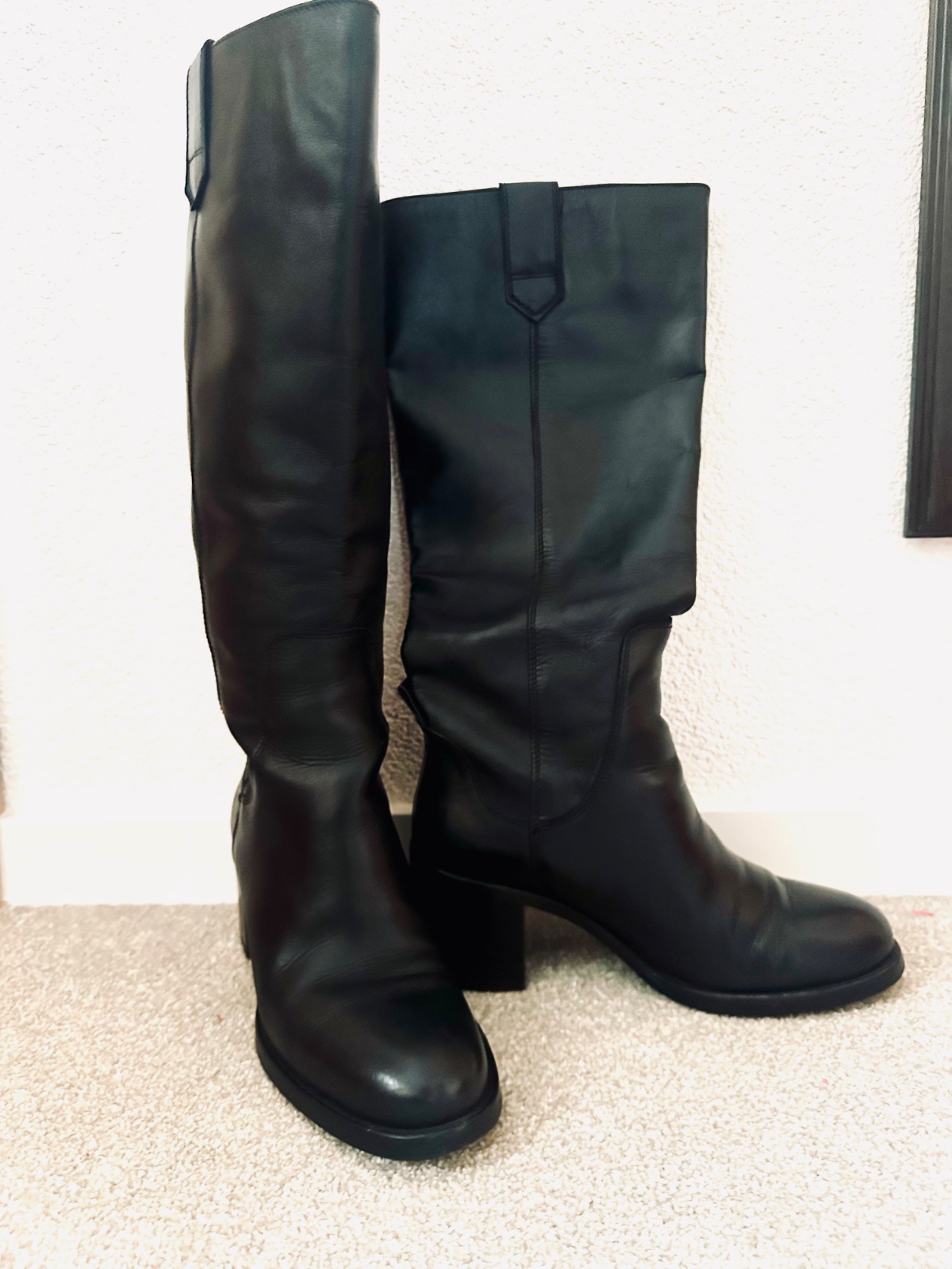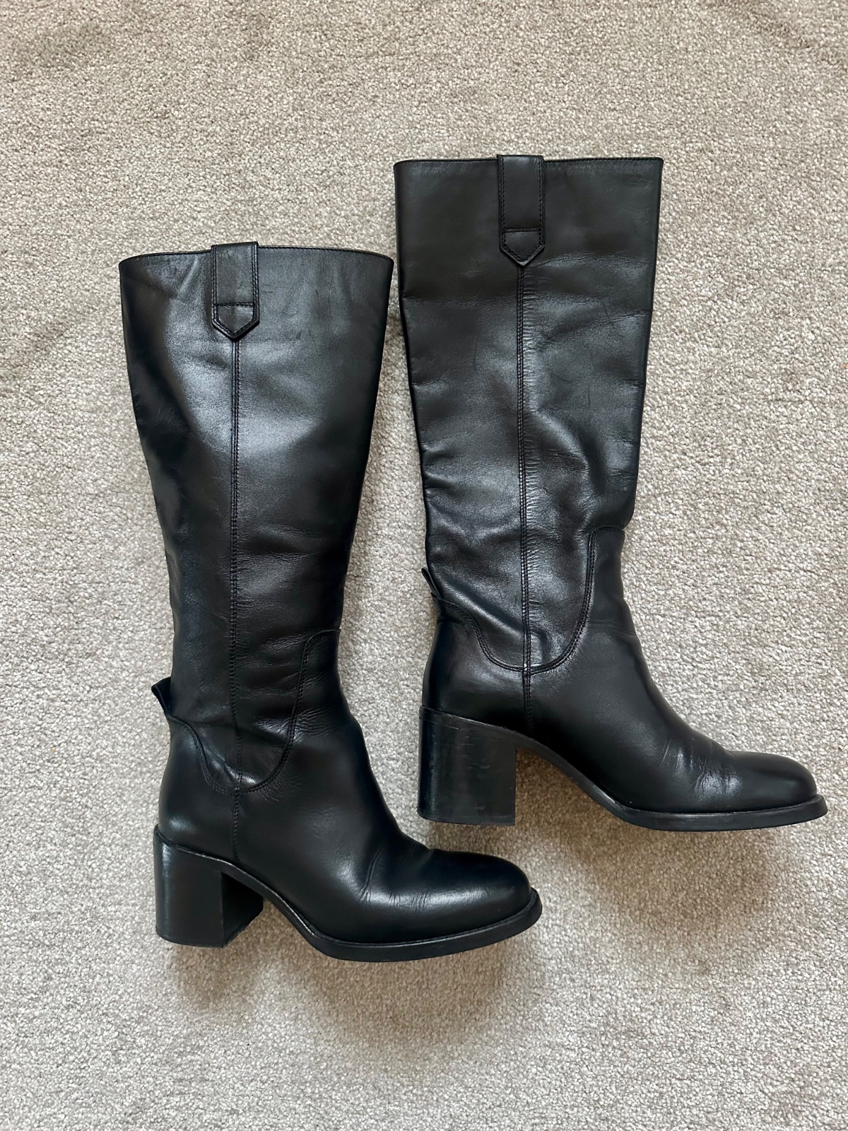 Sú vysoké, hneď pod koleno. Raz obuté. Veľmi kvalitná koža. Podpätok 3-4 CM, zamaskovaný pod model bez podpätku. Sú krásne,mne žiaľ po pôrode sú úzke. Pôvodná cena 130€