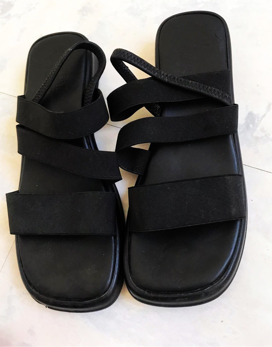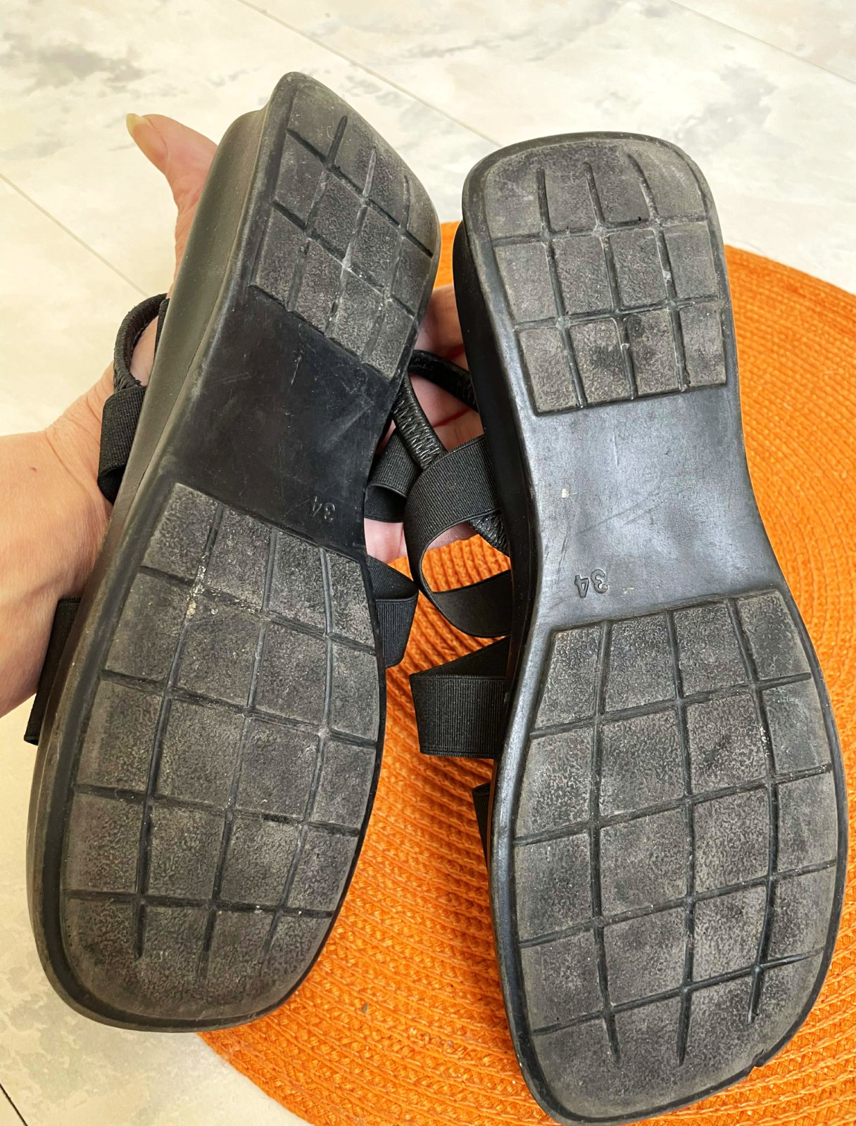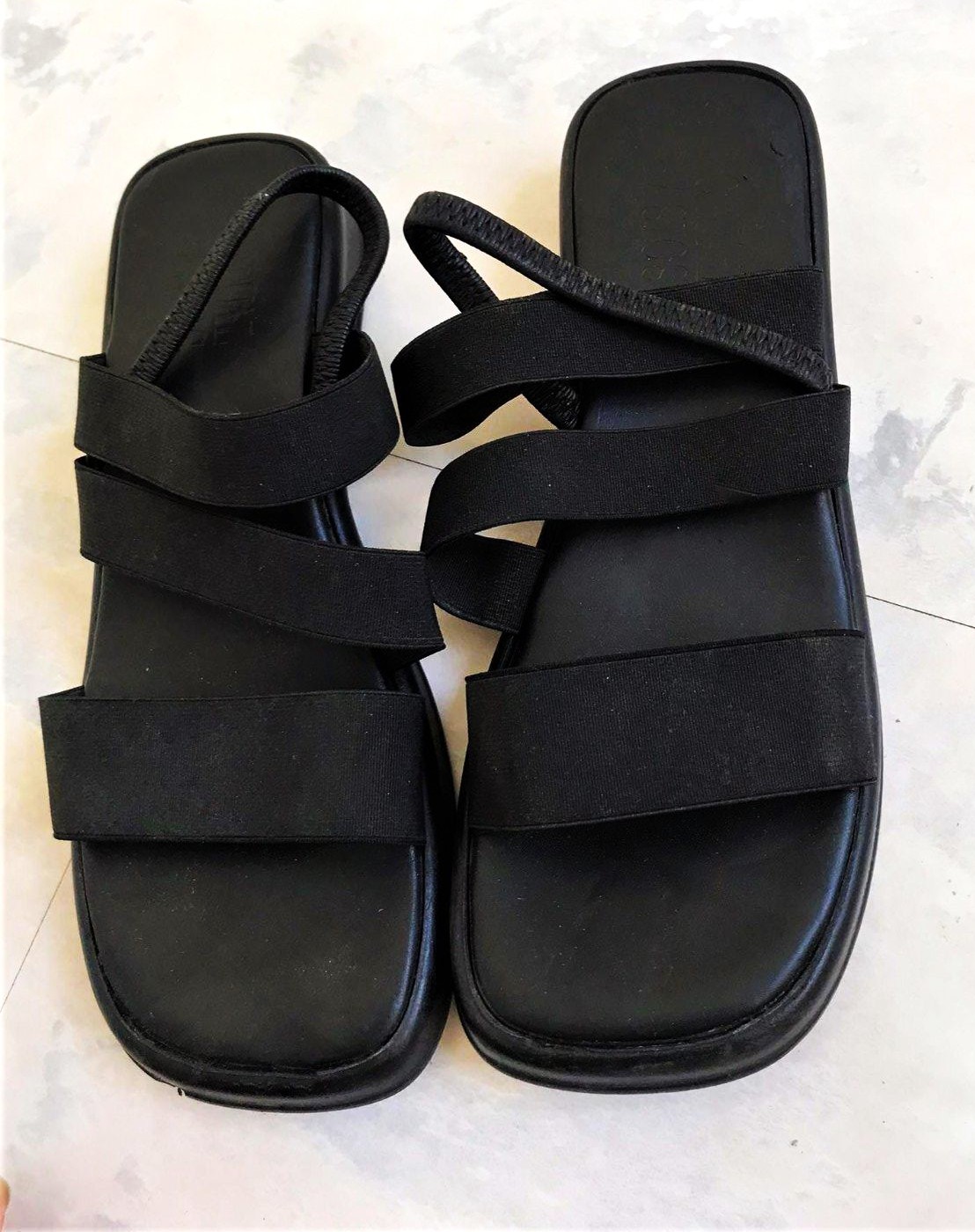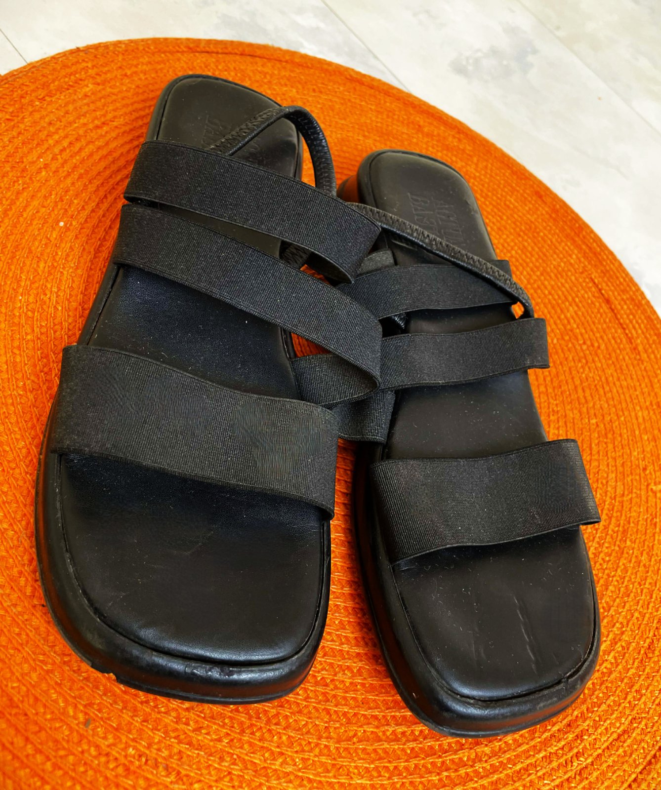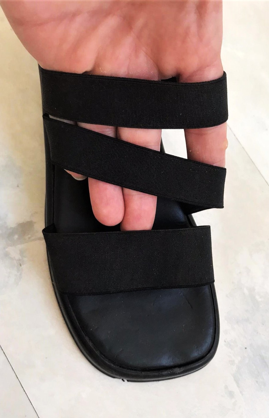 min.nosené sandálky na gumičky,pevne držia nohu,remienky sú z pružných sýtočiernych gumičiek,vn. dlžka = 21,8 cm,na jednej je na spodku jemne akoby odštiepené,ale pri nosení to nie je vidno,ale upozorňujem - viď posl. fotka