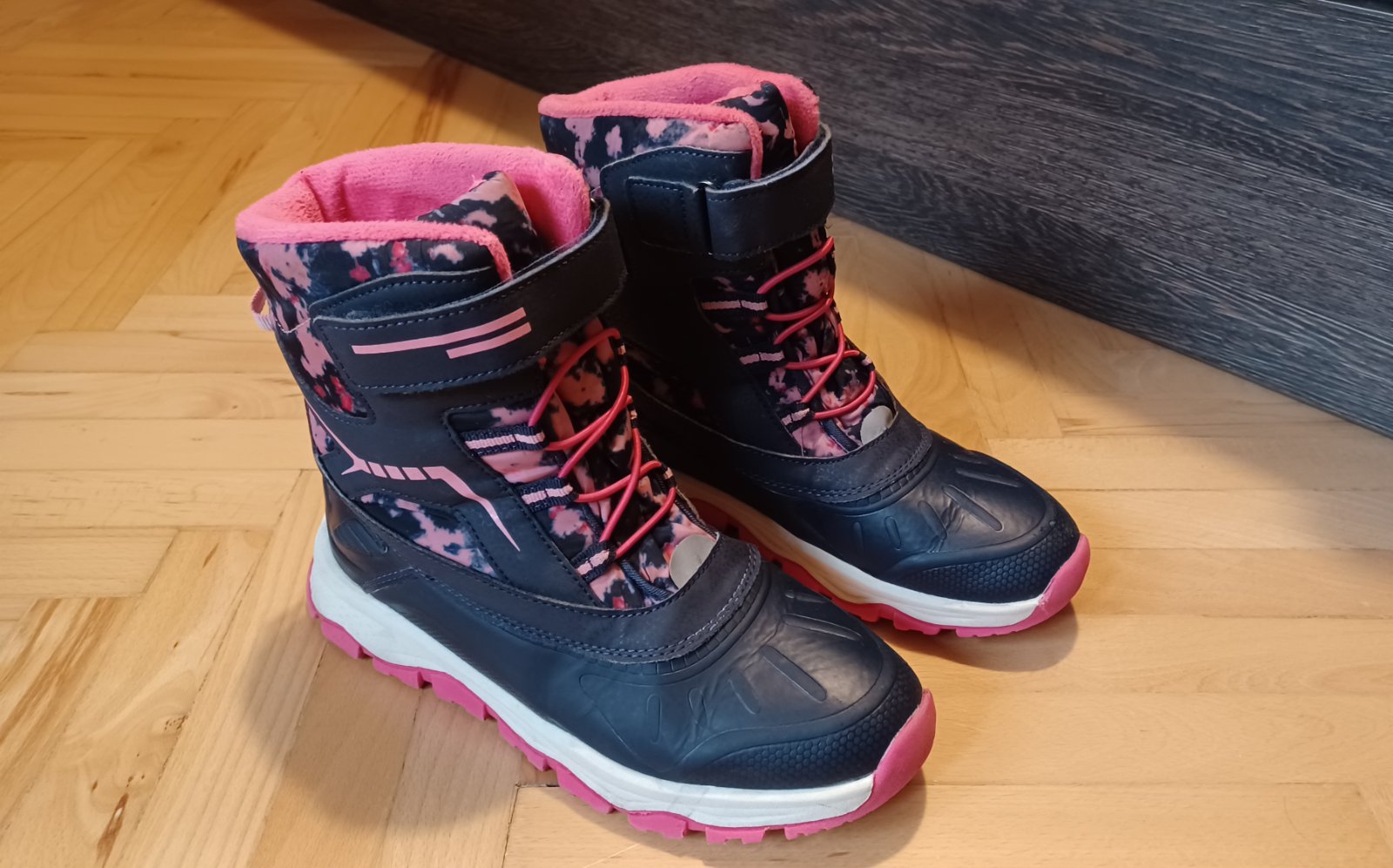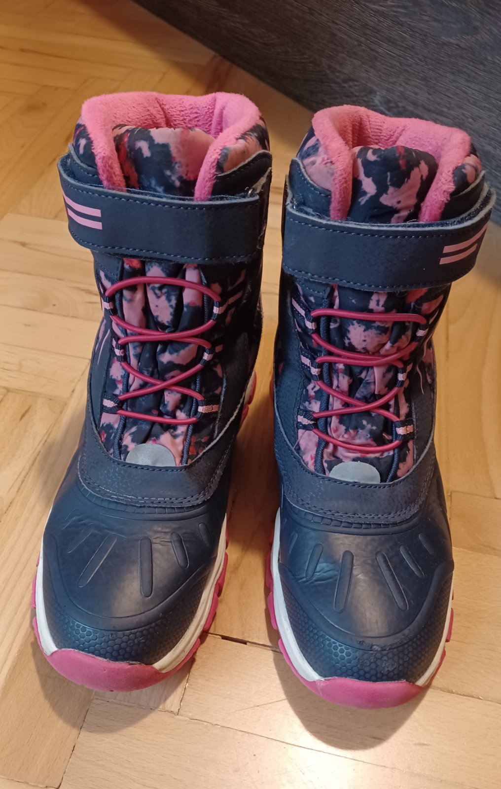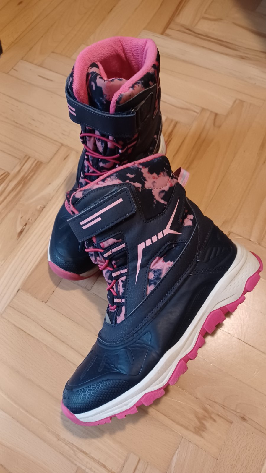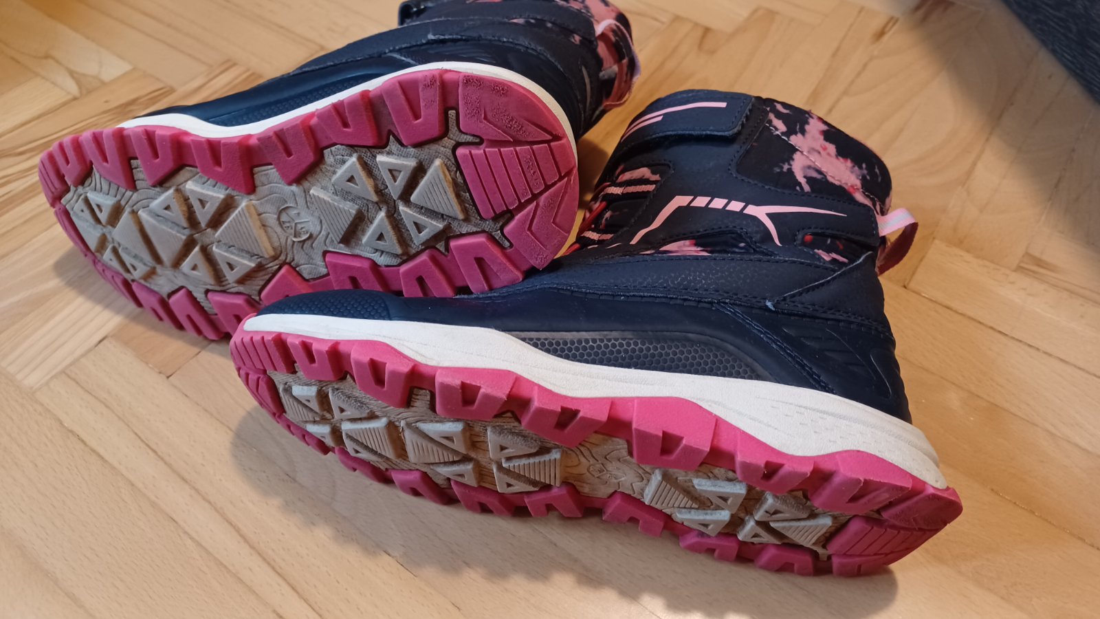 Nosené, stále pekné, suché zipsy držia dobre. Nosené asi mesiac, napriek tomu na ľavej trochu šuchnutá špička, cena prispôsobená. Vložka sa dá vybrať, meria 24,5 cm.