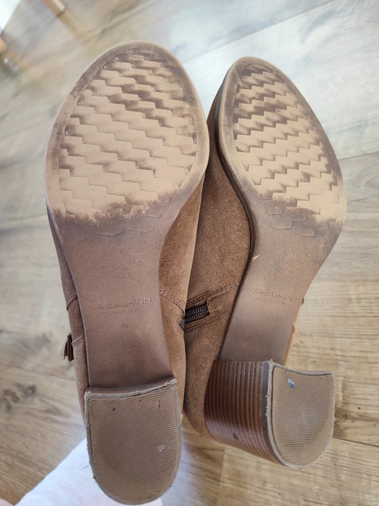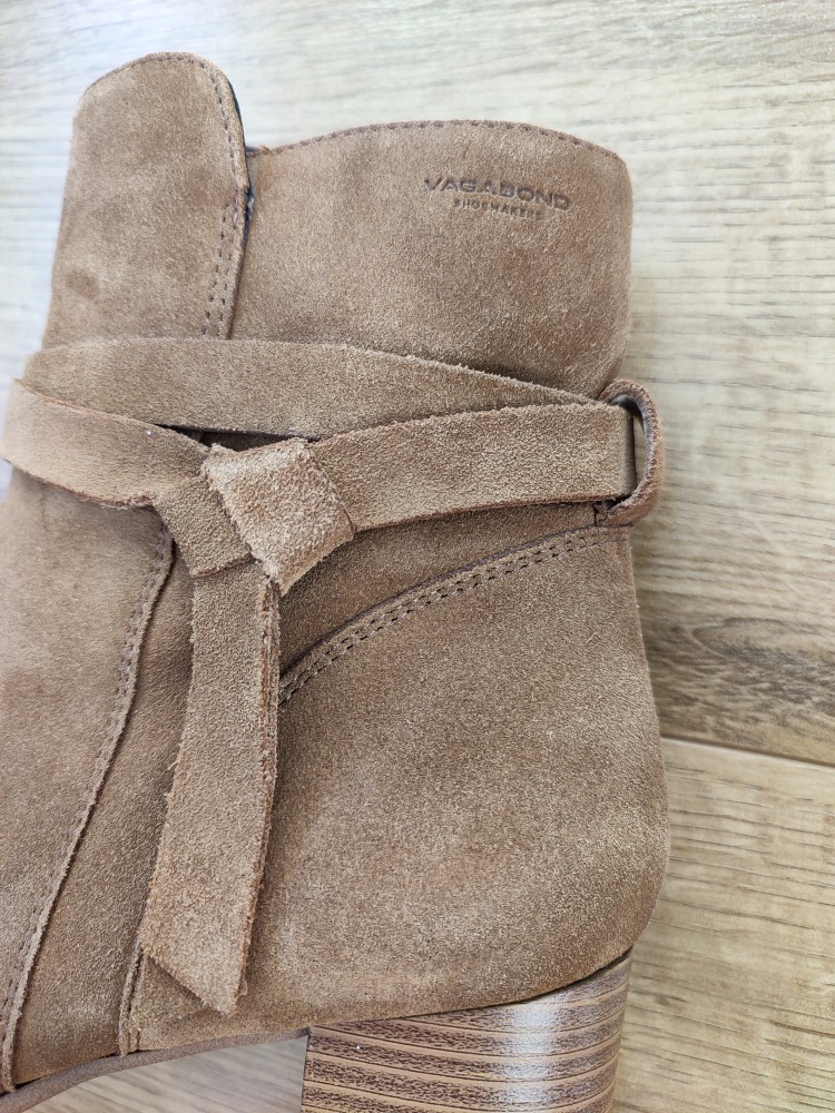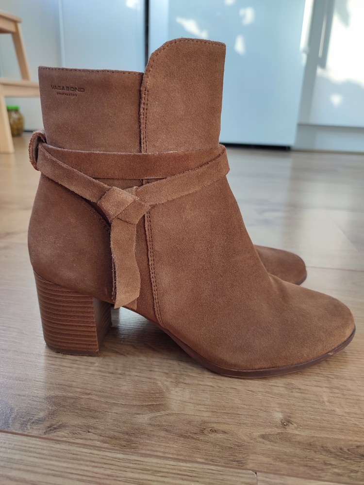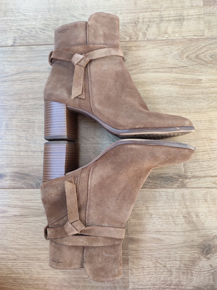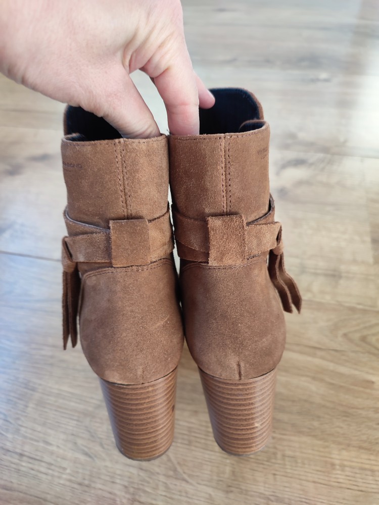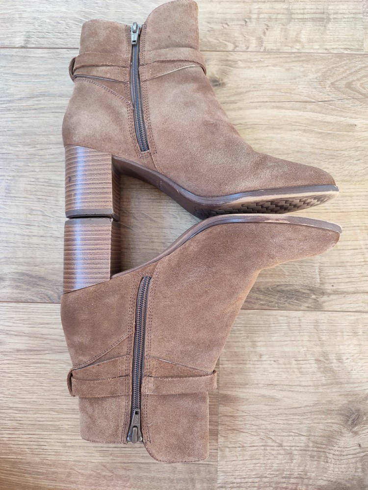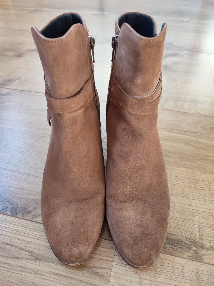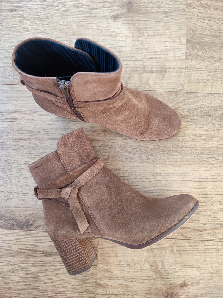 členkové čižmy z jemnej brúsenej kože, kvalitná značka. farba stredná hnedá, škoricová. pohodlná výška opätku. nosené príležitostne, v super stave. veľkosť sedí.