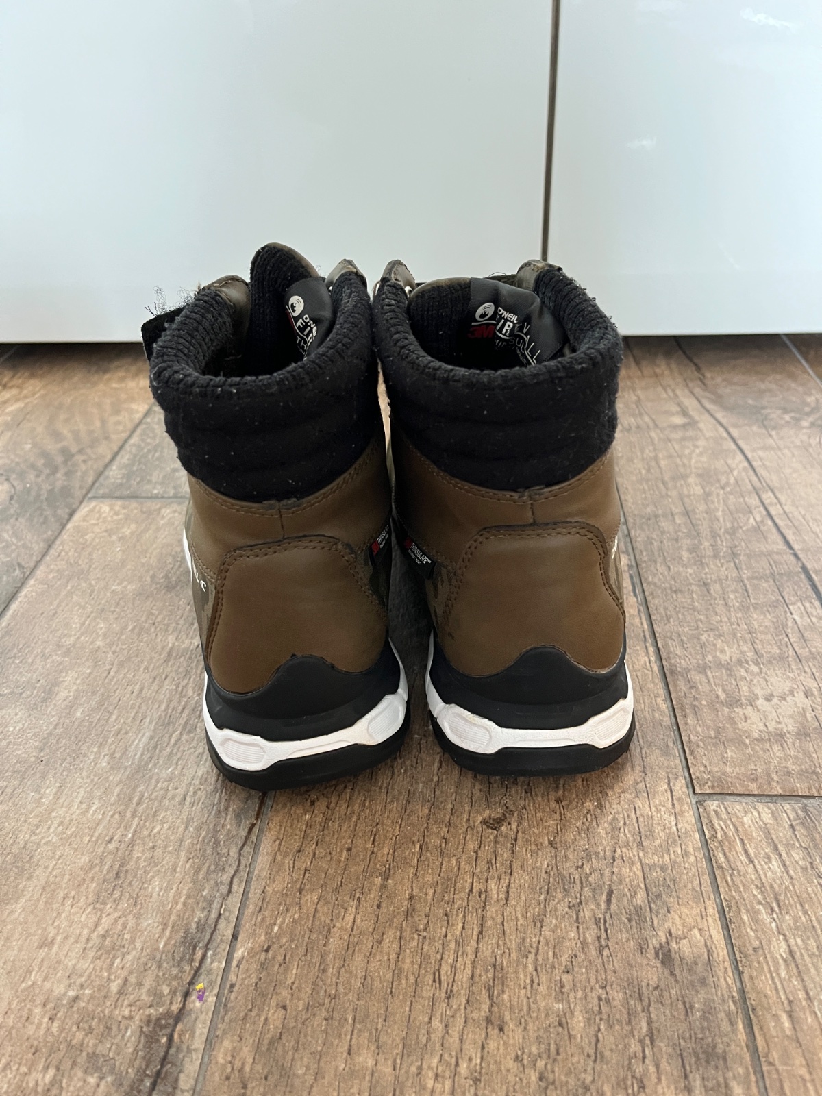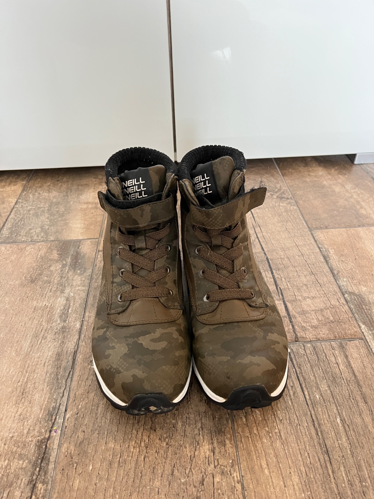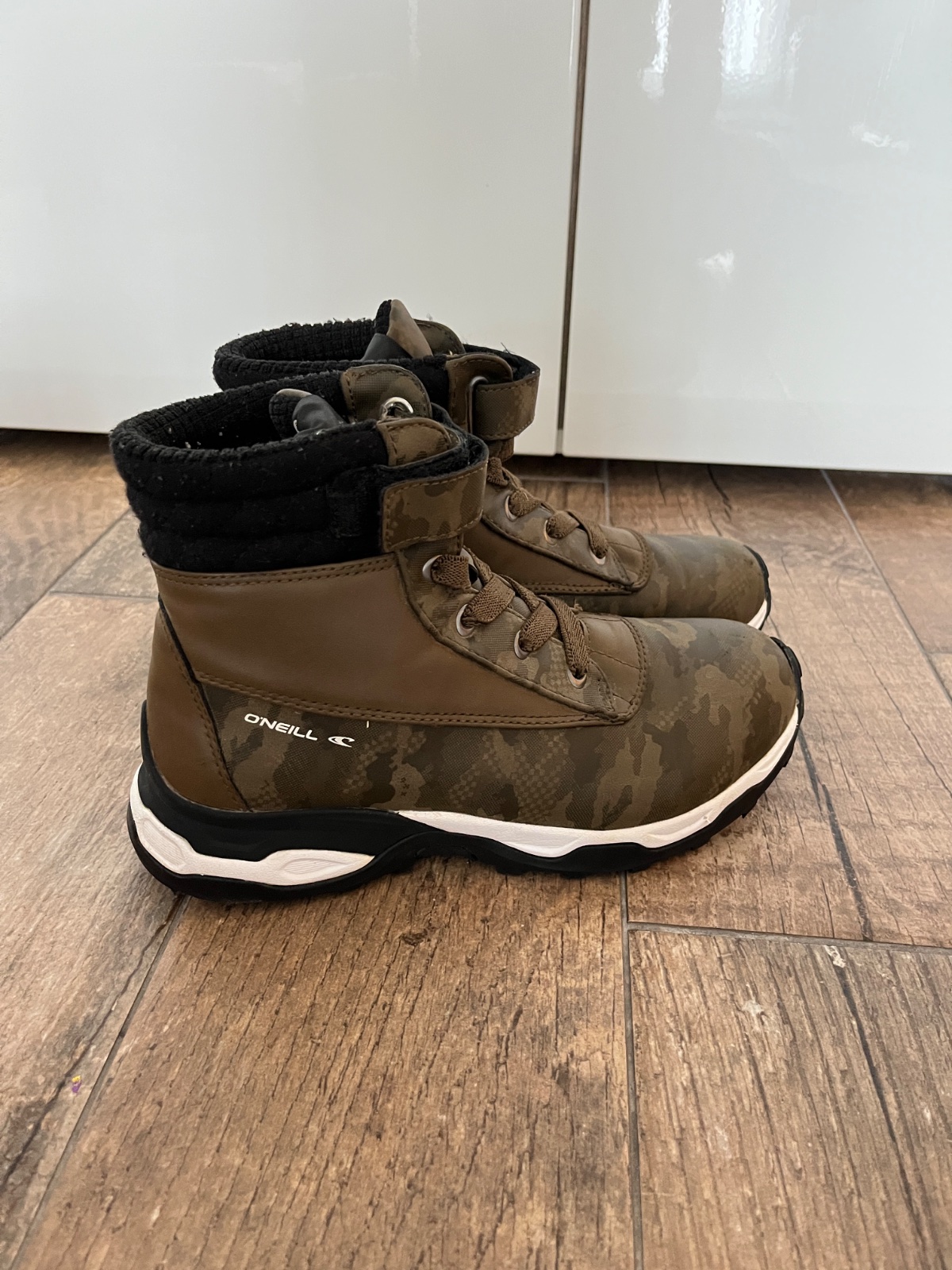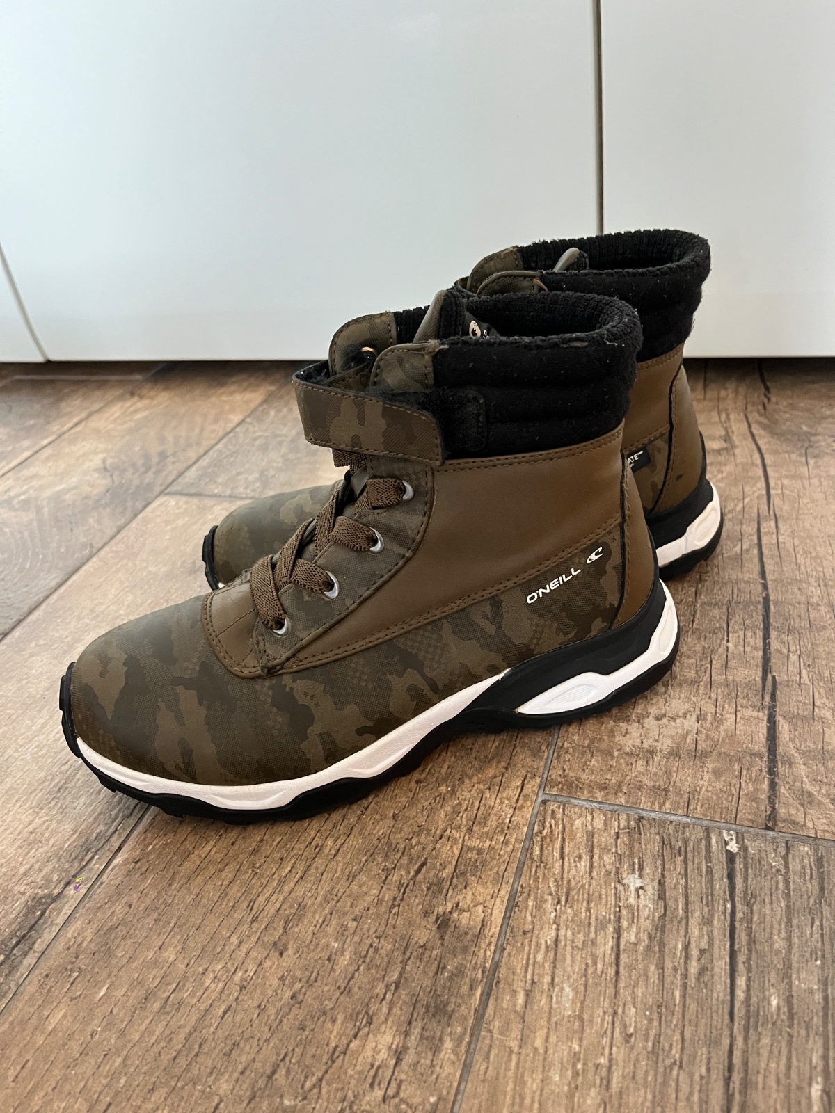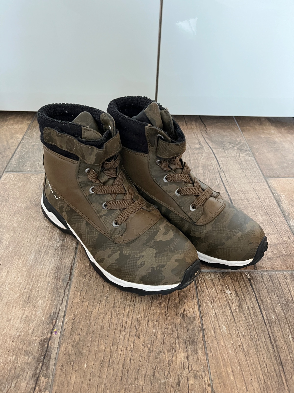 Malo nosene s výbornou pevnou protišmykovou podrážkou. Veľmi dobrý stav. Zateplené vnútro -ideálne na jeseň zimu. Zapínanie na suchý zips. Moderný army khaki dizajn