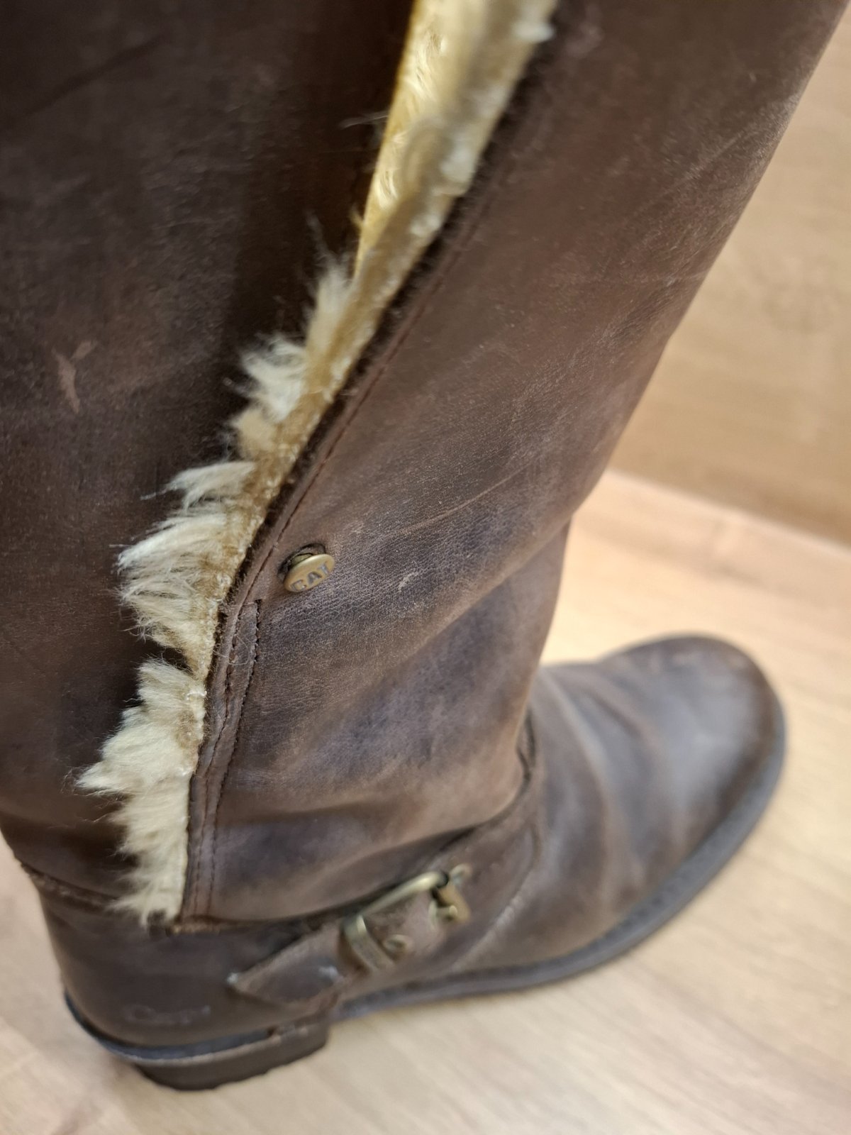 Moje vysnívané kožené čižmy kúpené v UK, nosené len zopár krát lebo sme si nesadli, priúzke na moje chodidlá. Takže sa ich radšej vzdávam, aby na ne nesadal prach. Žiadne škrabance no na pravej čižme je uvoĺnený cvok, čo je opraviteľné.