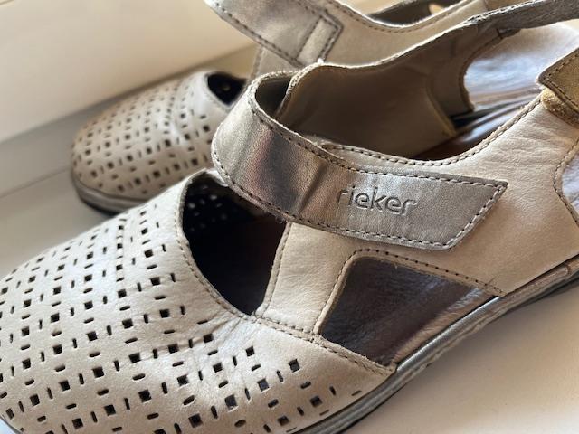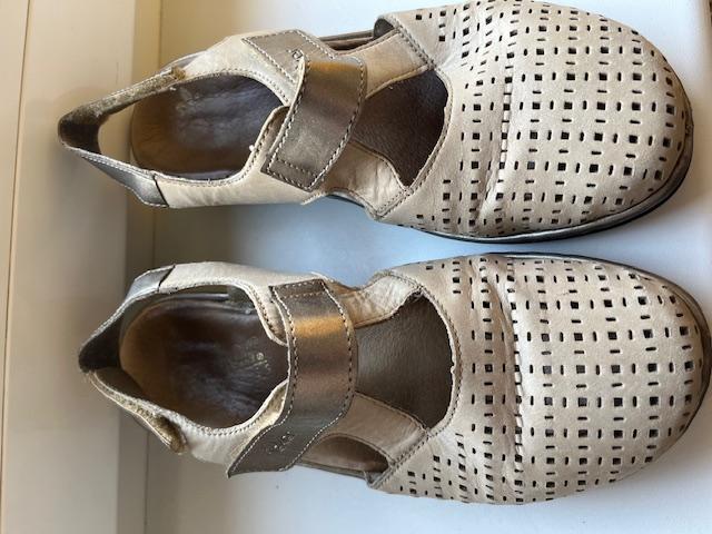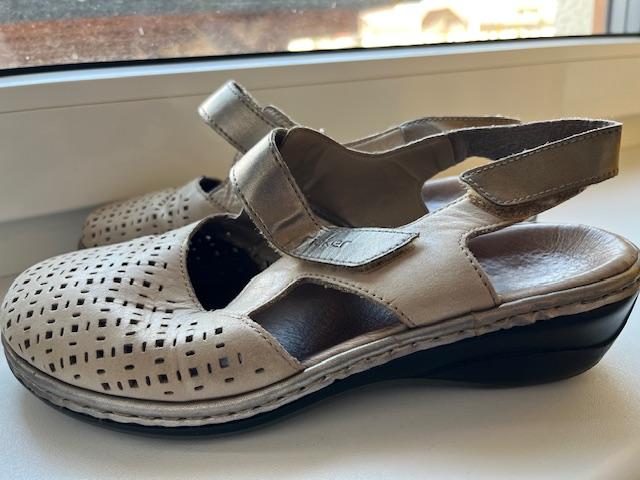 Pohodlné sandálky na platforme, výška platformy vpredu 1 cm, pod pätou -výška platformy 4 cm. Dl 23 cm. Nosené, ale dobrý stav. Zapínanie na lepáky aj vpredu, aj vzadu.