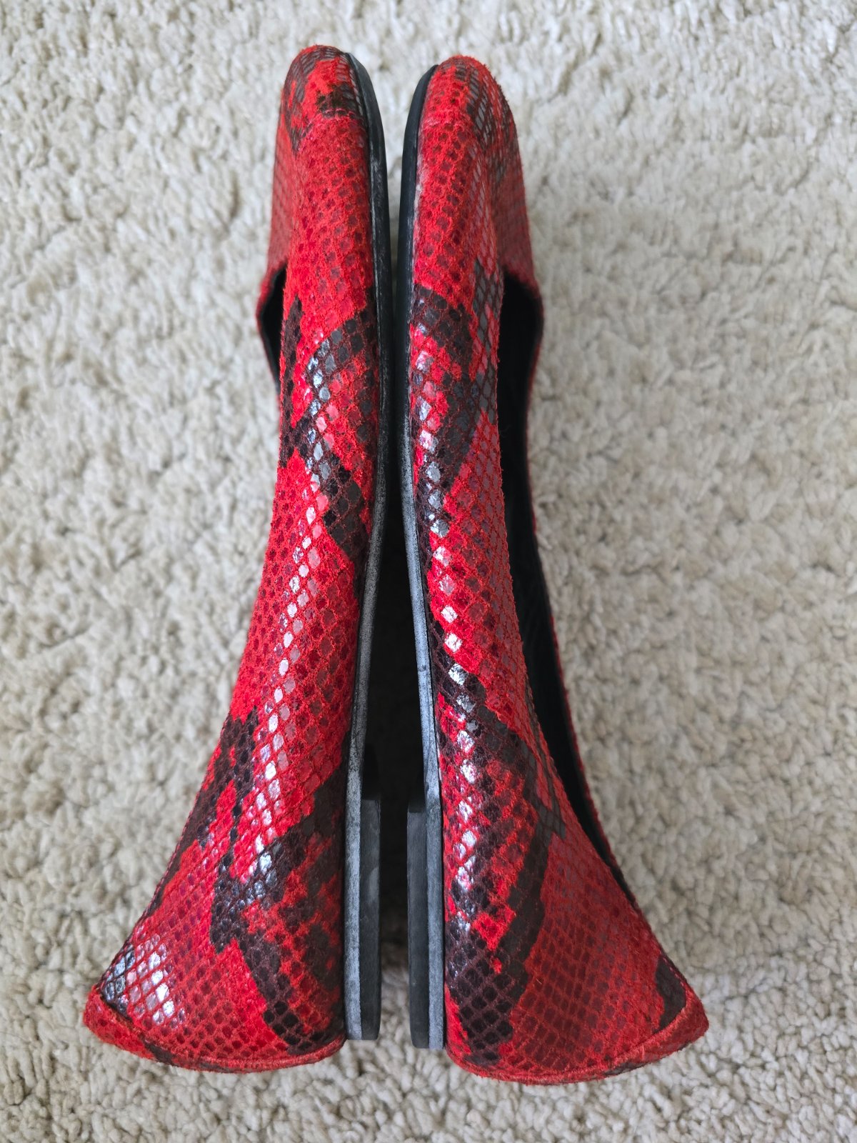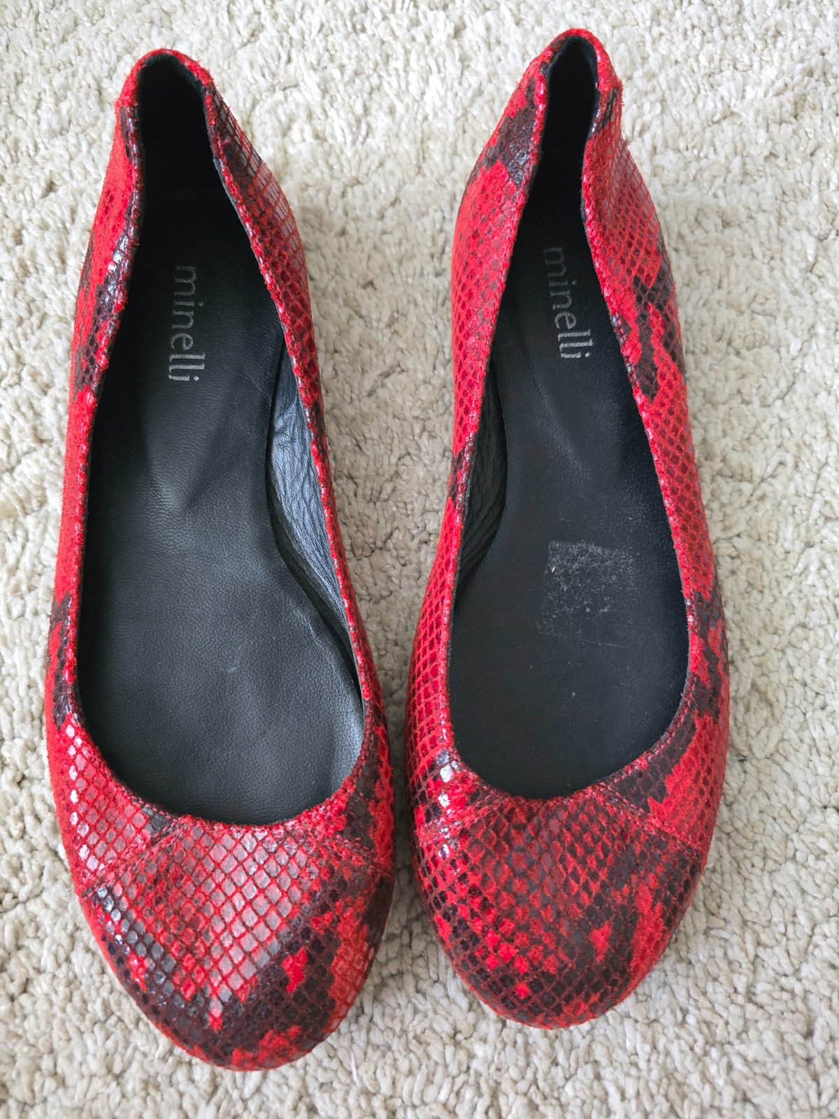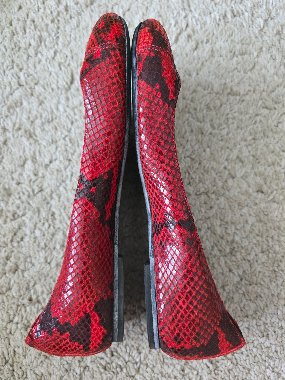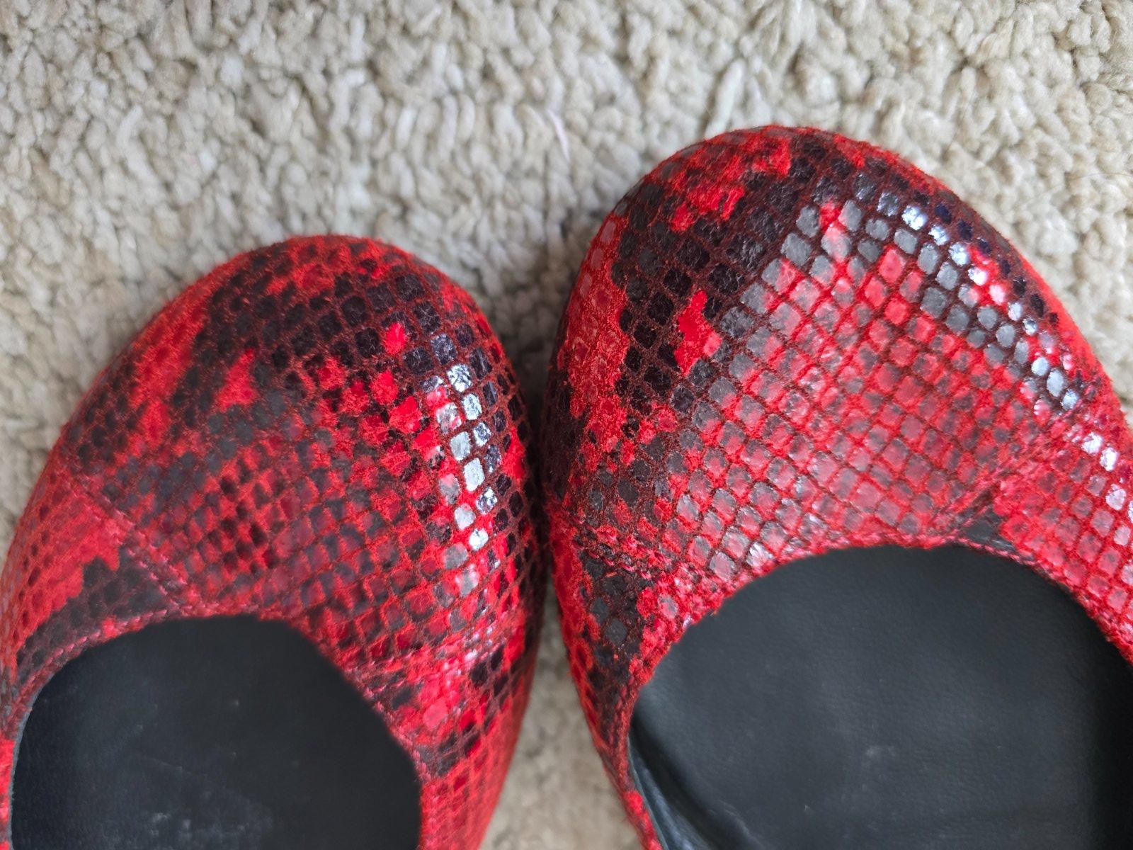 Celokožené červené baleríny na úzke chodidlo. Obuté maximálne trikrát na krátkej prechádzke. Veľmi sa mi páčili, ale moja nôžka nieje dostatočne úzka, tak som to vzdala. Budem rada, ak sa využijú.