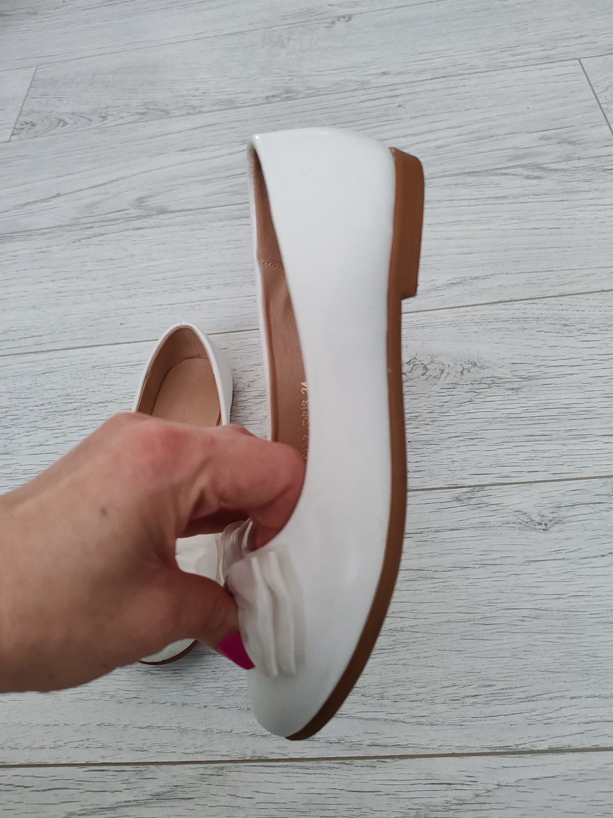 Predám balerínky bielej farby. Nosené vo veľmi dobrom stave. Vnútorná dĺžka je 21cm. Na ľavej topánke je malé poškodenie-viď foto.