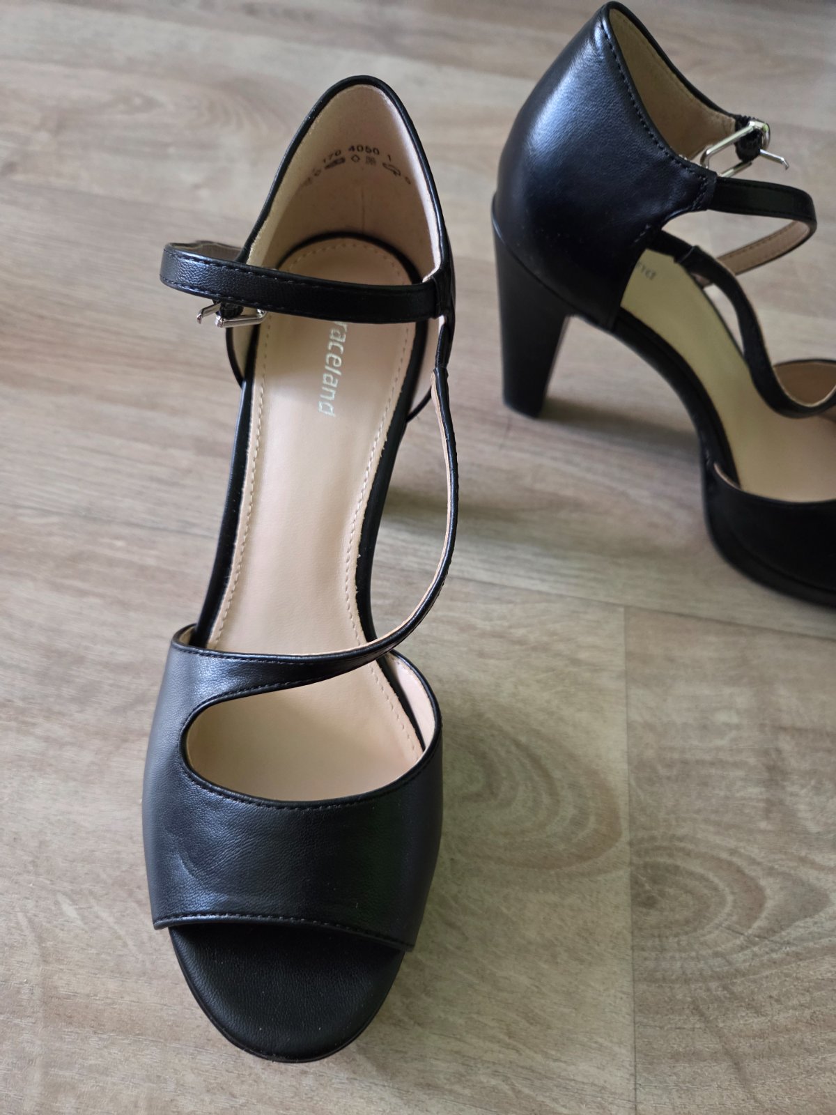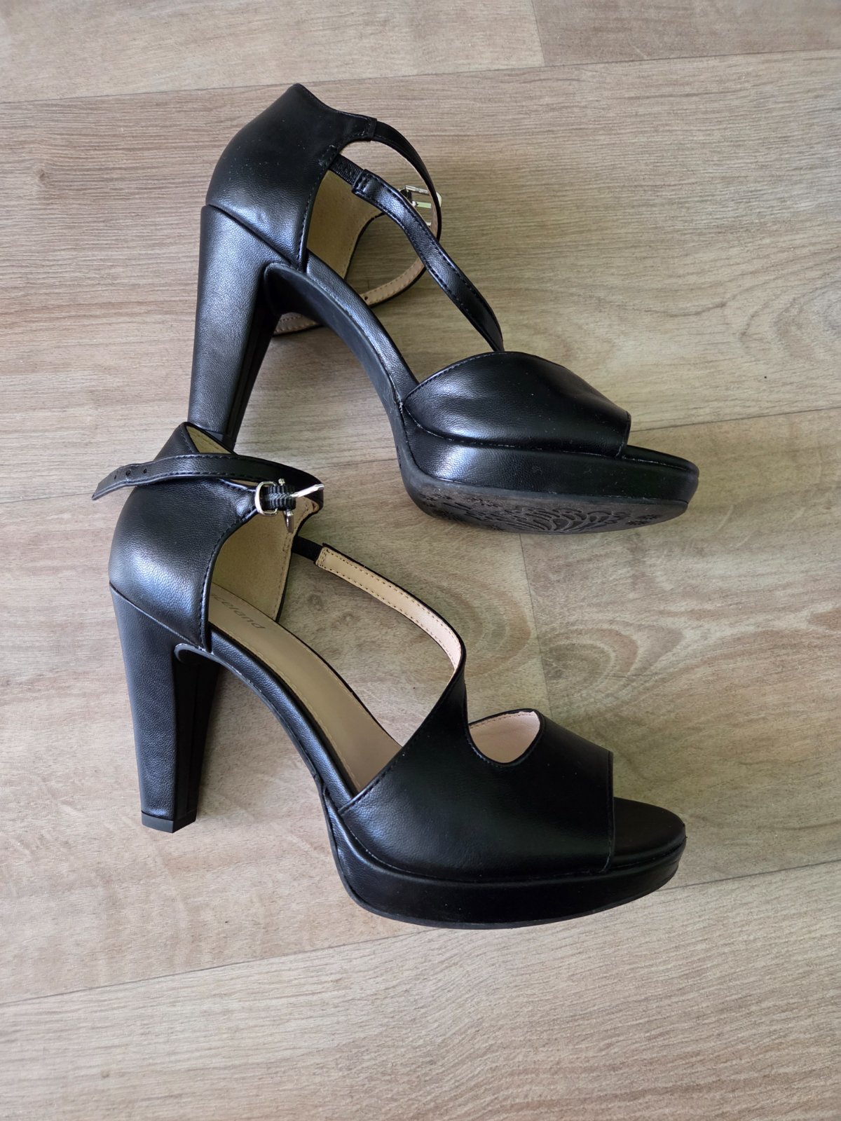 obuté 1 x, bez poškodenia, čierne, vnútorná dĺžka 24,5 cm veľkostne zodpovedajú výška podpätku 11 cm