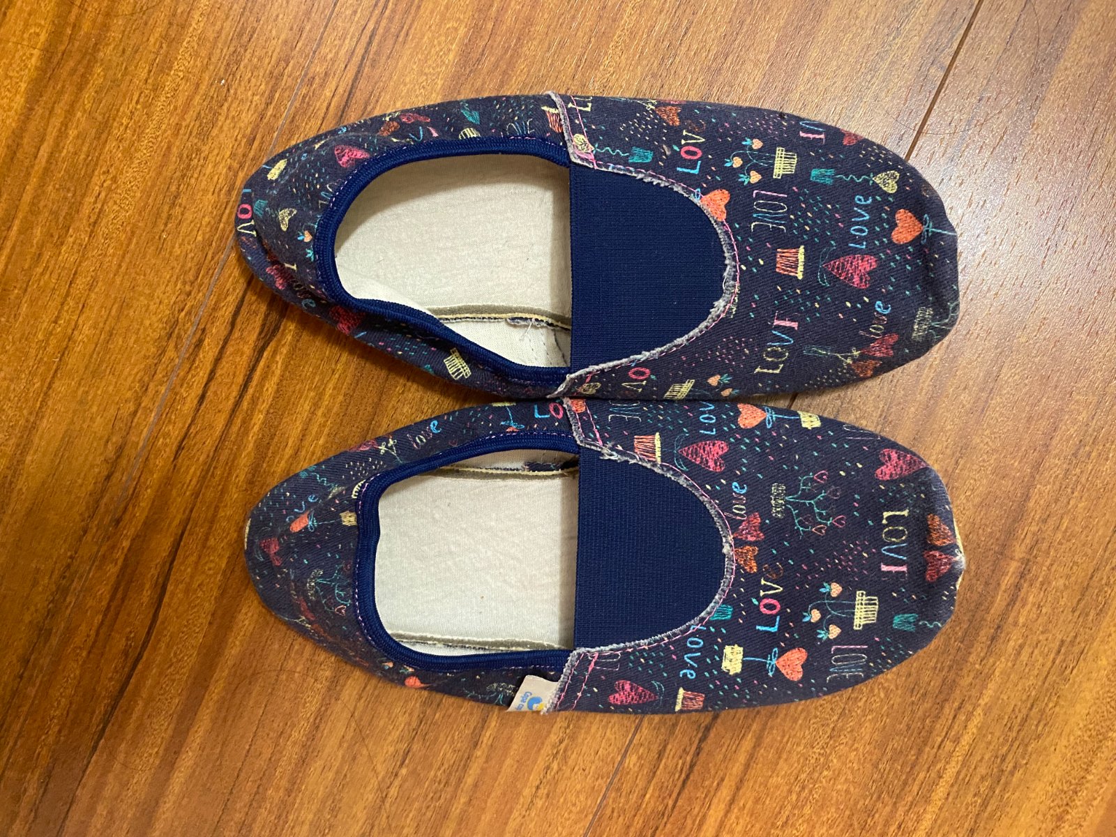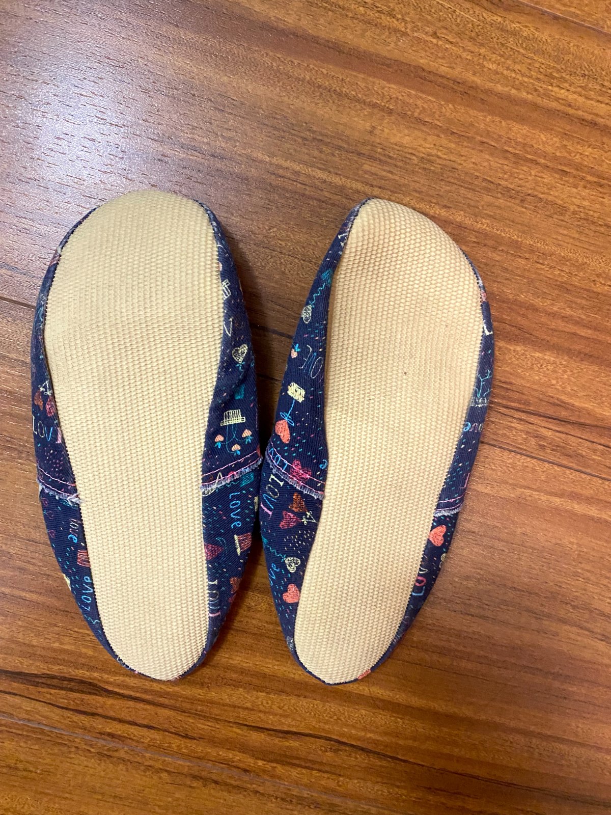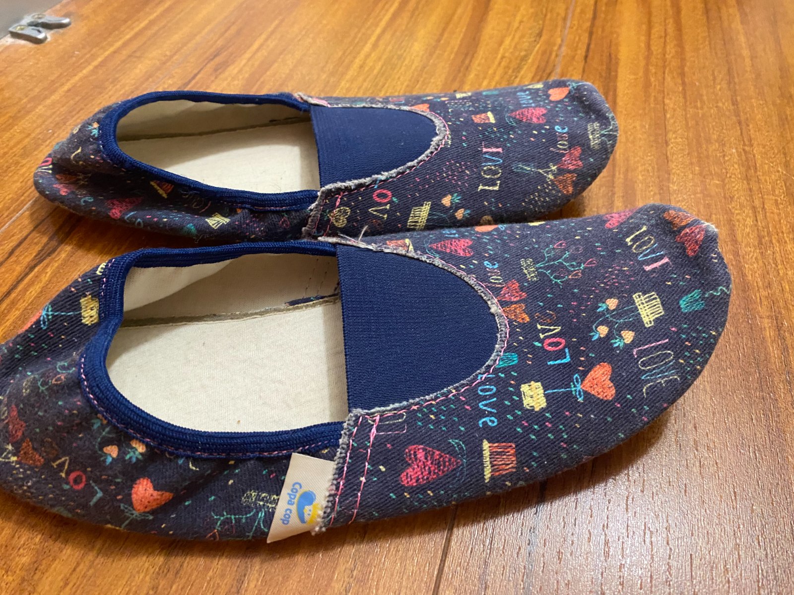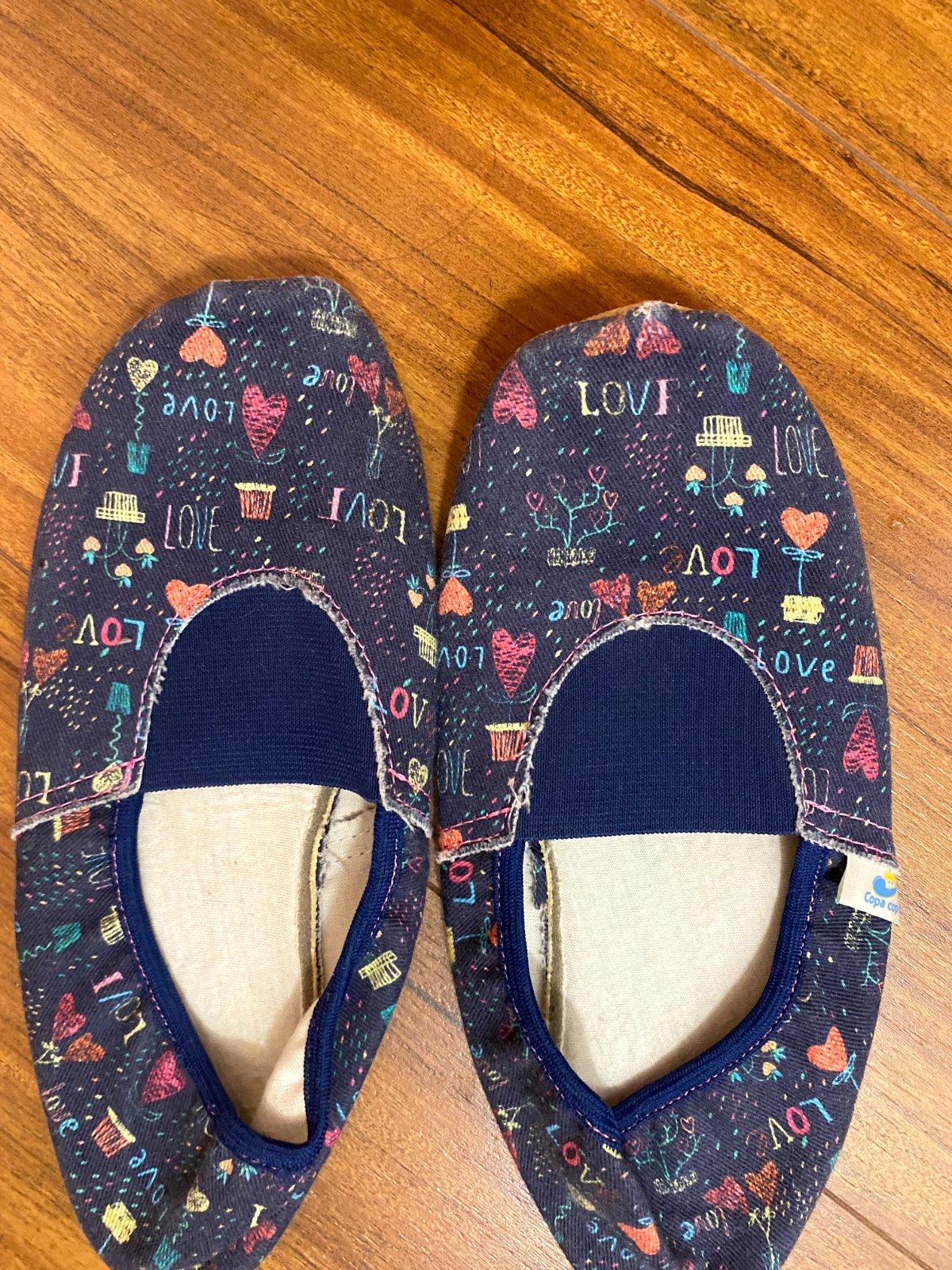 Tmavomodré paupučky/ cvičky, s gumičkou v strede, vďaka čomu sa prisposobia šírke nohy.