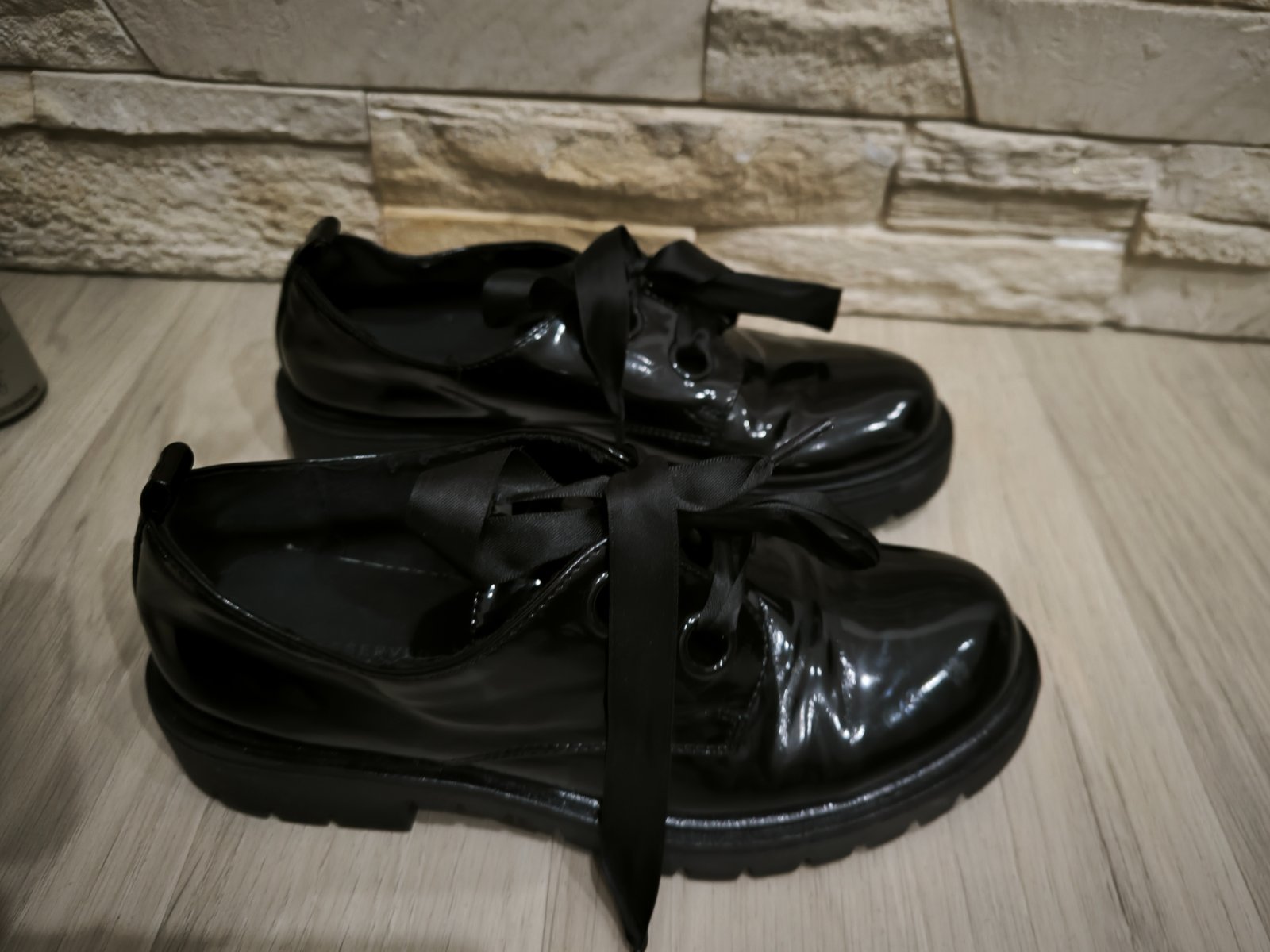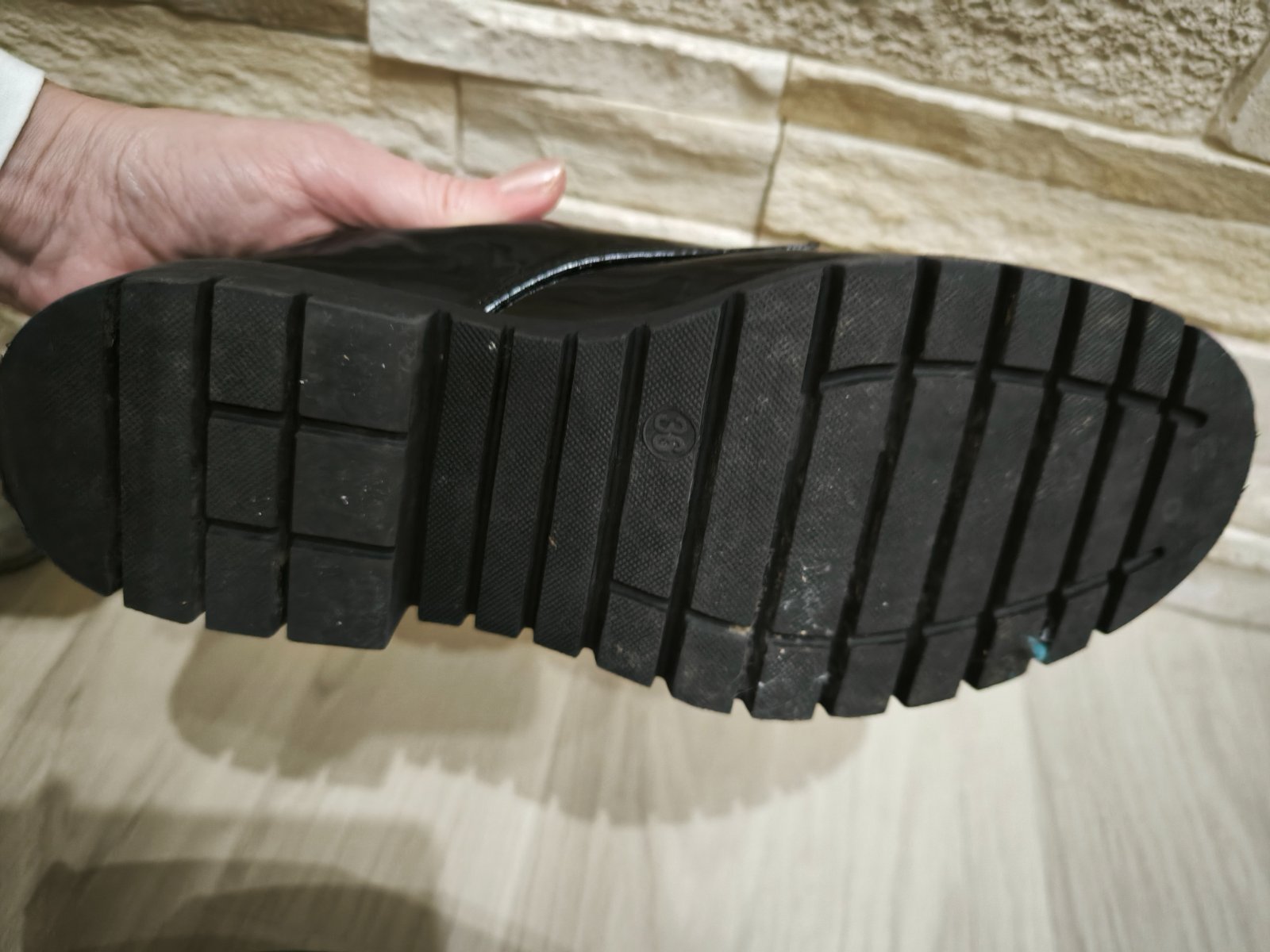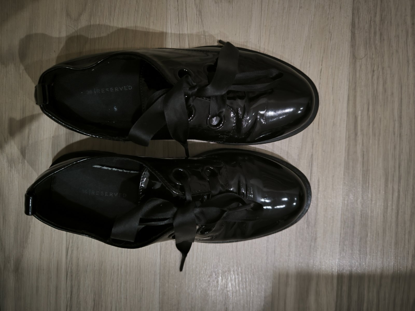 Čierne lakované topánky značky Reserved, kupovali sme ich na začiatku roka, pre dcérku, mala ich pár krát. Vpredu napravo sú trochu suchnute,nafotila som, ale nie je to vidno. V prípade záujmu k nim môžem pribaliť aj šľapky, tiez veľkosť 36.