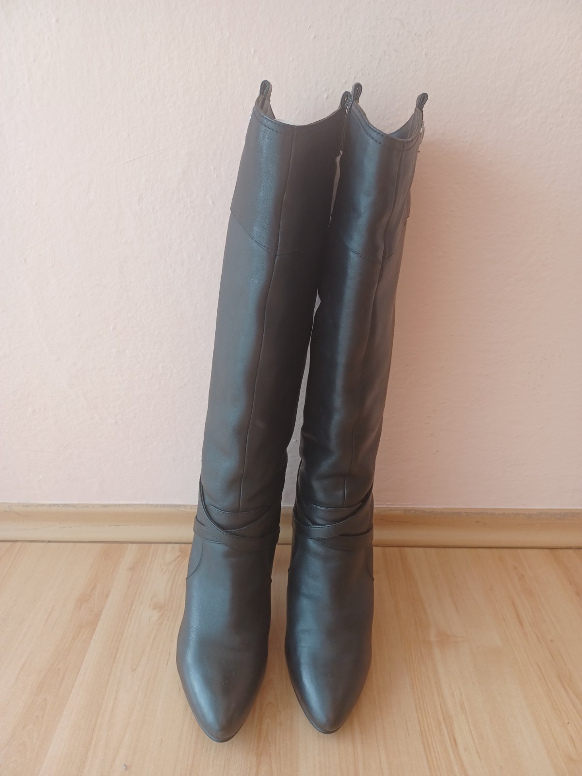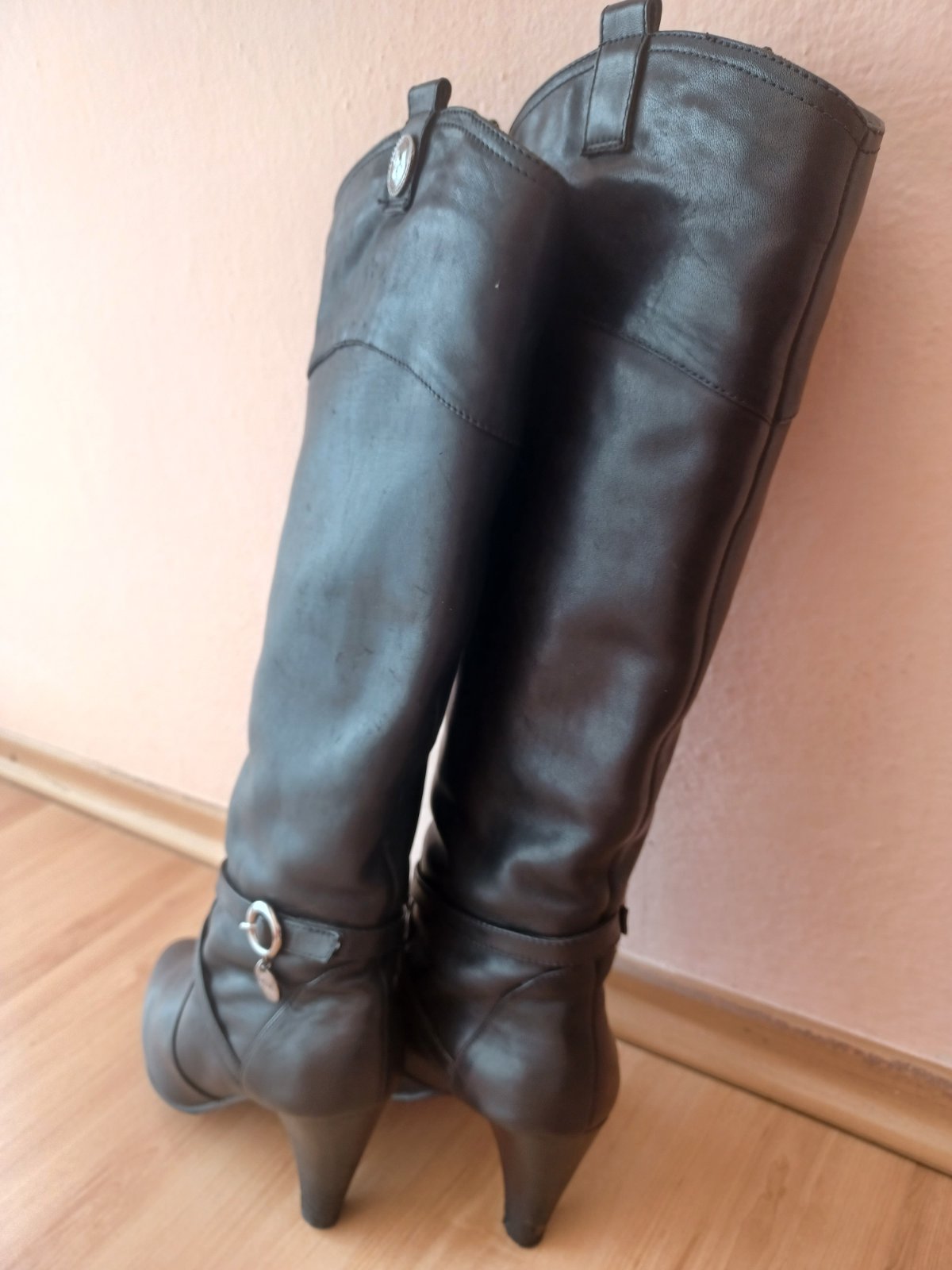 Predám talianske dámske kožené čižmy zn. Belle. Farba čierna, veľkosť 37. Výška podpätku je 8 cm. Čižmy sú zateplené s jemným kožúškom sivohnedej farby. Nemajú zips. Sú veľmi zachovalé, iba na opätkoch vidieť známky nosenia.