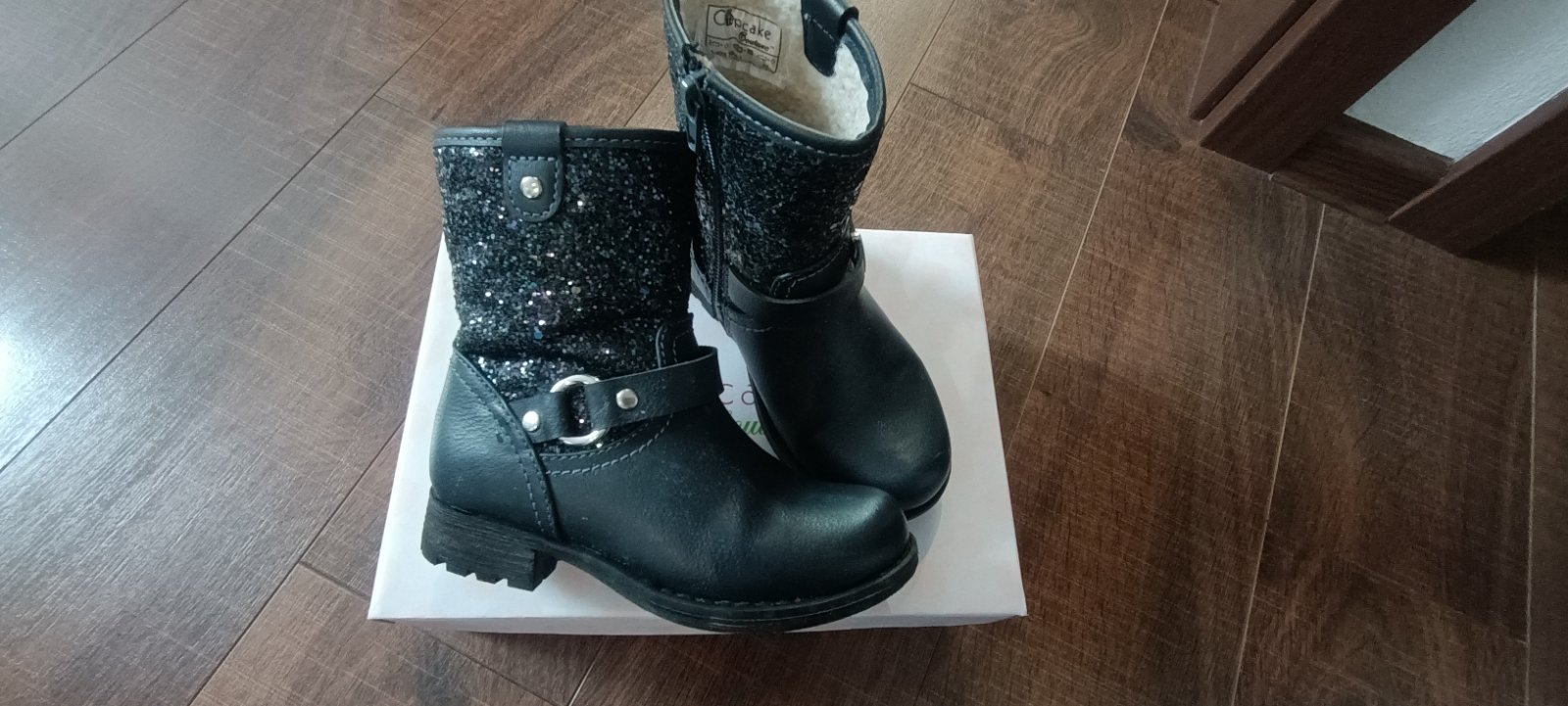 Hnedé čižmičky s jemnými trblietkami z velúrovej kože s kožušinkou. Čižmičky sú zvnútra zateplené, kožúštek nemá žmolky. Vn.dĺžka 16.5cm.