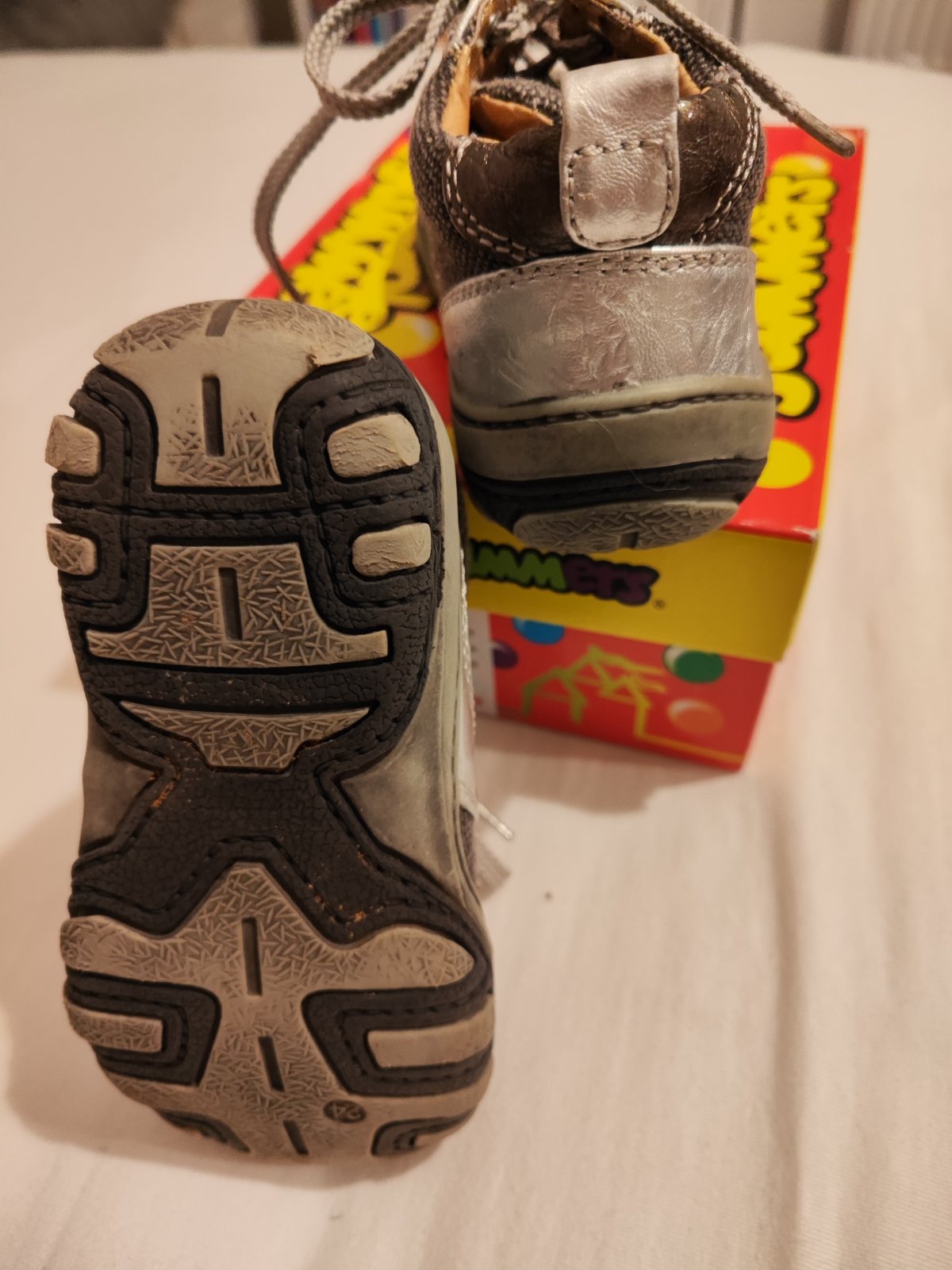Sedo-strieborne topanky, vn. dlzka cca 14,5-15 cm, kozena stielka.