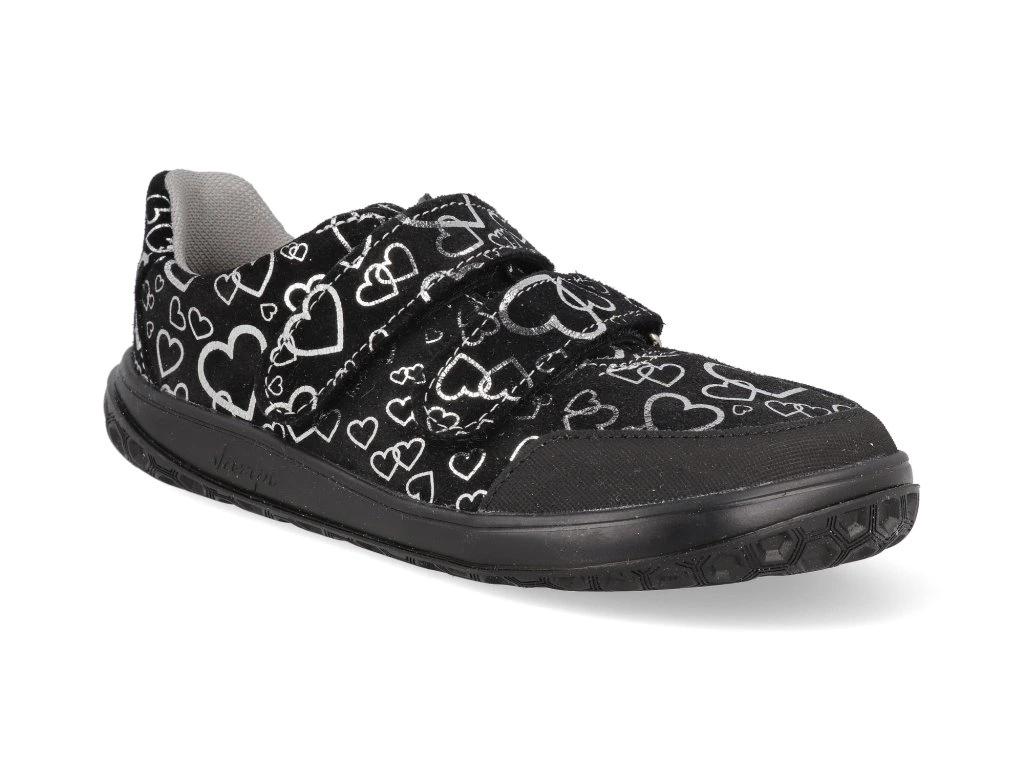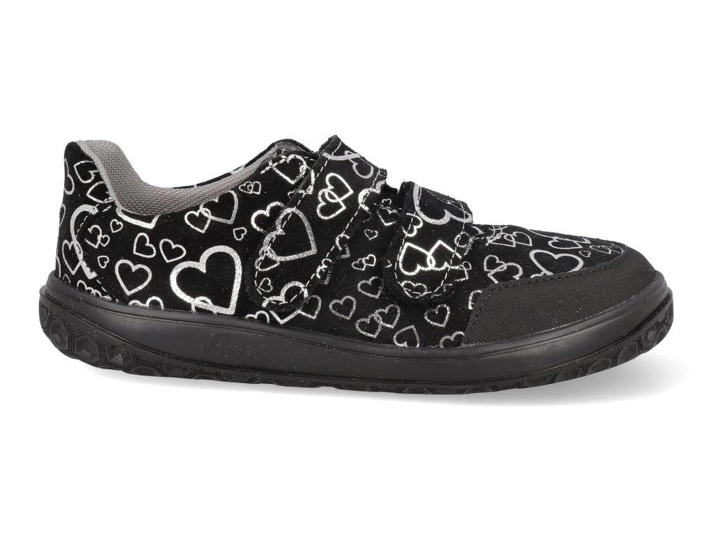 Barefoot topánky vyrobené z brúsenej kože, ozdobené striebornými srdiečkami.