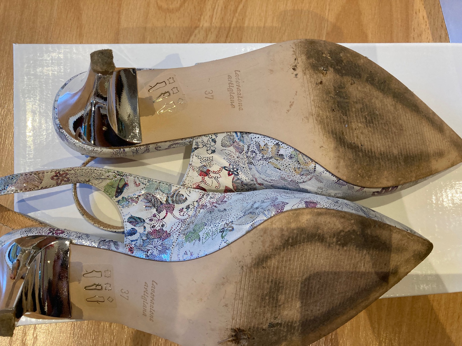 Nosené, bežné známky užívania, na pravej nohe trošku šuchnutá špička. Veľkosť 38, ale podľa mňa skôr 37, vnútorná dľžka cca 24cm.