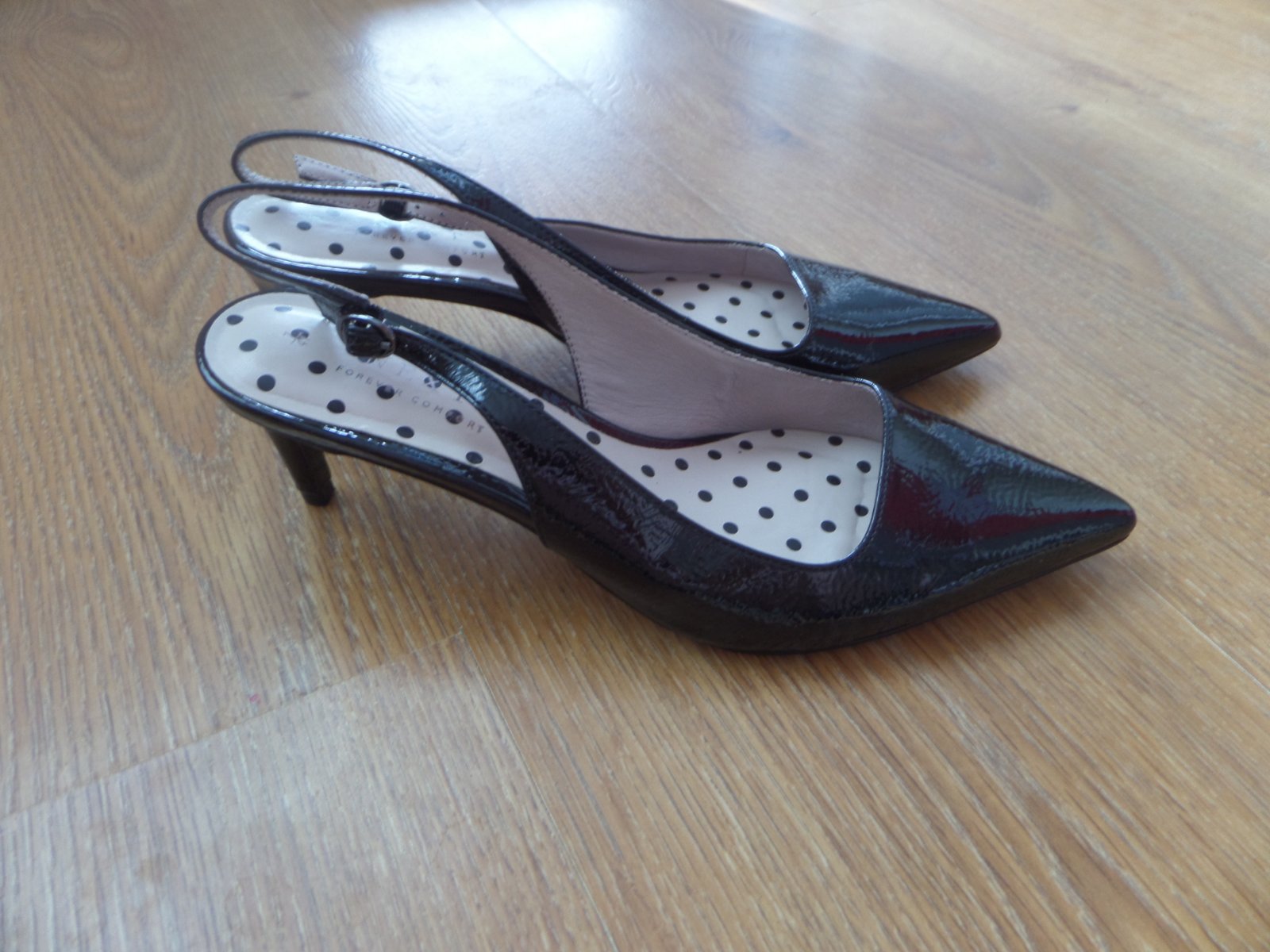 Elegantné lodičky ani raz obuté, žiaĺ lakovaná koža je vzadu na jednej topánke vyblednutá. Pri nosení nieje veĺmi vidieť.