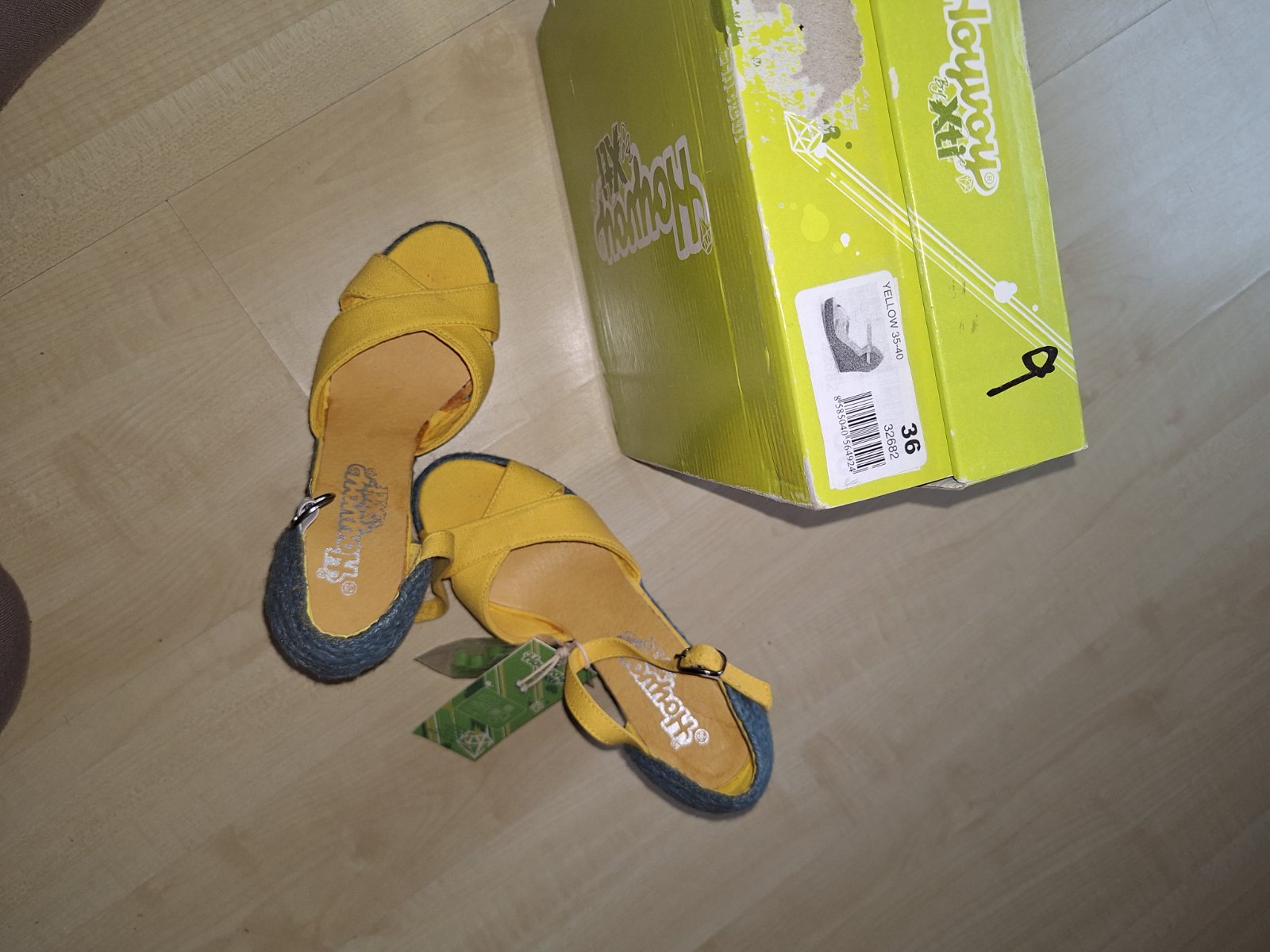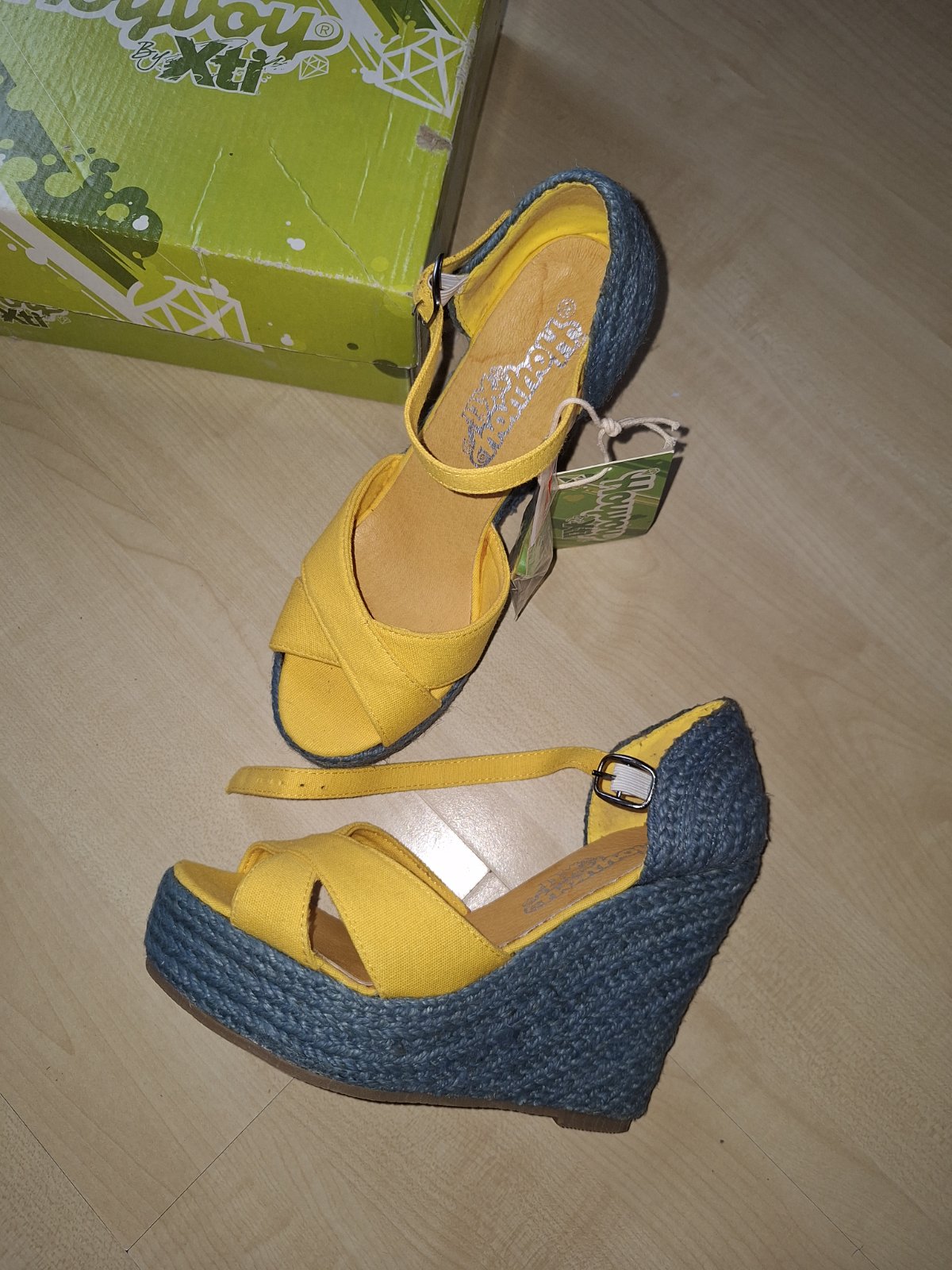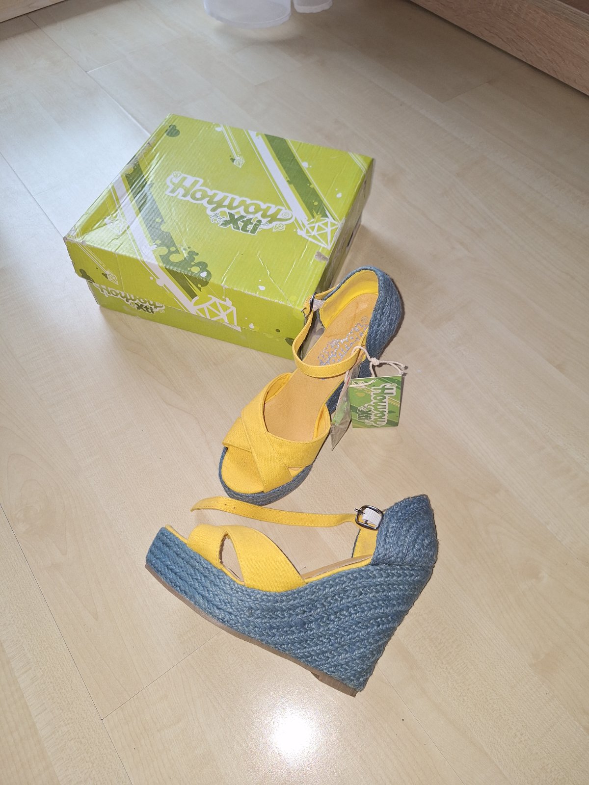 Vysoké sandalky , značka XTI, veľkosť 36. Zlomila som si členok a už vyššie nemôžem, tak posúvam. Boli len v skrini.Nakoľko maju vysokú i prednú časť su pohodlné. Cena 12, 90€