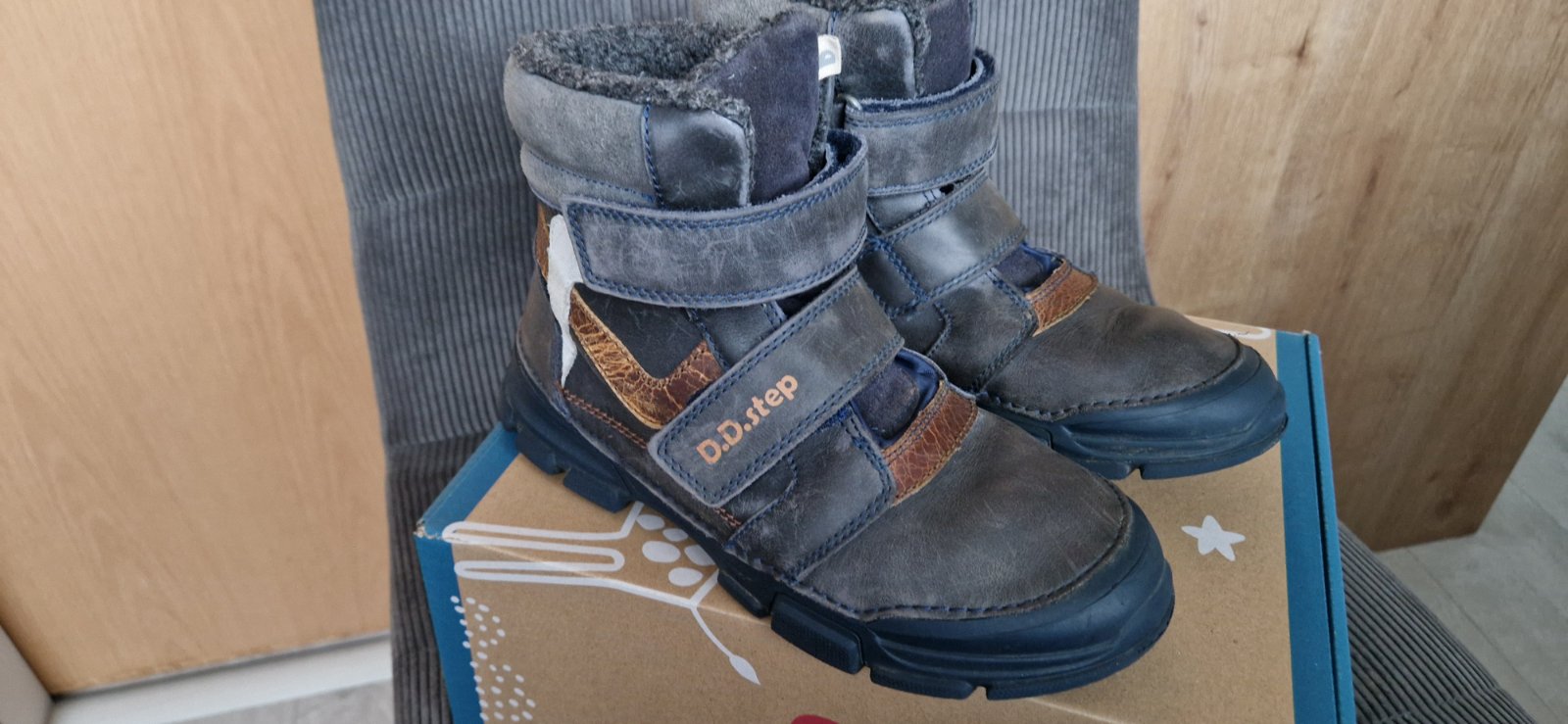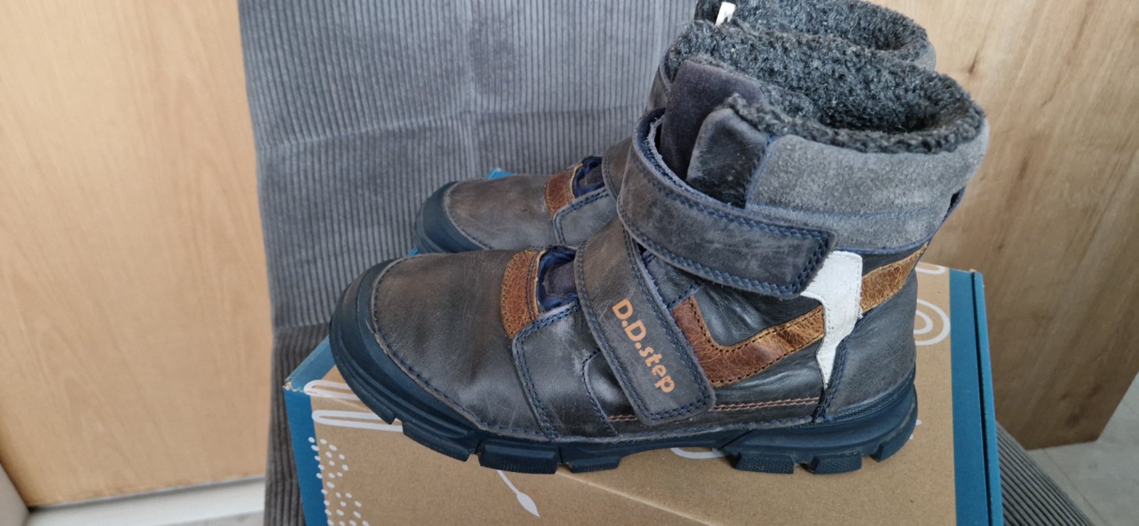Vynikajúce zimné topánky od známej a kvalitnej značky D.D.Step. Sú vo veľmi dobrom stave, nosené boli striedavo s inými čižmami. Sivá farba vpredu je od novoty ako "zošúchaná".