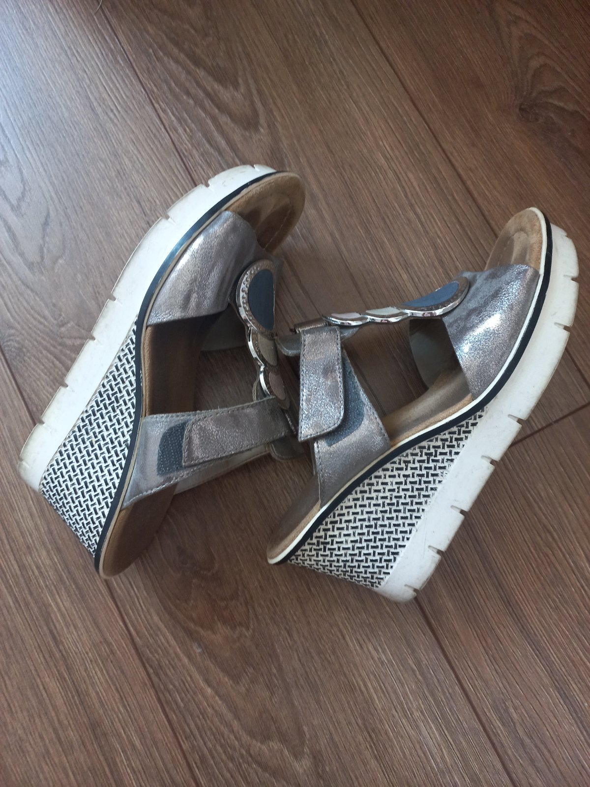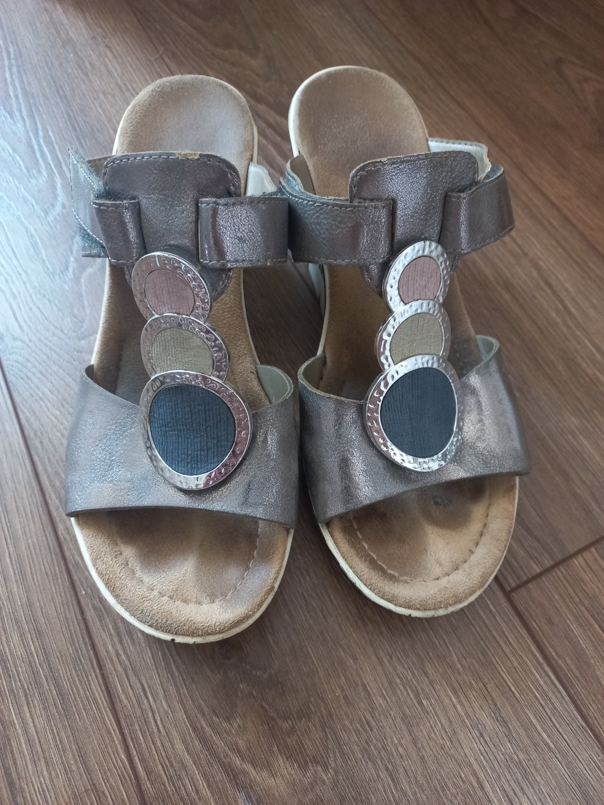 Elegantné sandálky na klinovom opätku Vnútorná dĺžka 24,5cm Od okraja po okraj 25cm Nastaviteľné upinanie Geometricky vzor kruhy Stav nafoteny