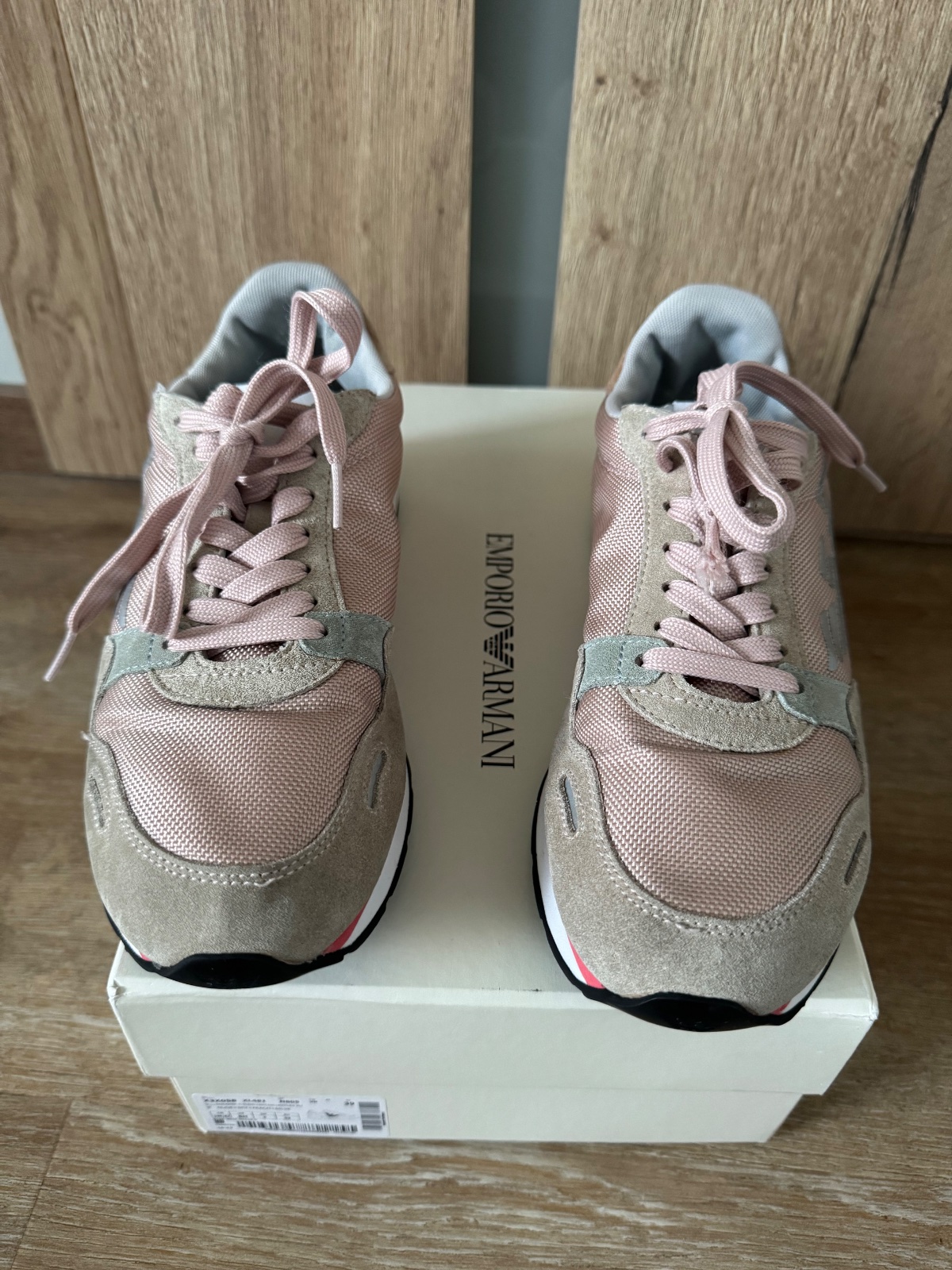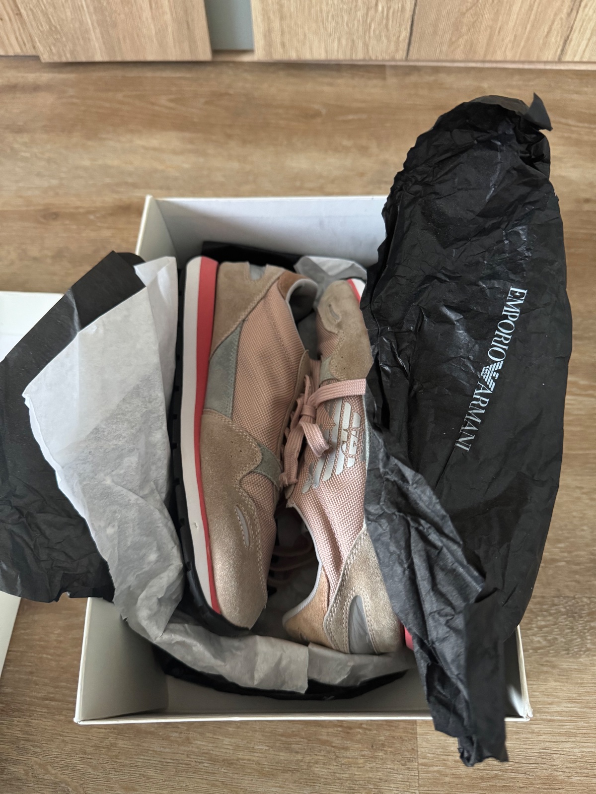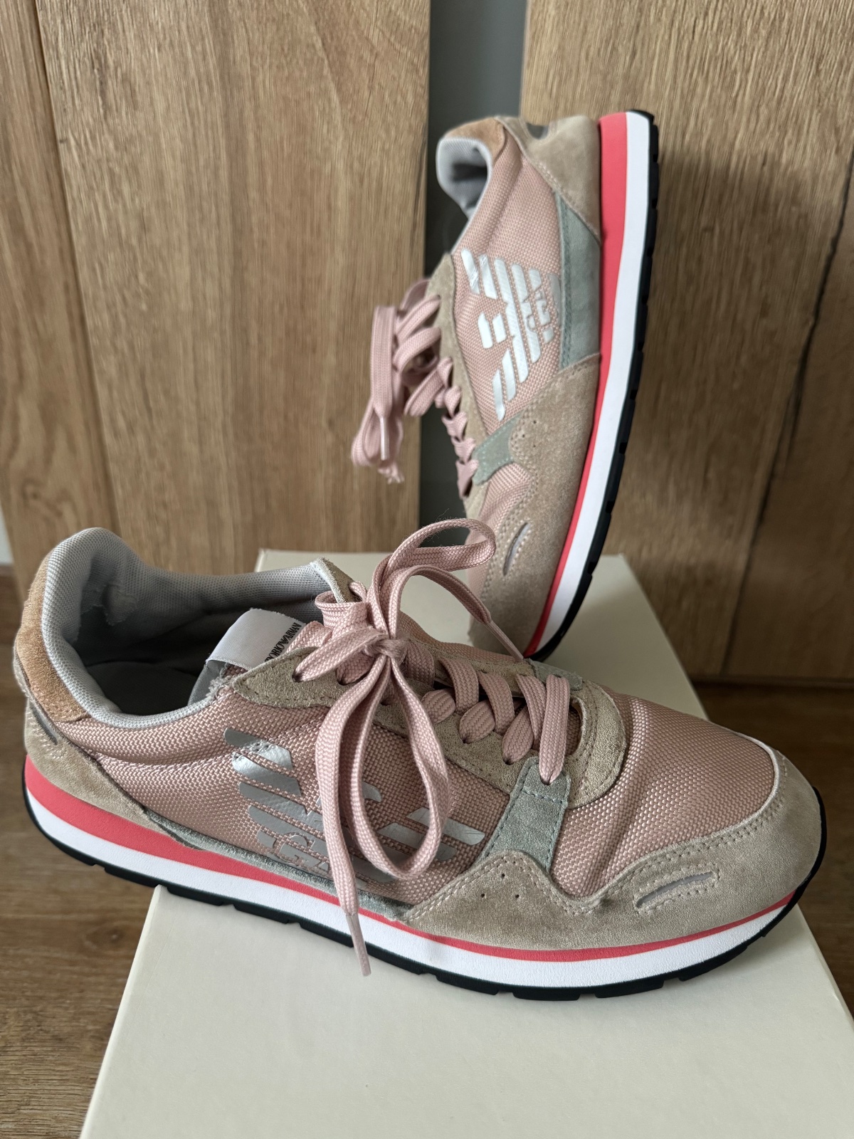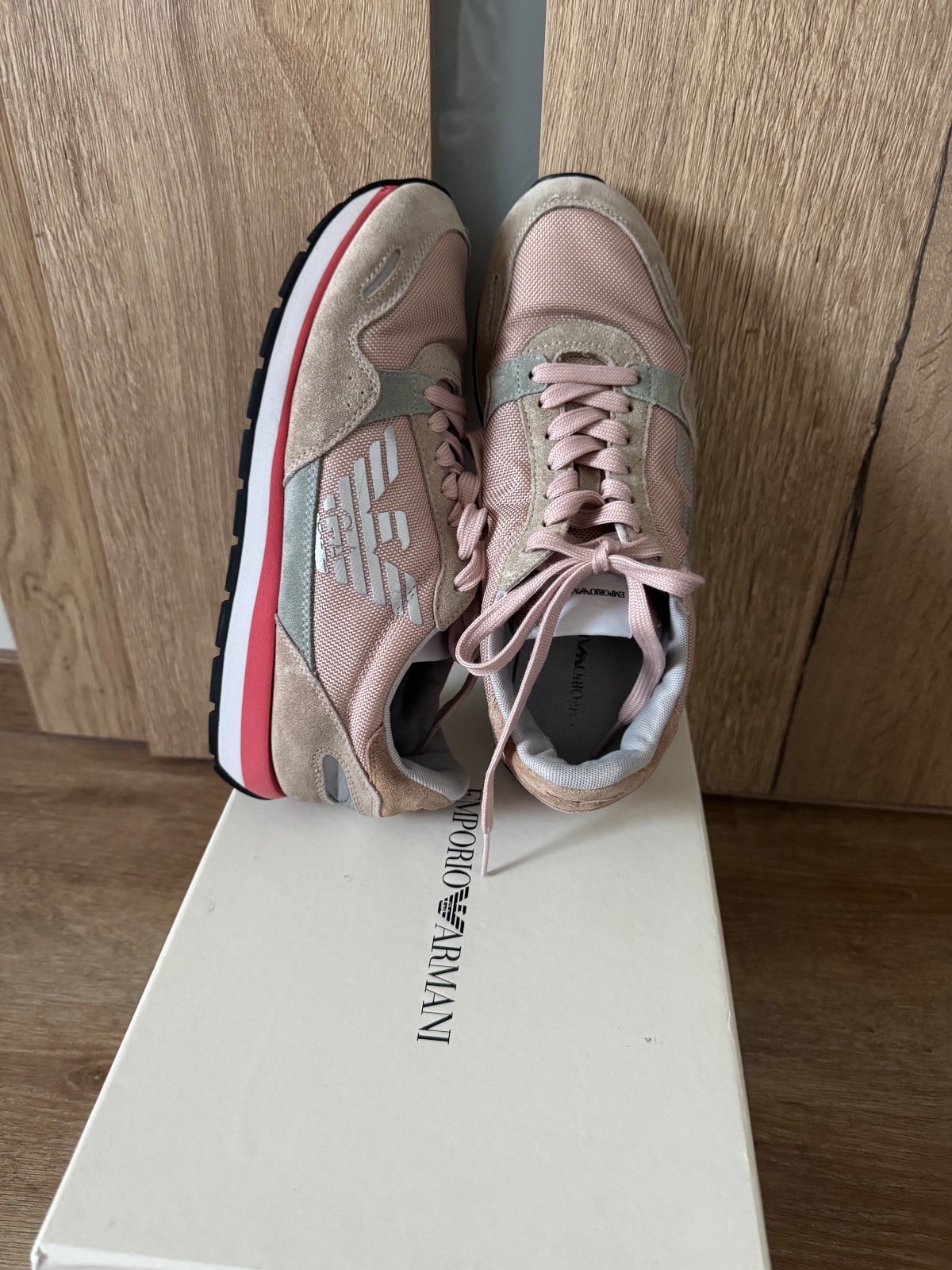 Ponúkam krásne tenisky Emporio Armani v peknej farebnej kombinácii staroružovej a striebornej. Majú reflexné prvky a boli občasne nosené. Naďalej vo veľmi peknom stave viď. foto ( 1 šnúrka na konci rozstrapkaná), podrážka je neschodená. Veľkosť je uvedená 39 a vnútorná dĺžka je uvedená 24,9cm, čo aj sedí ideál na nohu 24,5-25cm. Vrátane krabice. PC vysoká. Poštovné podľa taríf.