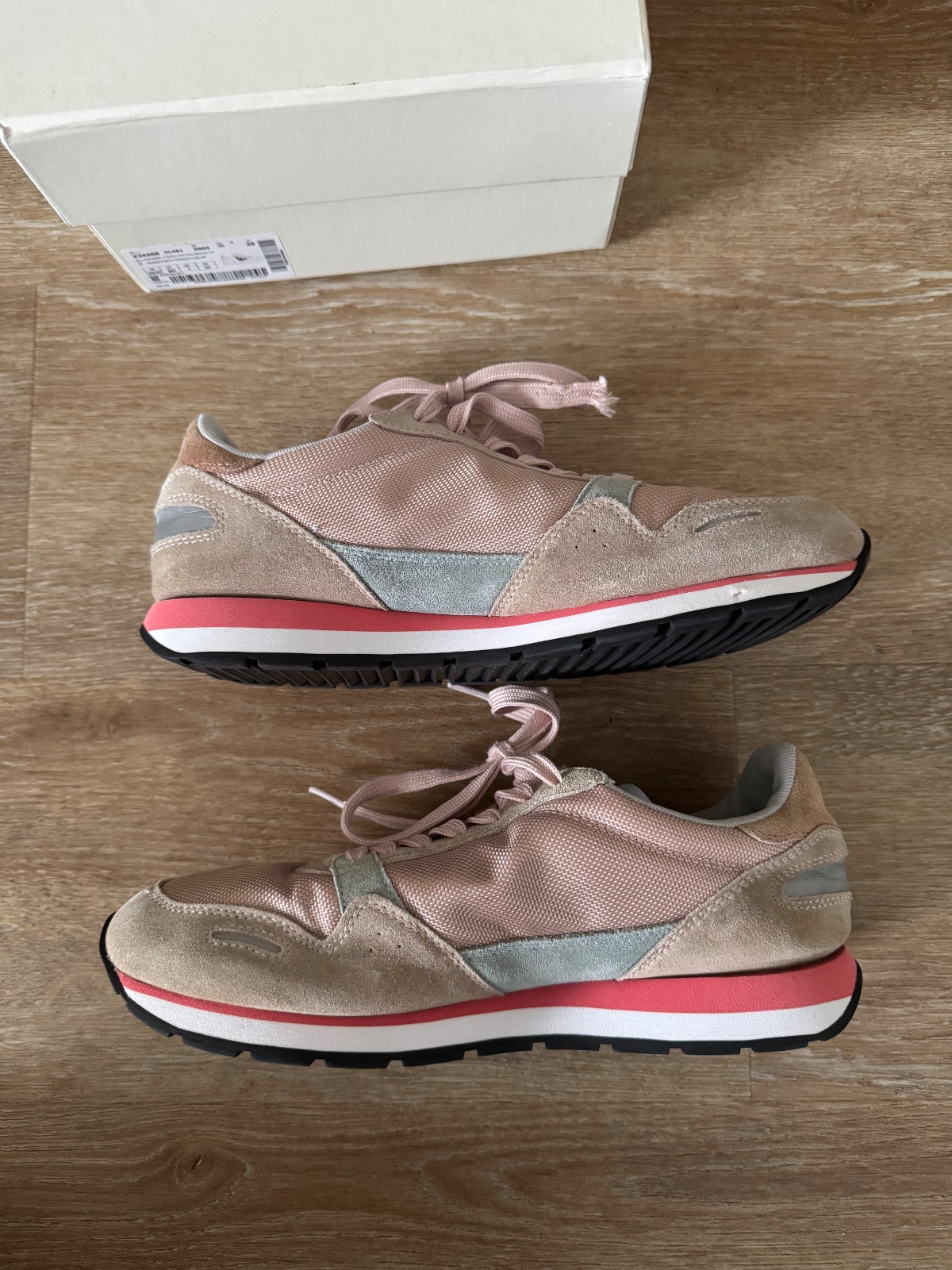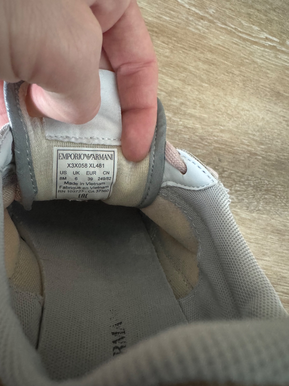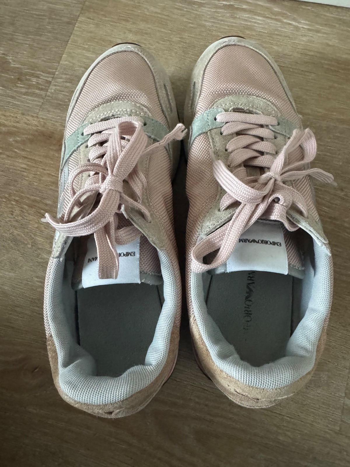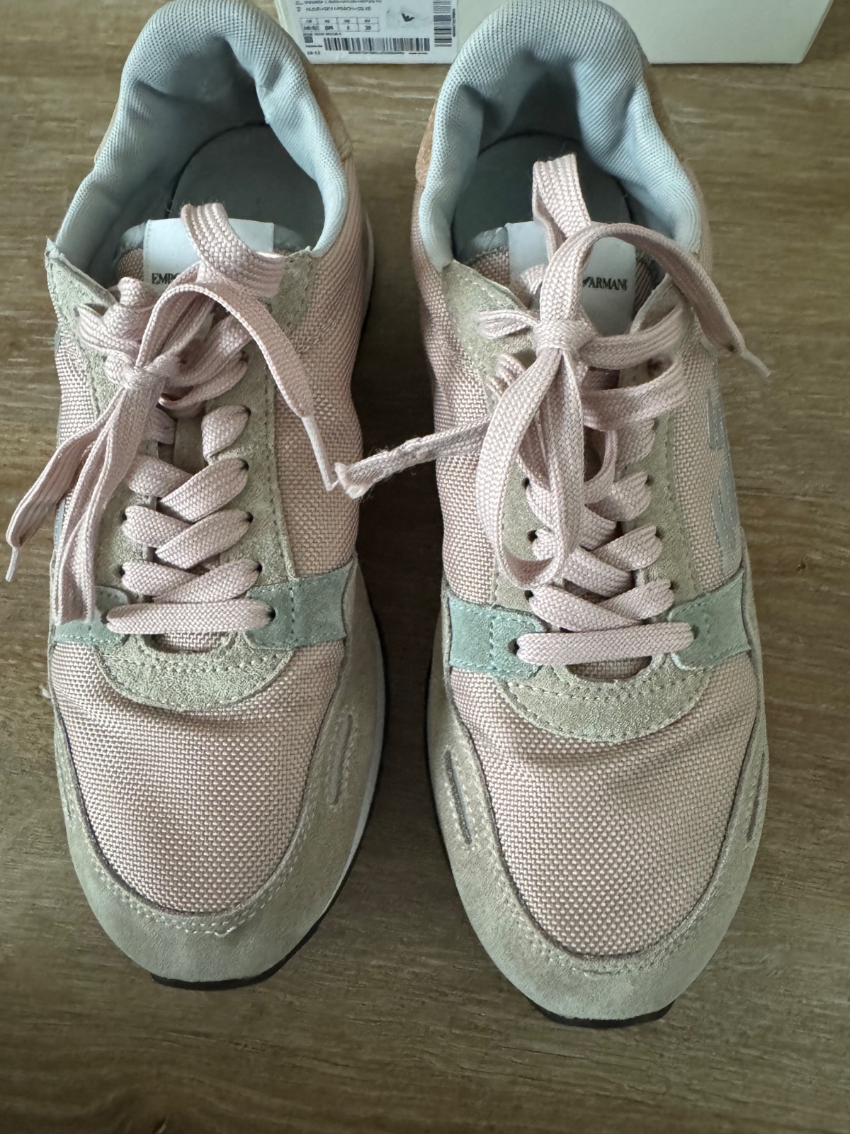 Ponúkam krásne tenisky Emporio Armani v peknej farebnej kombinácii staroružovej a striebornej. Majú reflexné prvky a boli občasne nosené. Naďalej vo veľmi peknom stave viď. foto ( 1 šnúrka na konci rozstrapkaná), podrážka je neschodená. Veľkosť je uvedená 39 a vnútorná dĺžka je uvedená 24,9cm, čo aj sedí ideál na nohu 24,5-25cm. Vrátane krabice. PC vysoká. Poštovné podľa taríf.