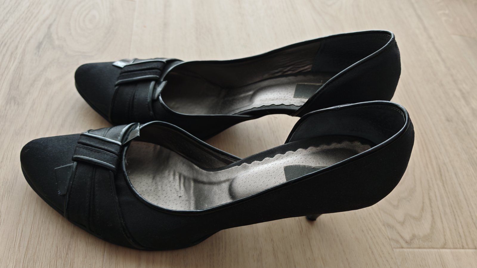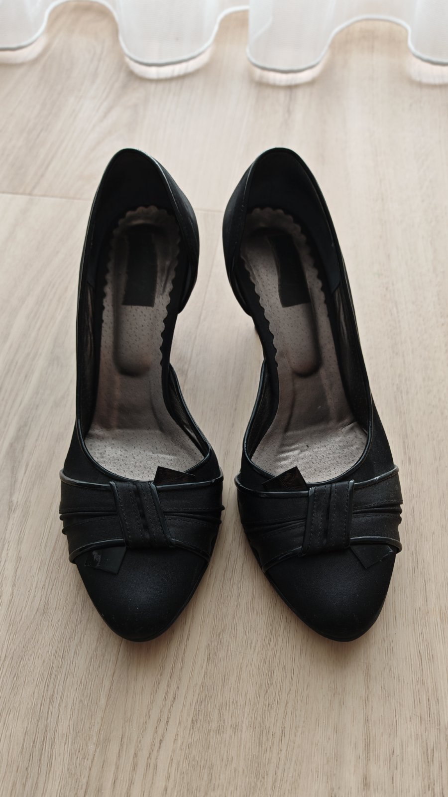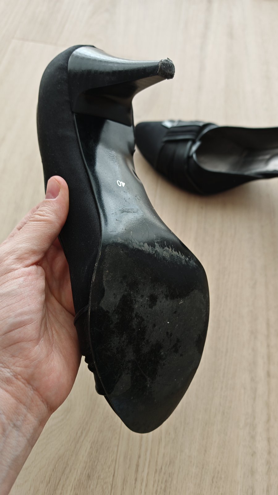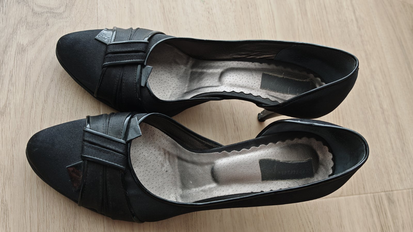 Cierne spolocenske lodicky, zvonku latka, zvnutra kozene. Kupovane v butiku so spolocenskou obuvou, vyrobene v polsku. Prijemny opatok, velmi pohodlne. Boli obute par krat na spolocenskej akcii, ale su maximalne zachovale, len podpatok by sa mozno zisiel vymenit. Po tehotenstve su mi uz male.