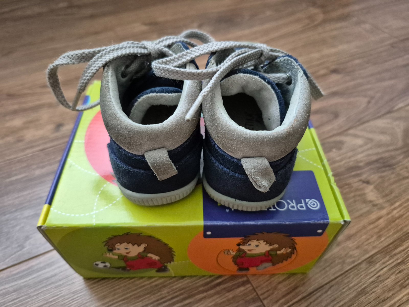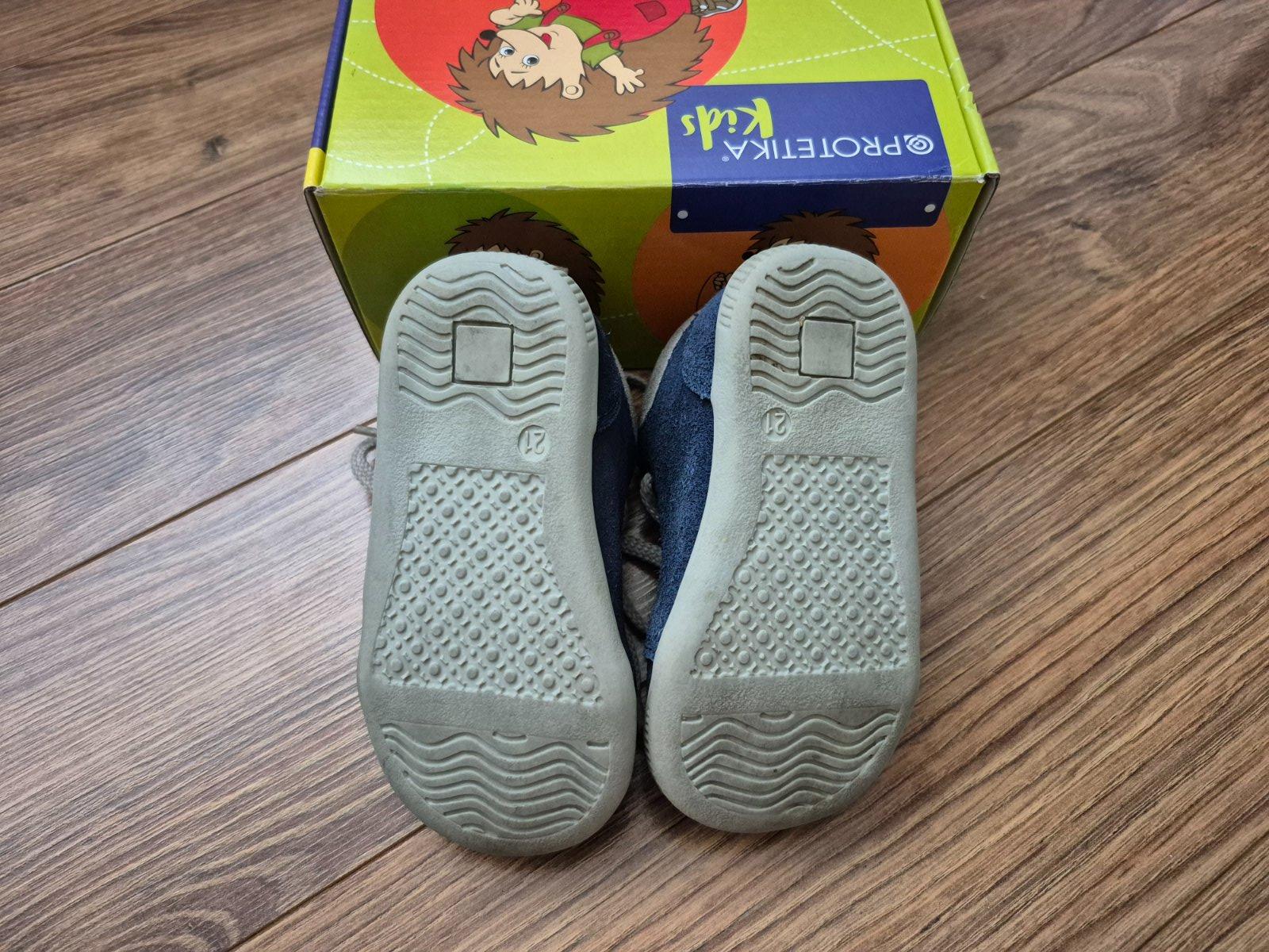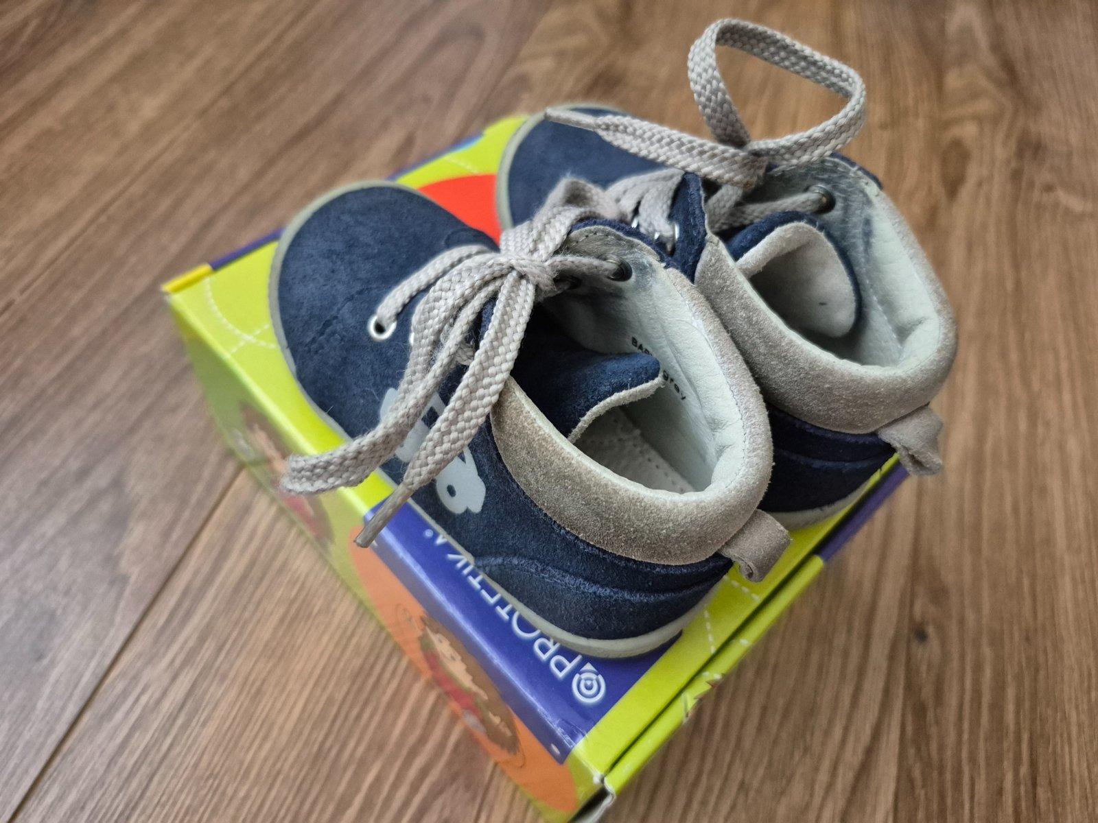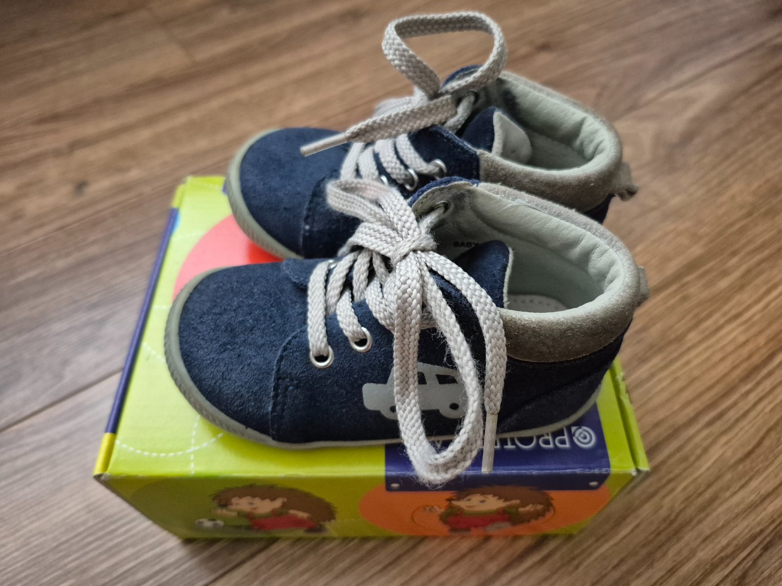 Topánky vhodné aj na prvé kroky. Topánky majú ohybnú podrážku, ktorá je vyvýšená v prednej časti proti okopaniu. Majú pevnú pätu. Zvršok je z brúsenej kože