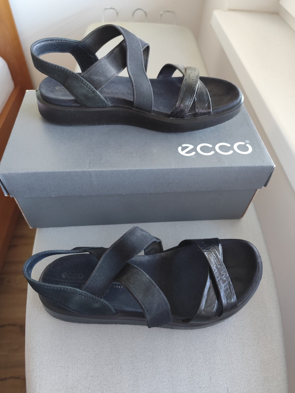 Nosené dámske sandále Ecco Flowt W, veľkosť 39, čierna lakovaná koža. Už vidno známky nosenia.