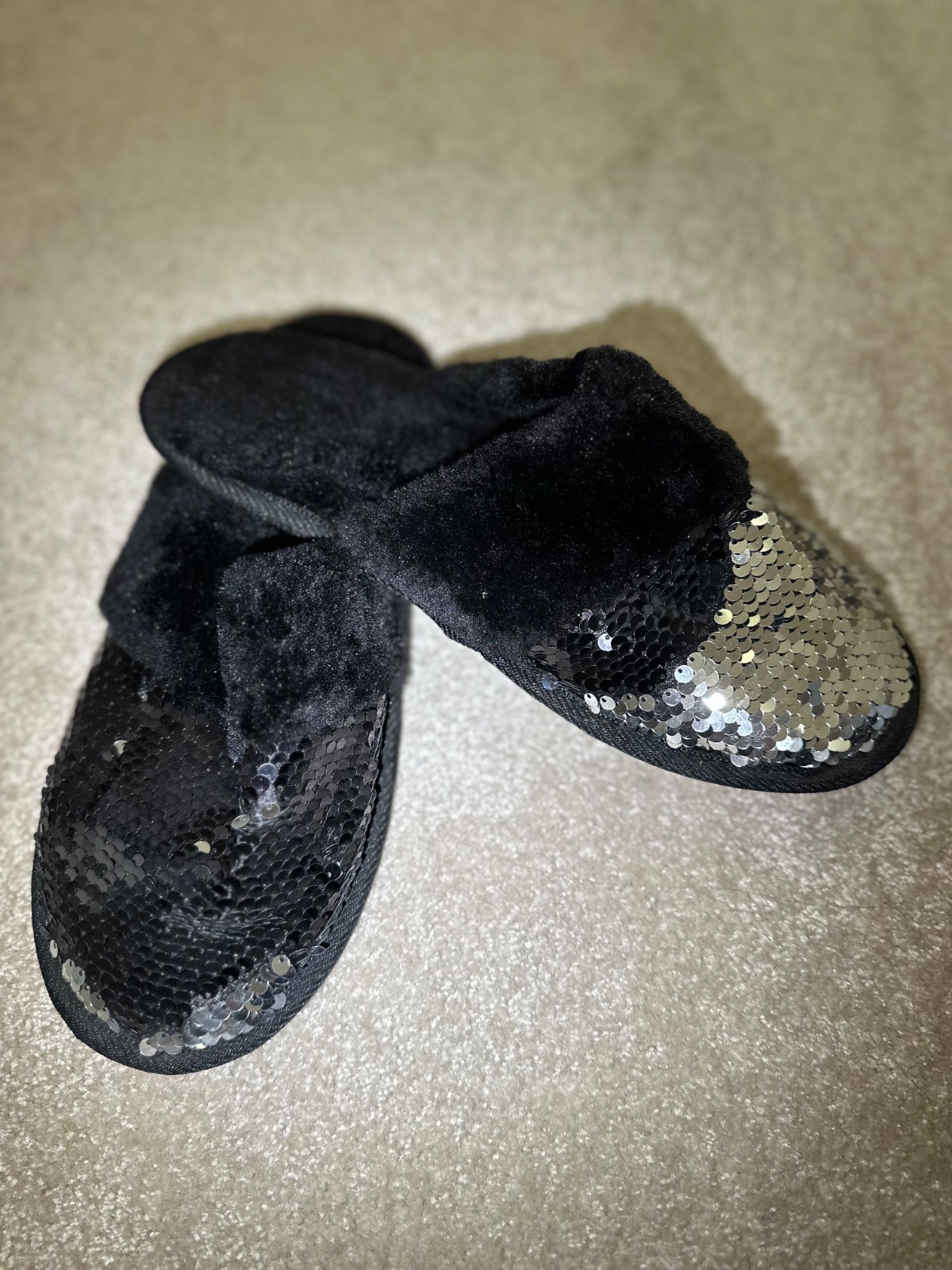 Dámske huňaté papuče s kožušinkou Krásne kožušinkové papuče s perličkami. 2 pasy perličiek po oboch stranách. Ťažko nafotiť keďže kožušinka ich prekrýva. Nové - vid foto podrážky.