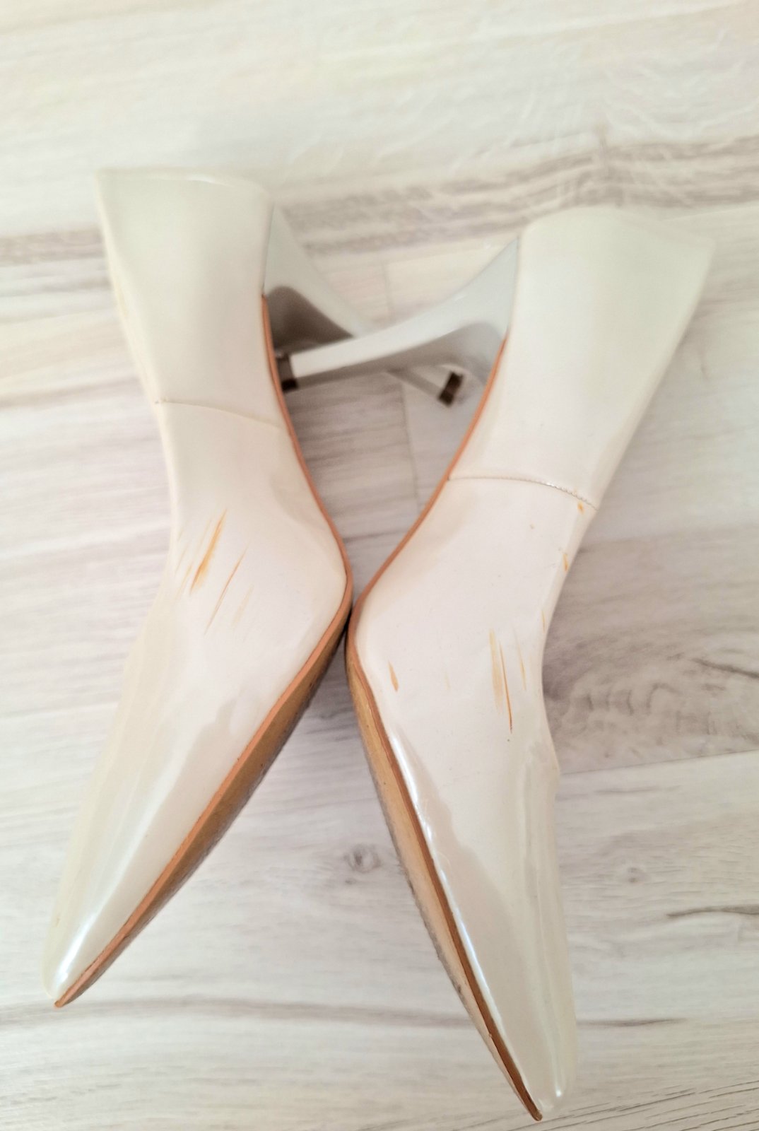Zachovalé pohodlné lodičky,nízky opätok. Mala som ich obuté párkrát na svadbe. Sú kvalitné,kožené kupované v obuve. Pc bola 32€. Nemajú žiadne poškodenia okrem pár škrabancov. (viď foto).