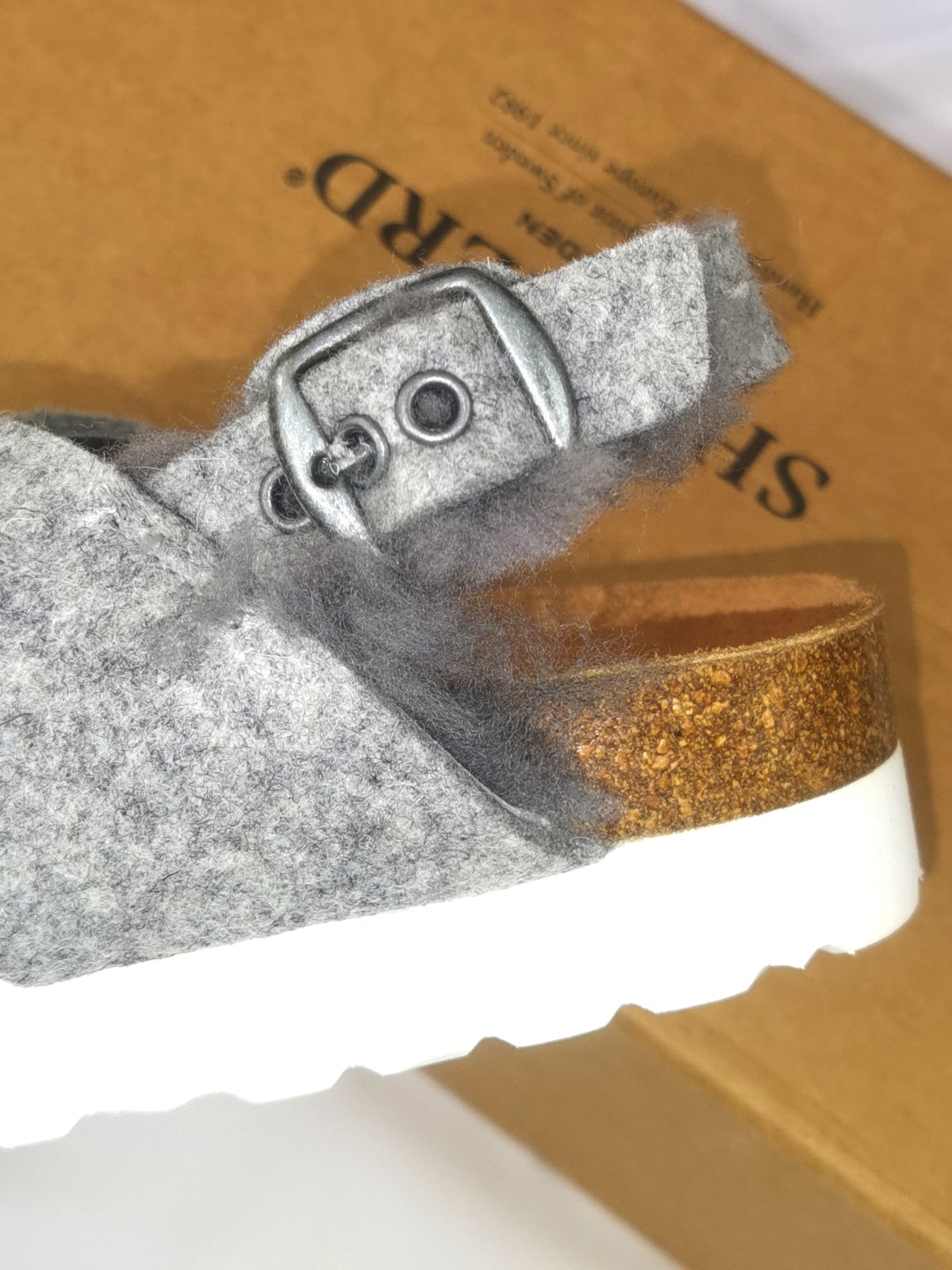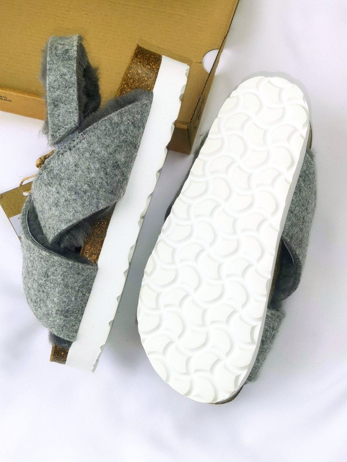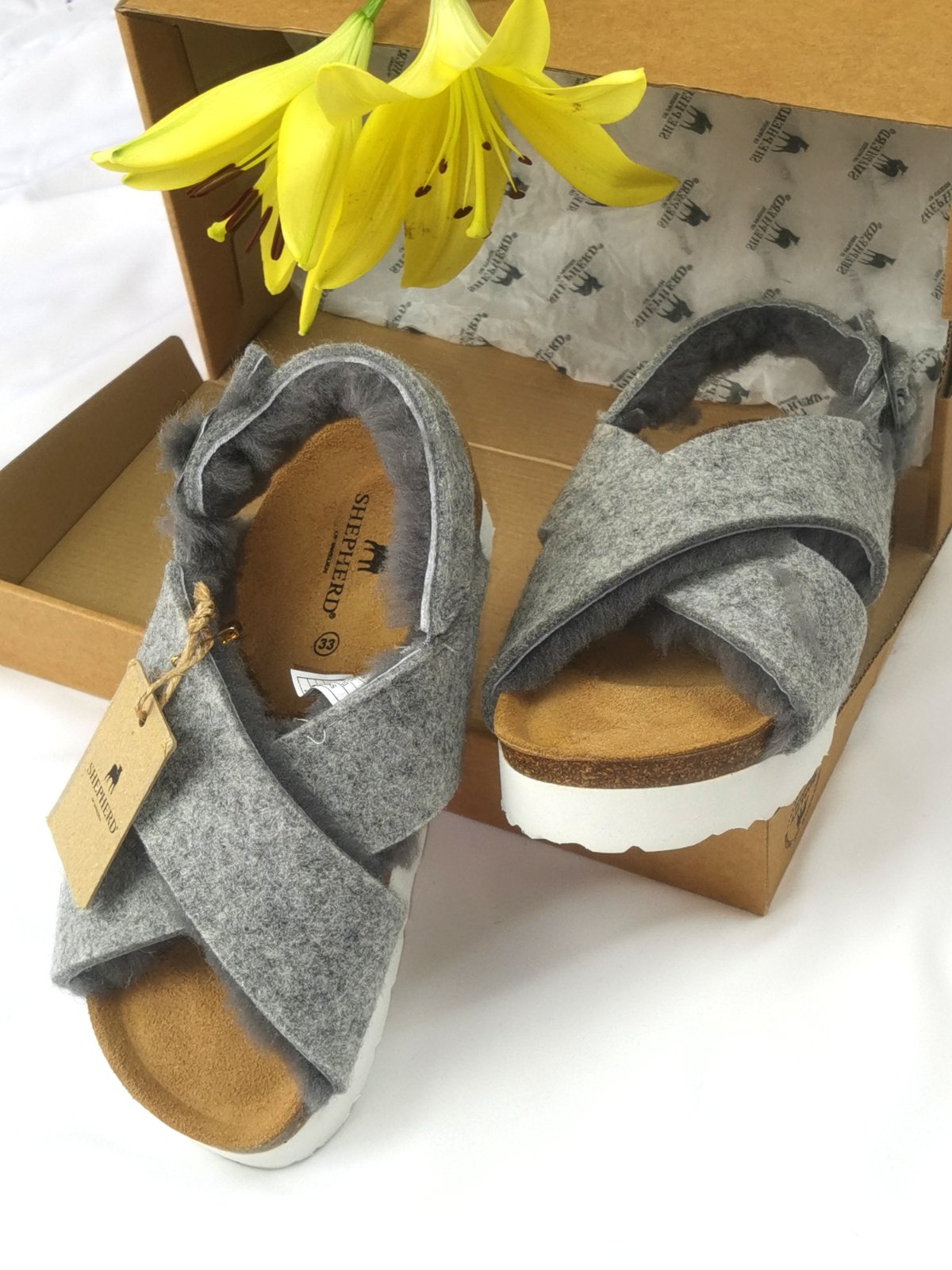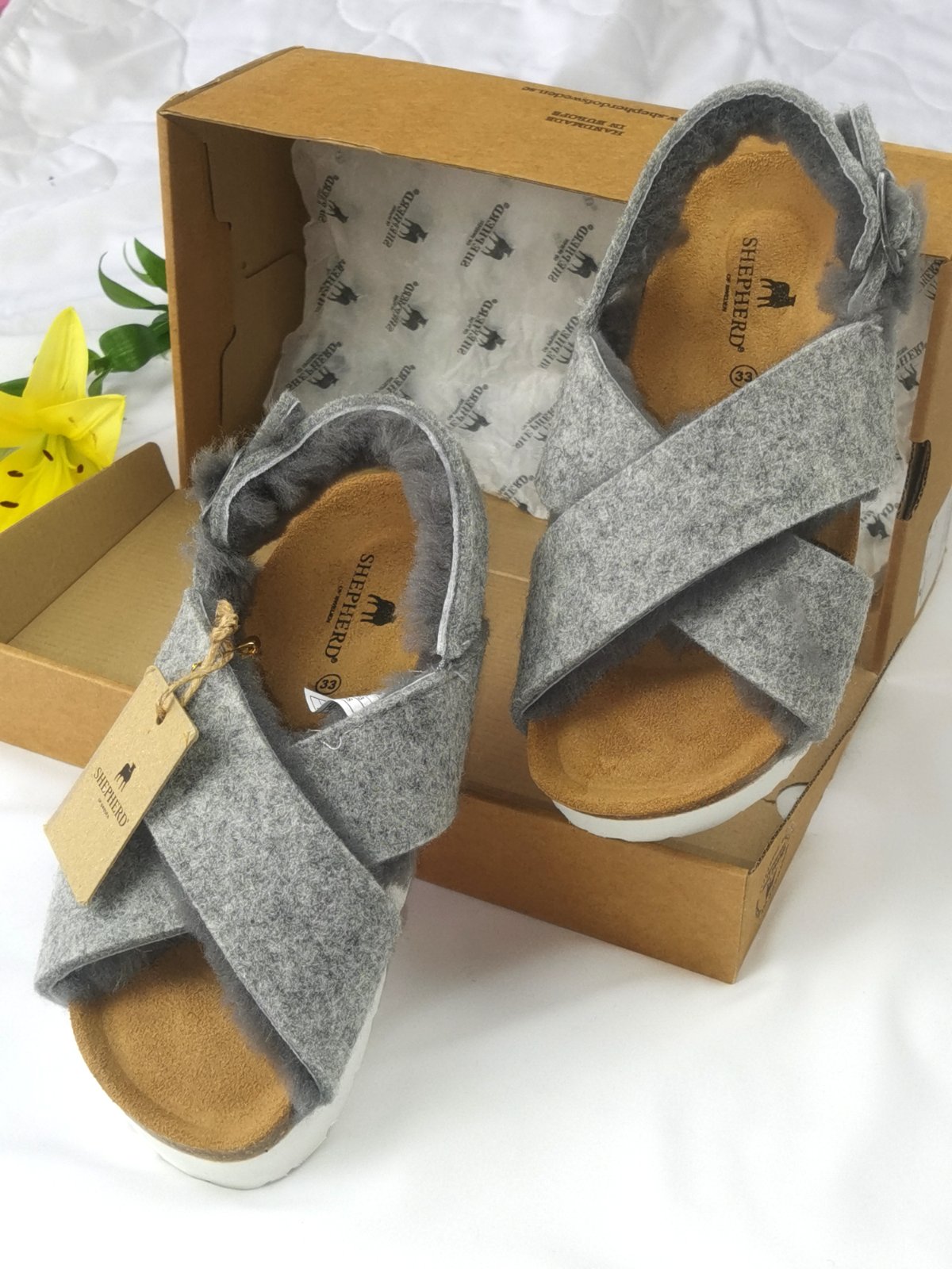 Shepherd MILLA – sú papučky, kde sa pohodlie stretáva spolu zo štýlom!Tieto otvorené sandále/papučky majú prekrížené nártové remienky, vyrobené z mäkkej ovčej vlny a luxusnej ovčej kožušiny, čo je zmes prírodných materiálov, vďaka ktorým sú štýlové a zároveň pohodlné. Anatomicky tvarovaná korková stielka, je potiahnutá do semišu.