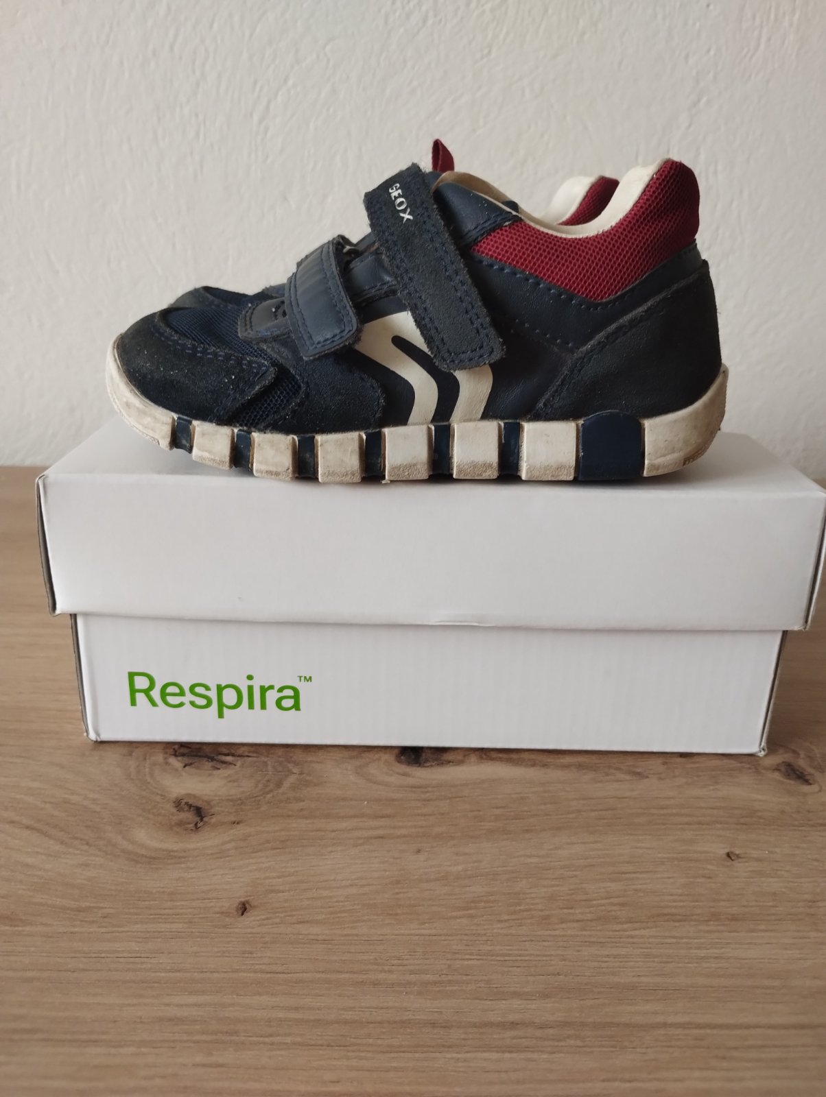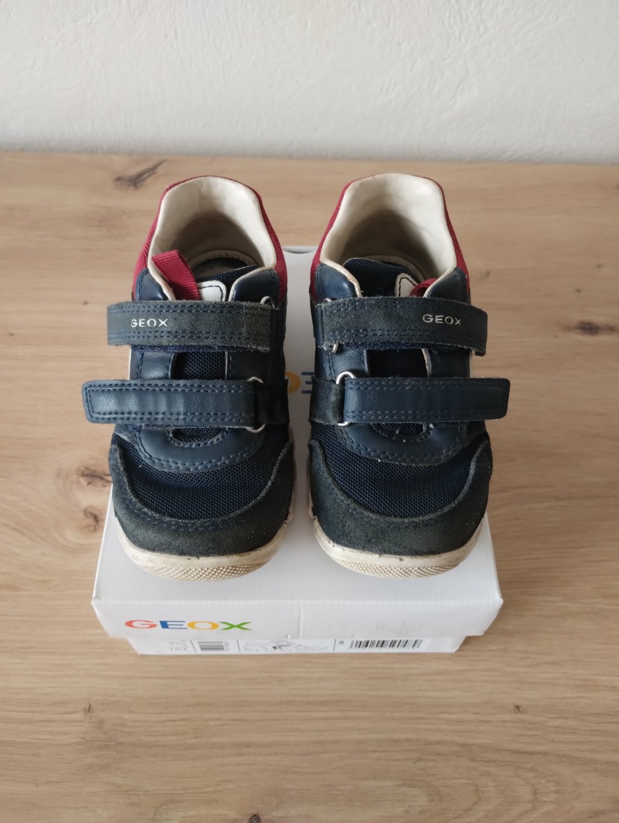 chlapcenske tenisky Geox velkost 25, vd 15cm, zvonka zvnutra kozene, na pravej topanocke vzadu trosku osuchany znak, lava minimalne osuchana spicka, inak vo velmi dobrom stave