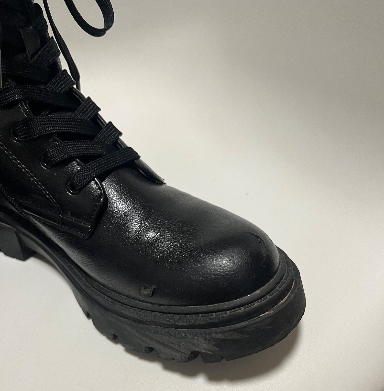 Opotrebenie na ľavej špičke a podrážke z bočnej strany.
