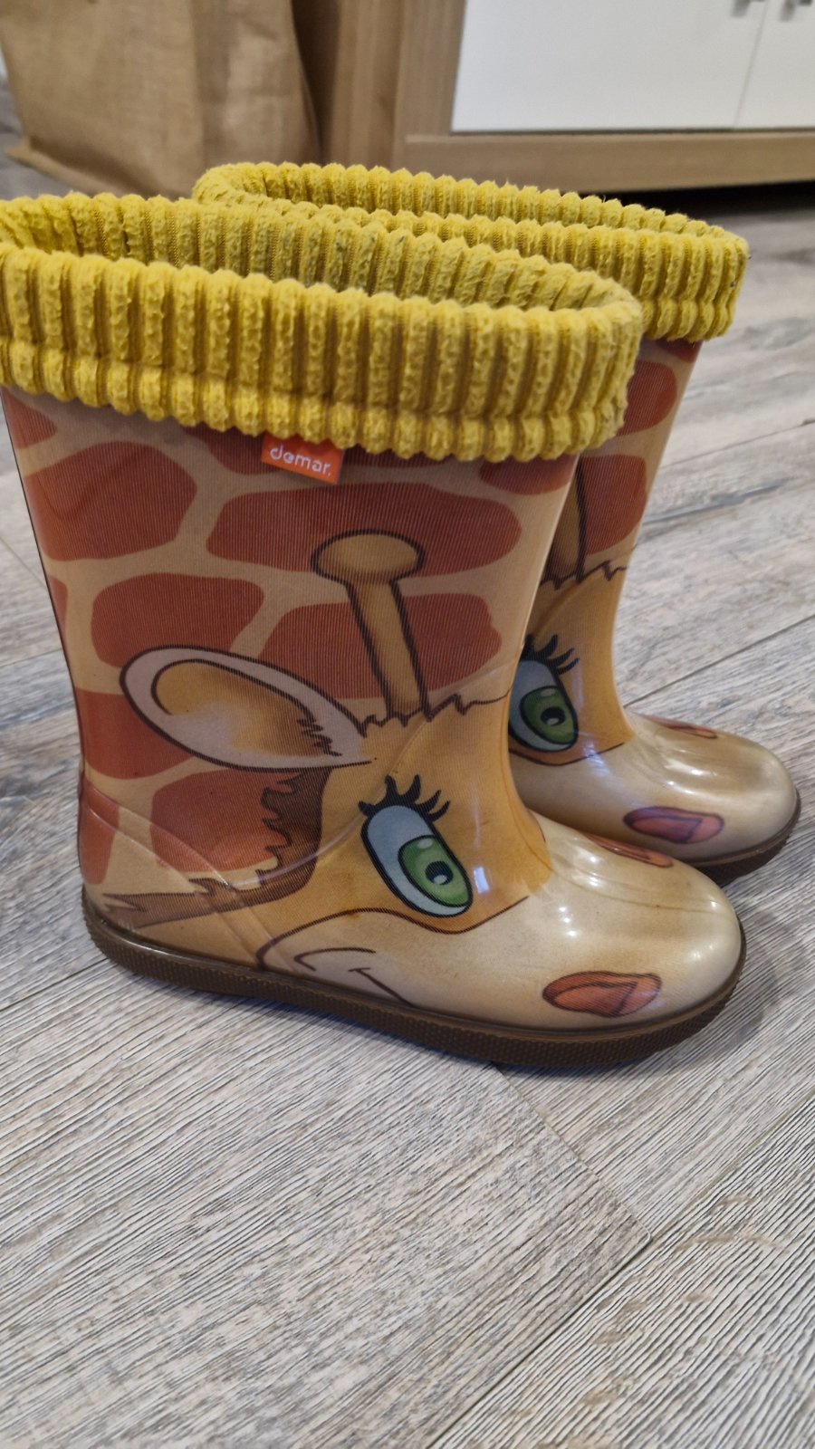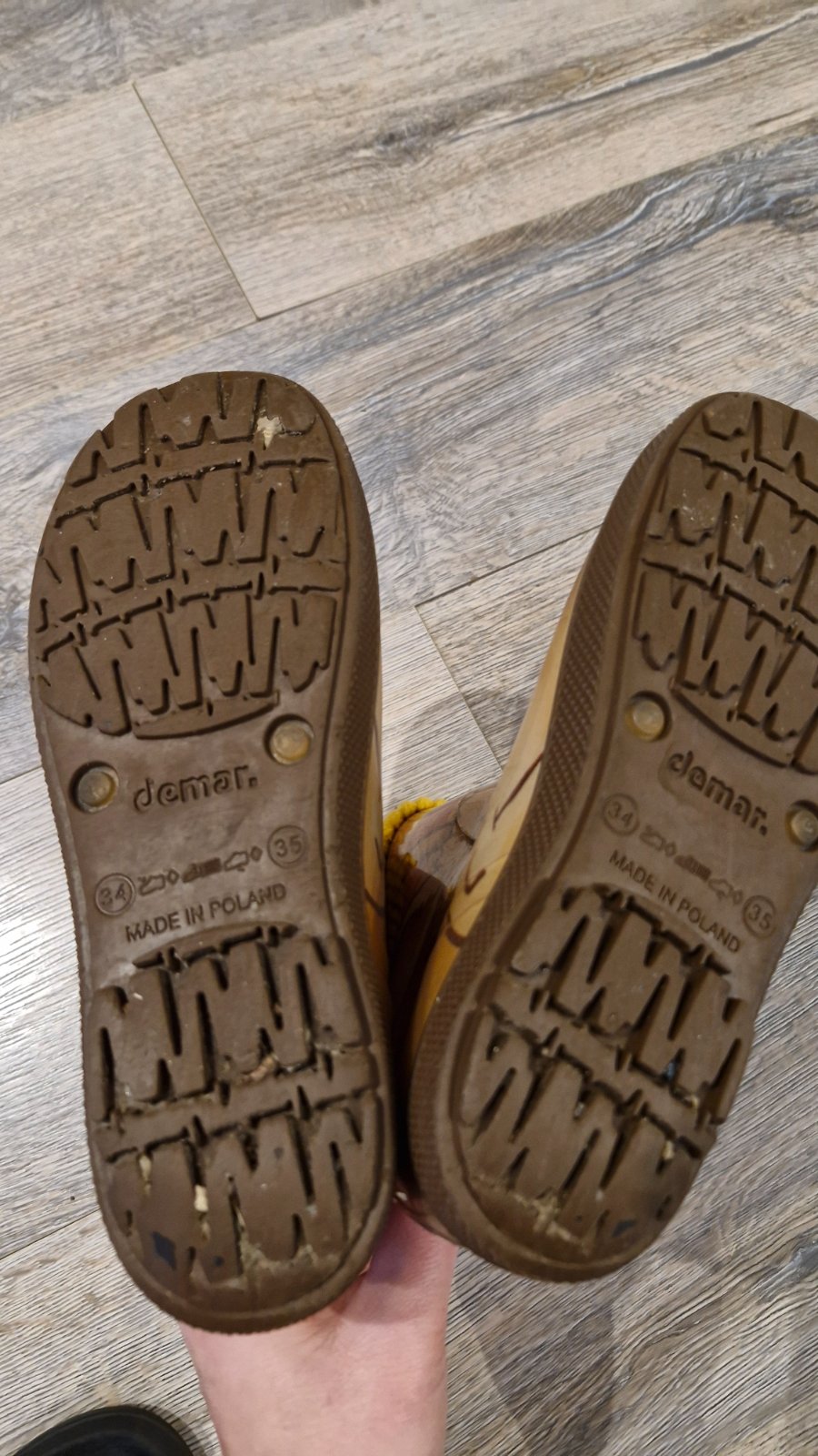 Detske gumaky Demar, velkost dvojcislie 34-35. Su zateplene, zateplenie sa da vybrat. Na pravej nohe na zatepleni mala dierka, oznacene na foto. Vhodne pre chlapca aj dievca.