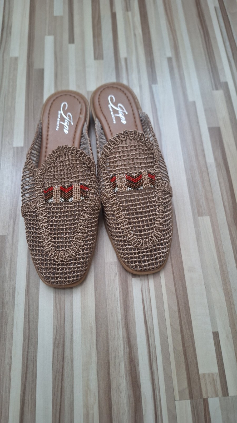 Šľapky veľkosť uvedená 40, UK 7, ale sú menšie tak na 39 sedia veľkosťou. Majú kožené vnútro. Kupované v Taliansku. Farba je svetlá zlato hnedá