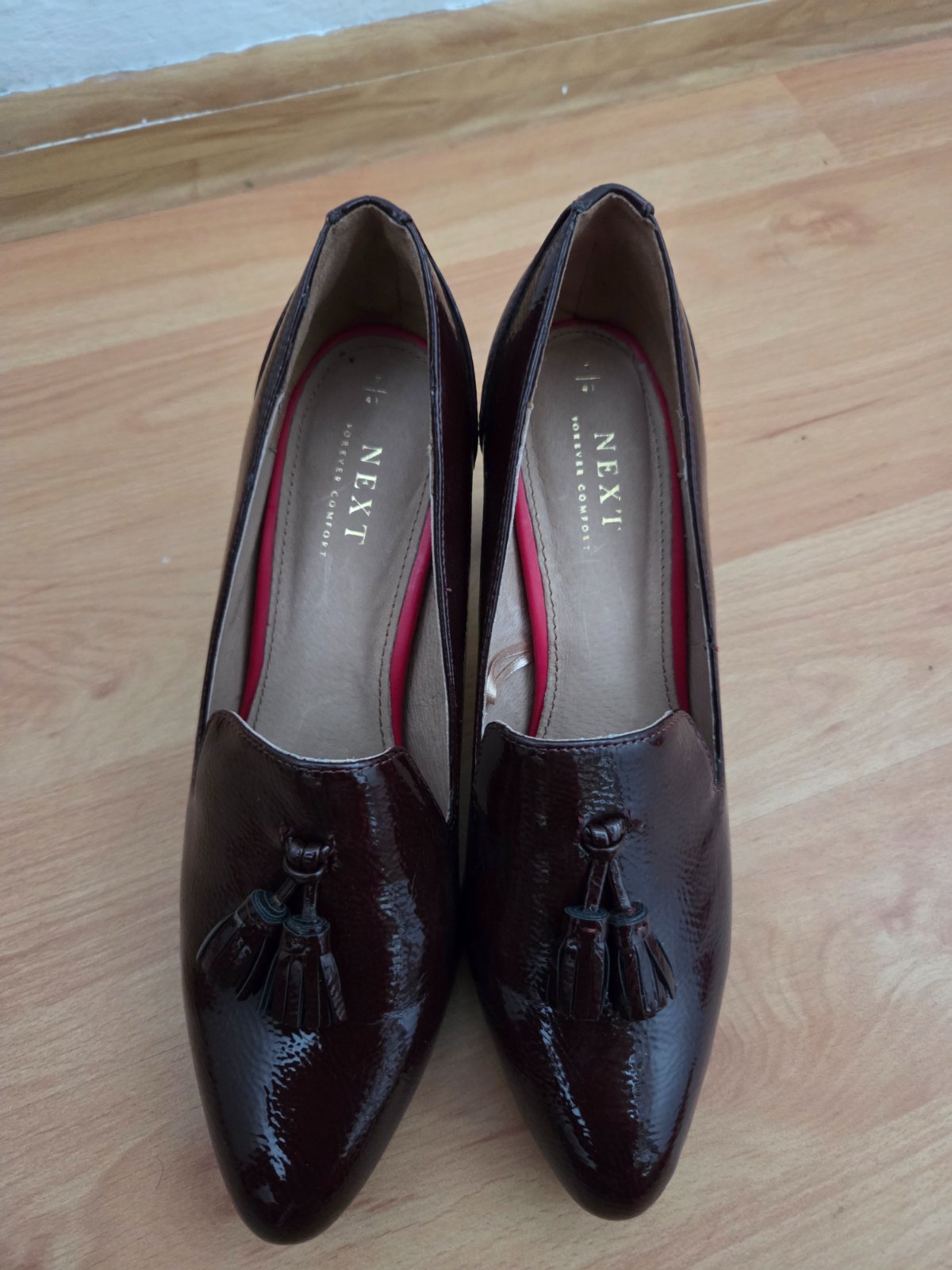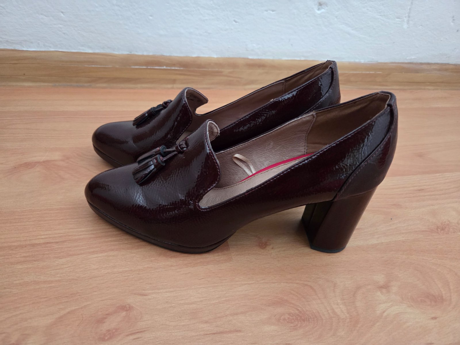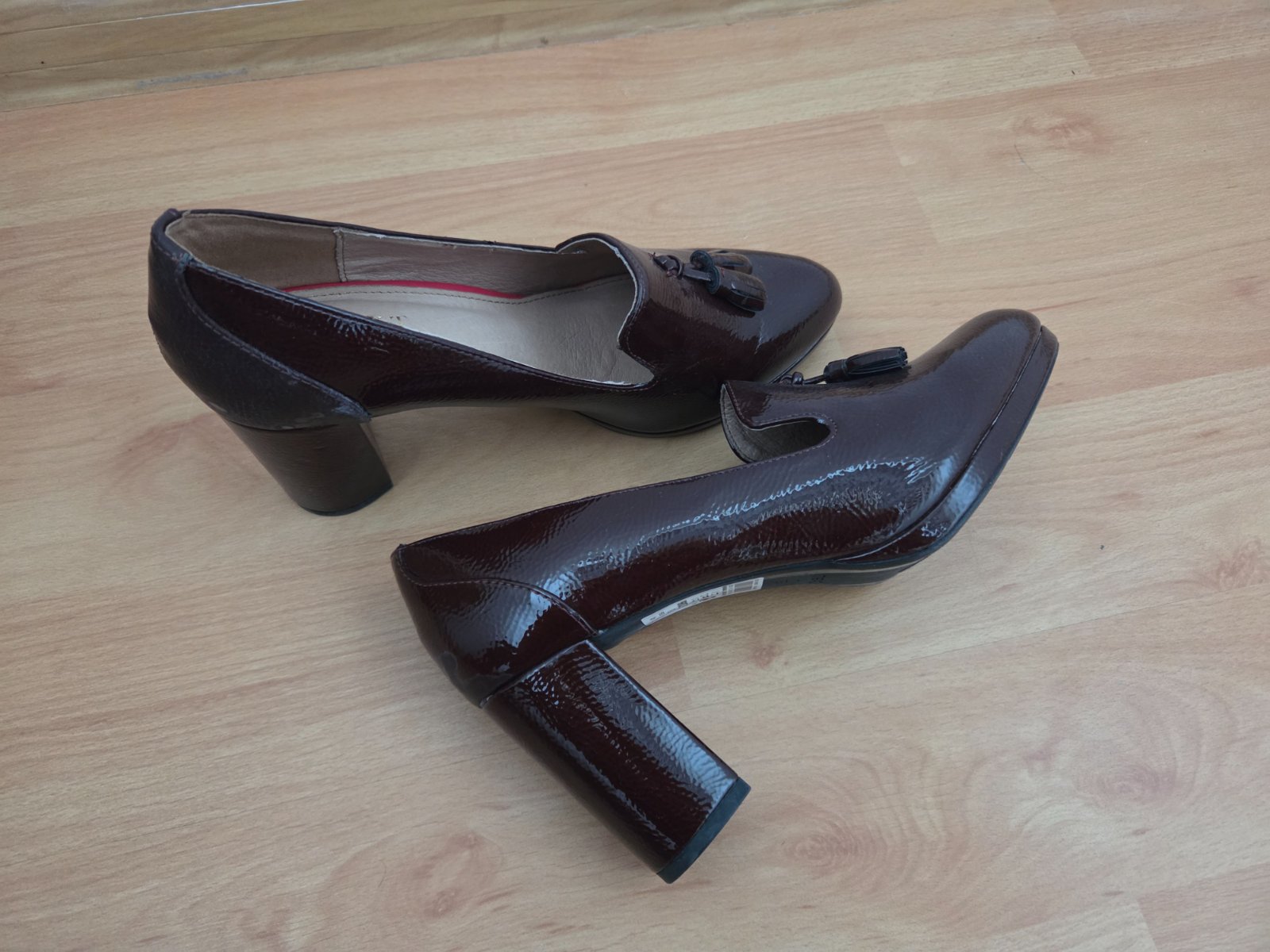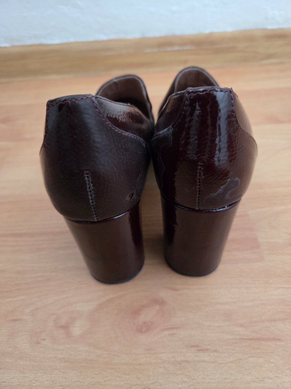 Elegantné lodičky ani raz obuté, žiaĺ lakovaná koža je vzadu na jednej topánke vyblednutá. Pri nosení nieje veĺmi vidieť.