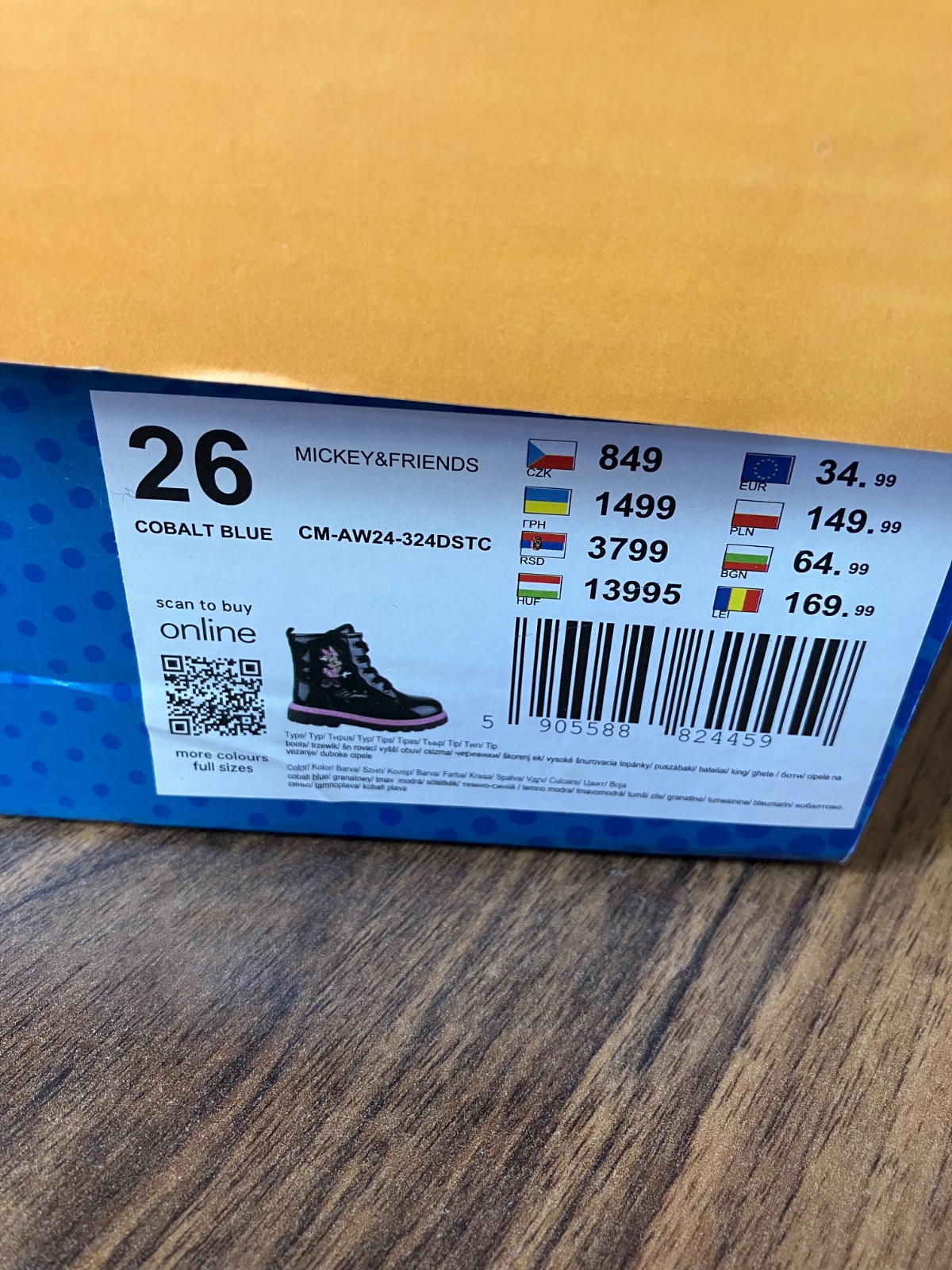 Detske topanocky pre chlapca. Farba tmavomoda so zltou, zapinanie na suchy zips. Velkost je 26. Su nove, nestihli sme ich vynosit. Cena 5e.