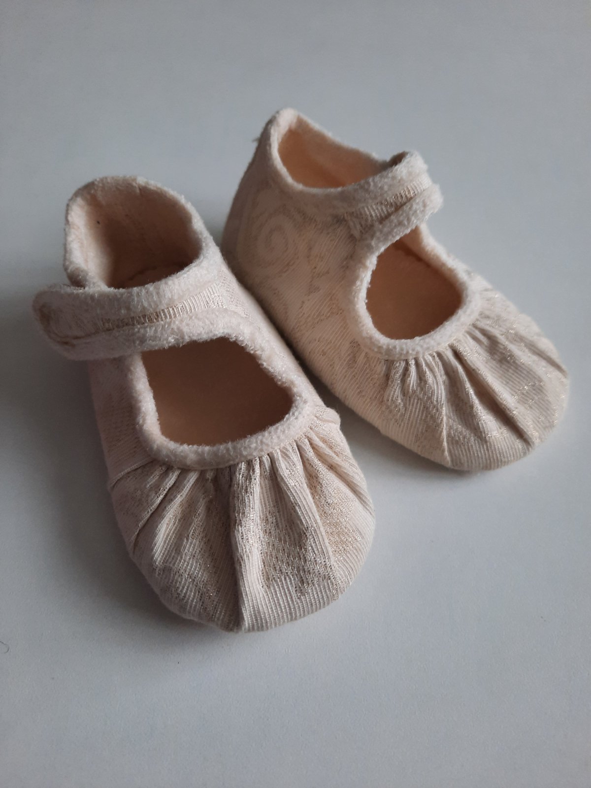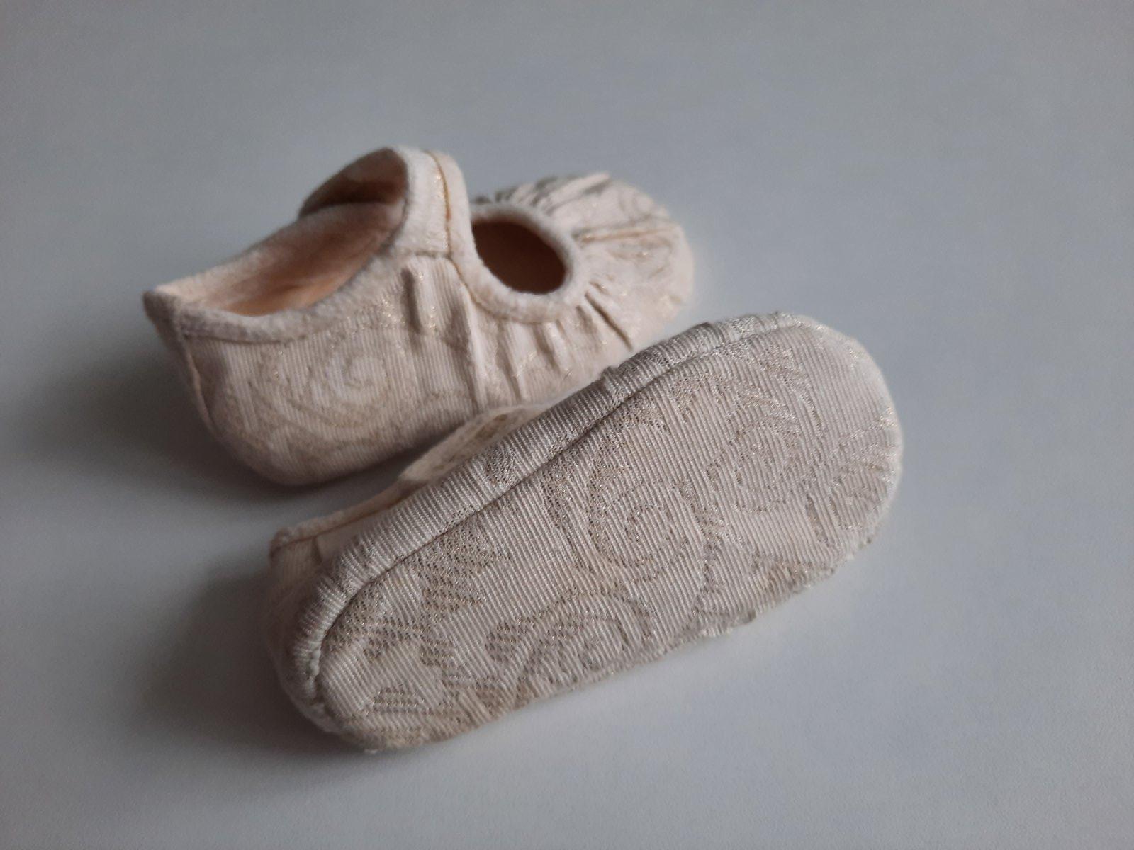 Krásne, luxusné capačky zn. ESCADA, nové, kupované v Londýne, nepoužité. Vhodné aj ako darček. Zapínanie na suchý zips, z pevnejšej látky, akoby jemne vystužené, ale mäkké, ľahké. Vnútorná látka akoby jemne semišová, vonkajšia bežovej farby, vzor na látke ma zlatisté odlesky, zlatá niť. ( nedá sa mi to odfotiť dobre, foto skresľuje) Ponožky sú gratis.