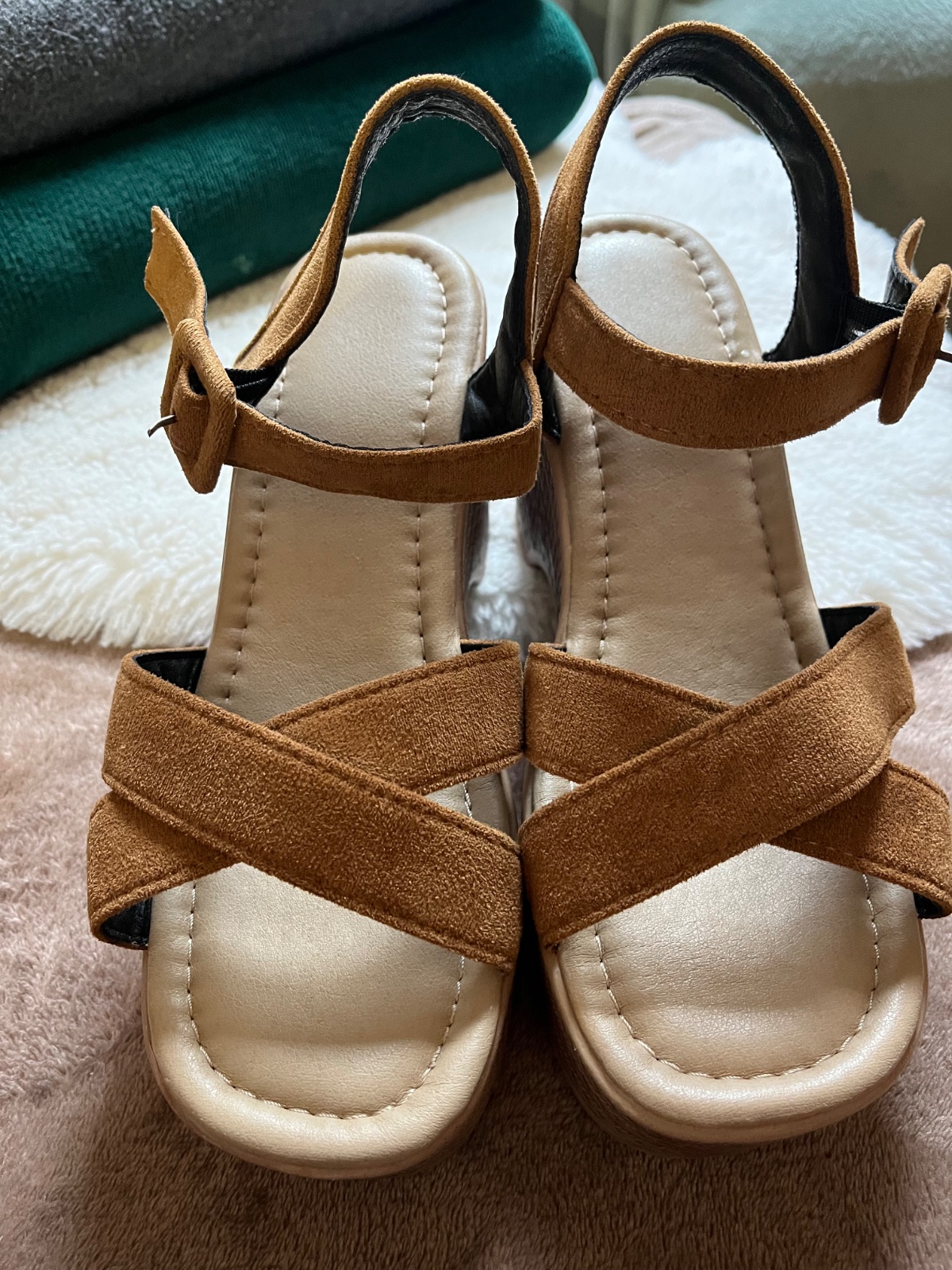 Úplne nové, nepoužívané. Výška opätku je 10,5cm, ale je tam aj platforma. Sú pohodlné. Pekná kombinácia farieb.