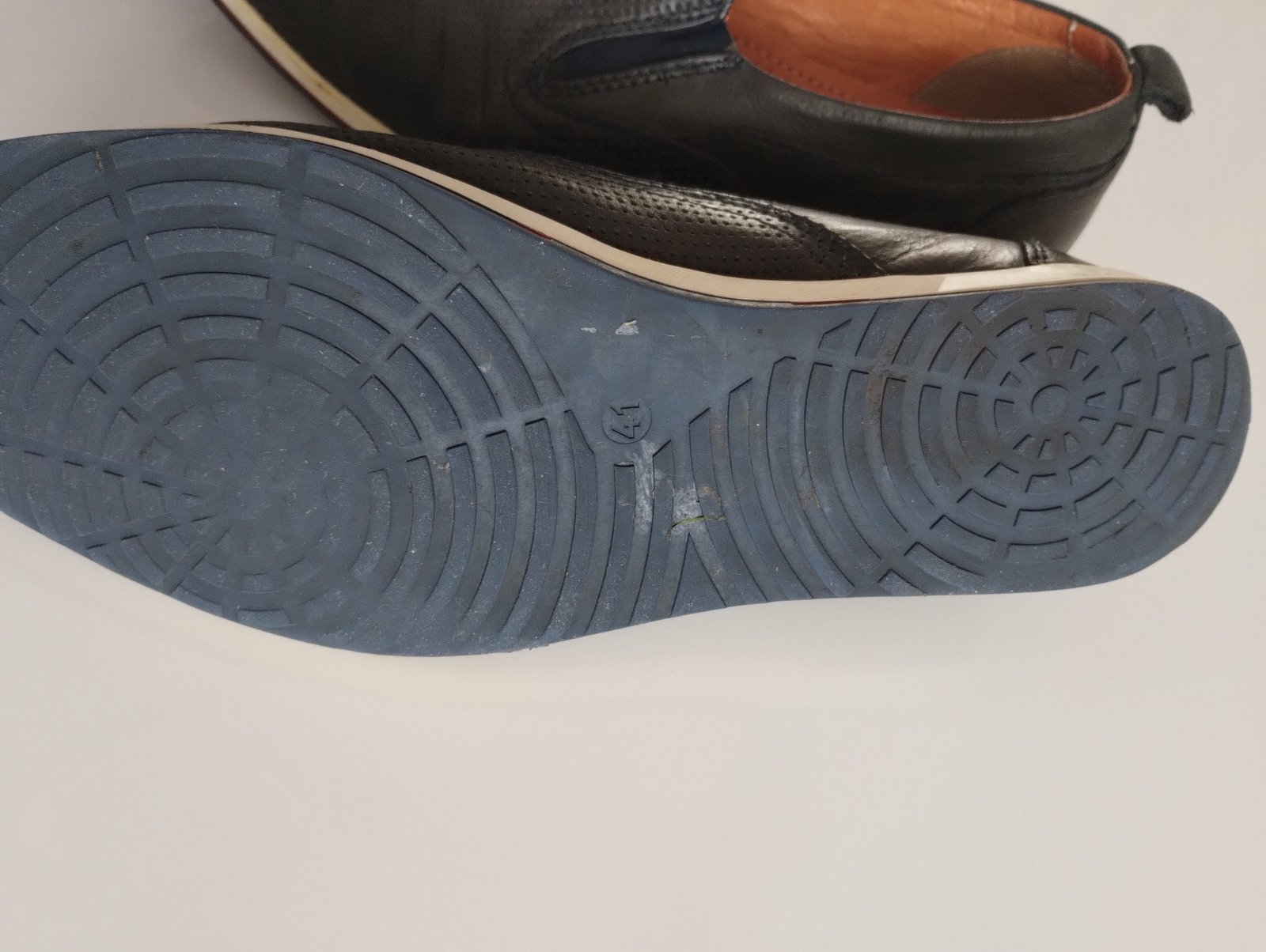 Farba tmavomodrá až čierna. Materiál koža. Vnútorná dĺžka 28 cm.