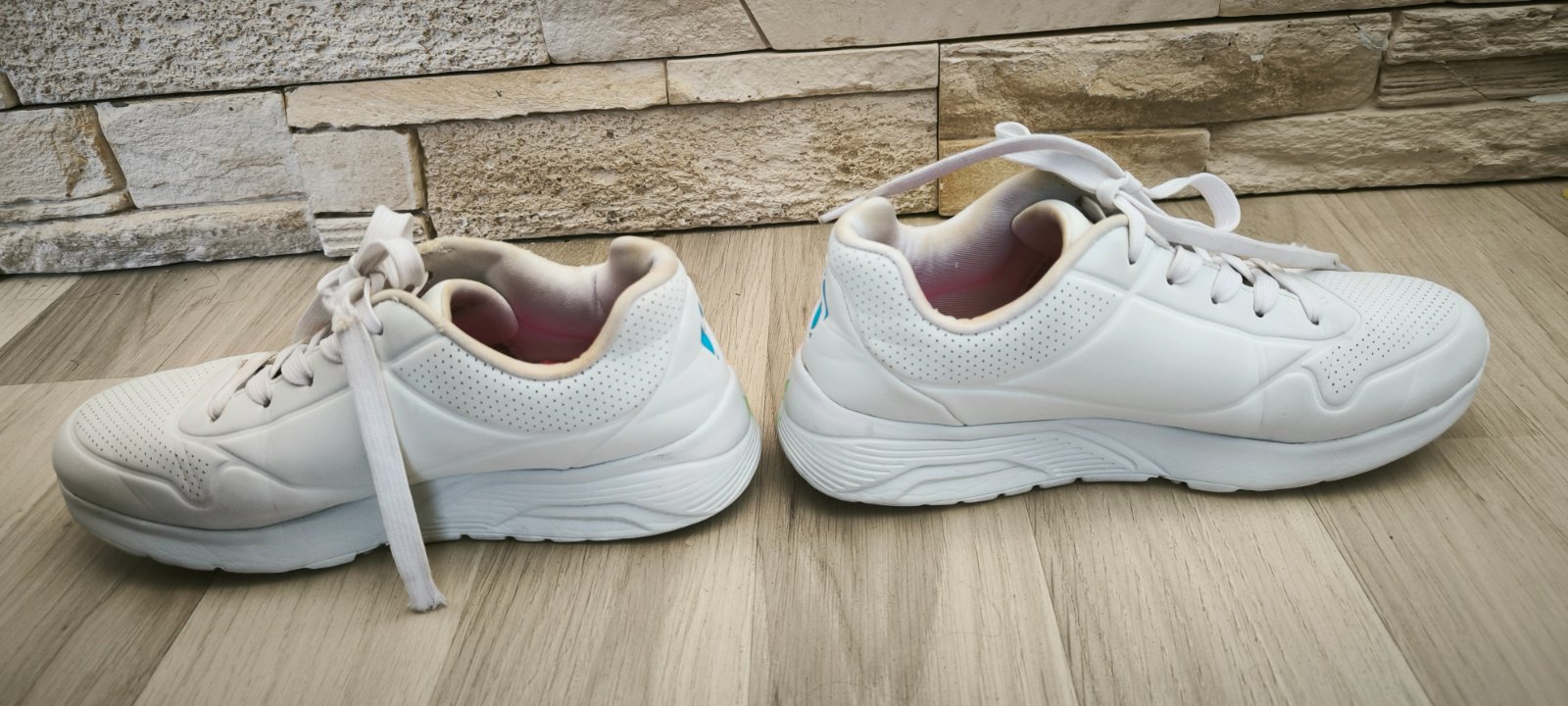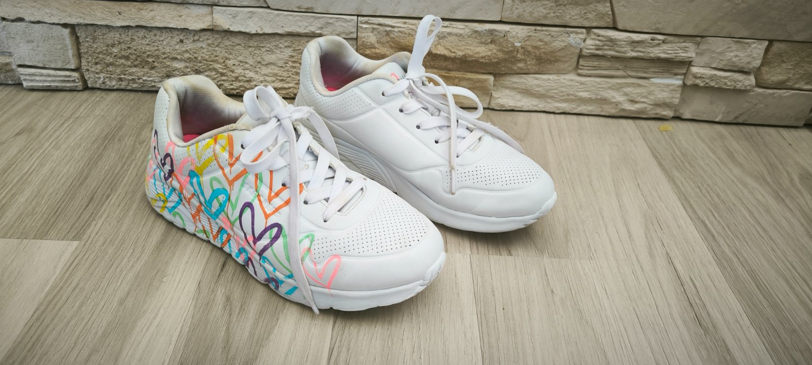 Predám dievčenské tenisky značky Skechers. Pekný stav.Su biele s farebnými prvkami. Vnútri majú pamäťovú penu, veľmi pohodlné.Velkost 36,5, výrobca udáva 23,5cm vnútornú vložku.