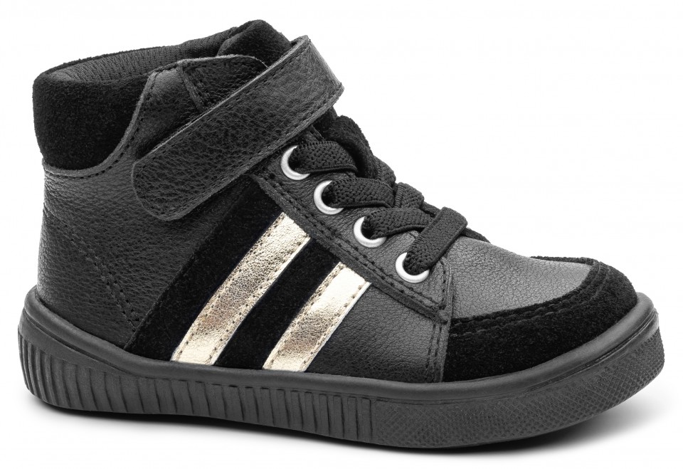 Dievčenské vychádzkové jesenne topánky v čiernej farbe. Sú vyrobené z kombinácie hladkej prírodnej prémiovej kože a brúsenej kože, doplnené o zlaté pásiky. Kombinácia suchého zipsu a šnúrok umožňuje jednoduché regulovanie a pevne fixuje topánku na nohe. Okrúhla podošva je odolná, ale zároveň ohybná. Špička topánok je chránená pred mechanickým poškodením. Topánky majú nad opätkom majú mäkký golierik. Širší priestor pre prstyNa stielke je jemne podporená klenba chodidla. Obuv má pevný opätok, ktorý zabraňuje vybočeniu piat a udržuje chodidlo v správnom postavení. Obuv je vyrobená z kvalitných certifikovaných materiálov.