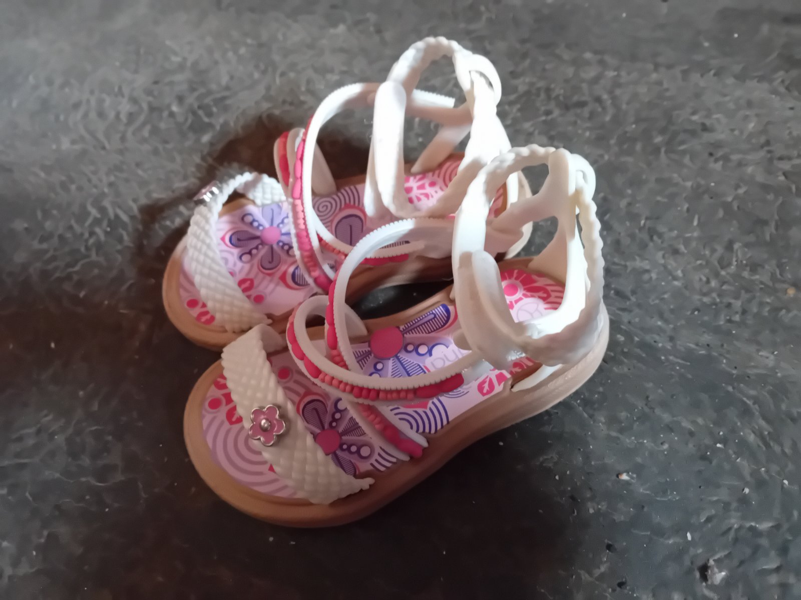 Dievčenské sandálky, používané na doma ako papuče. Jedna je na špičke ošúchaná. Viď foto.