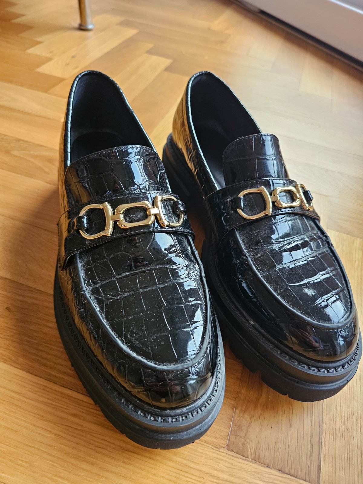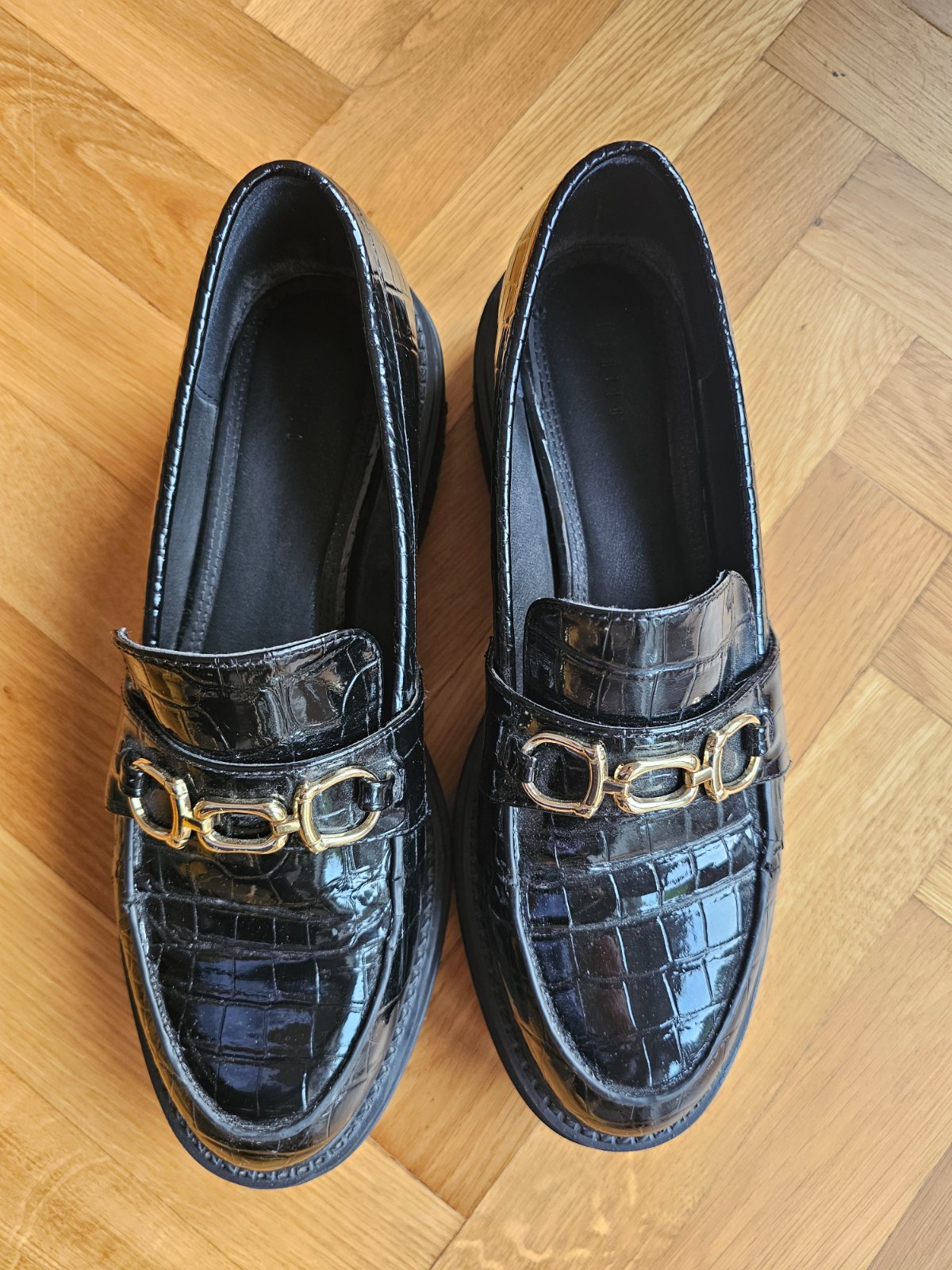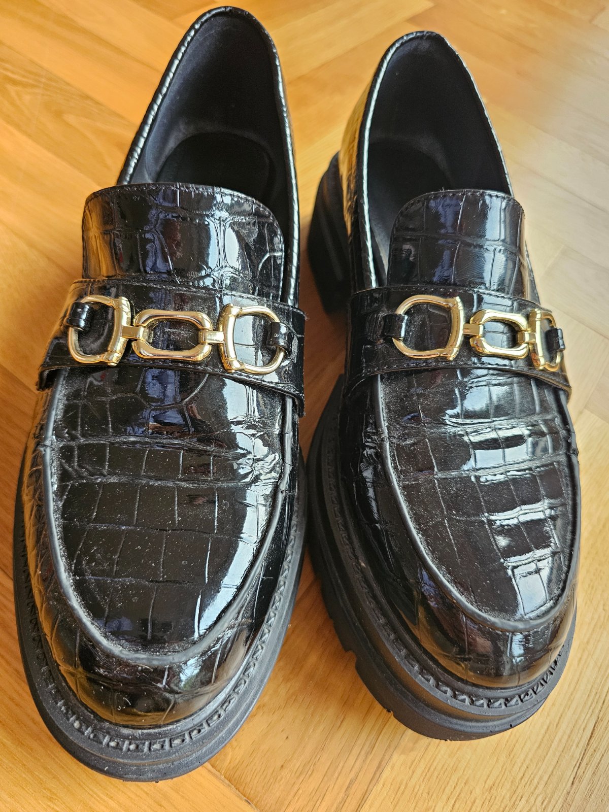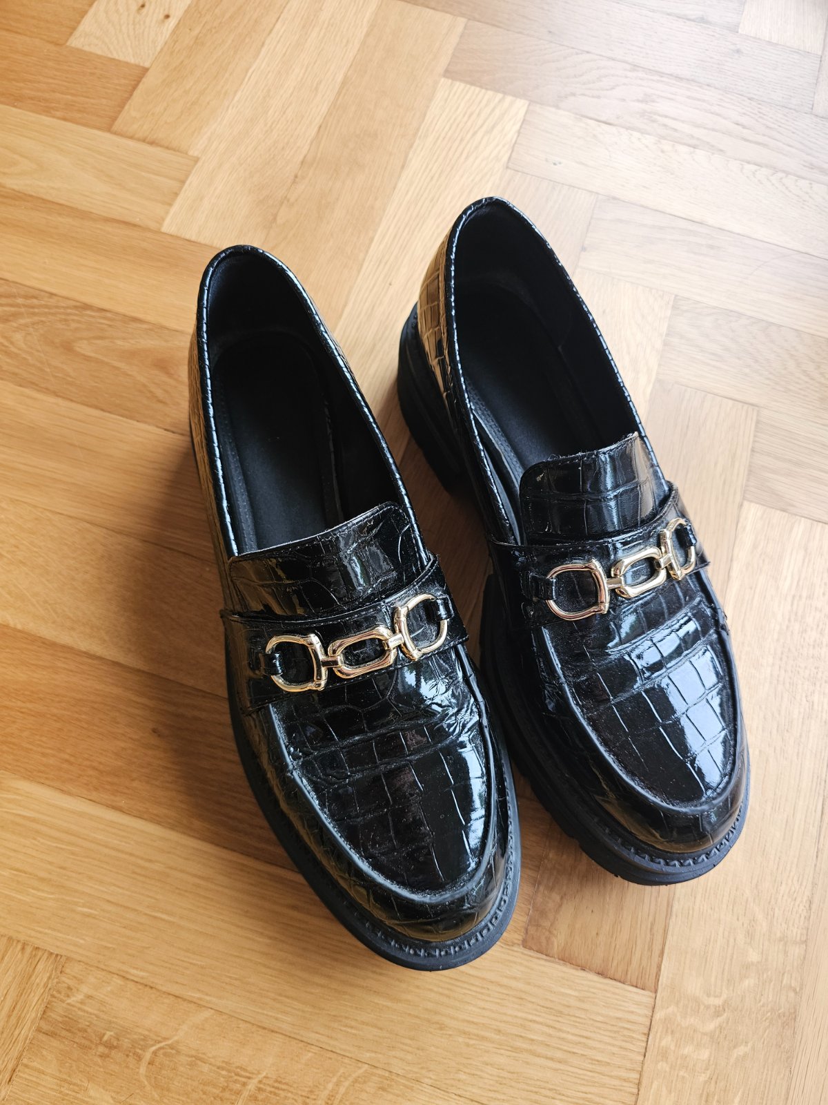 Krásne loafers so hrubsou podrážkou a zlatou sponou.