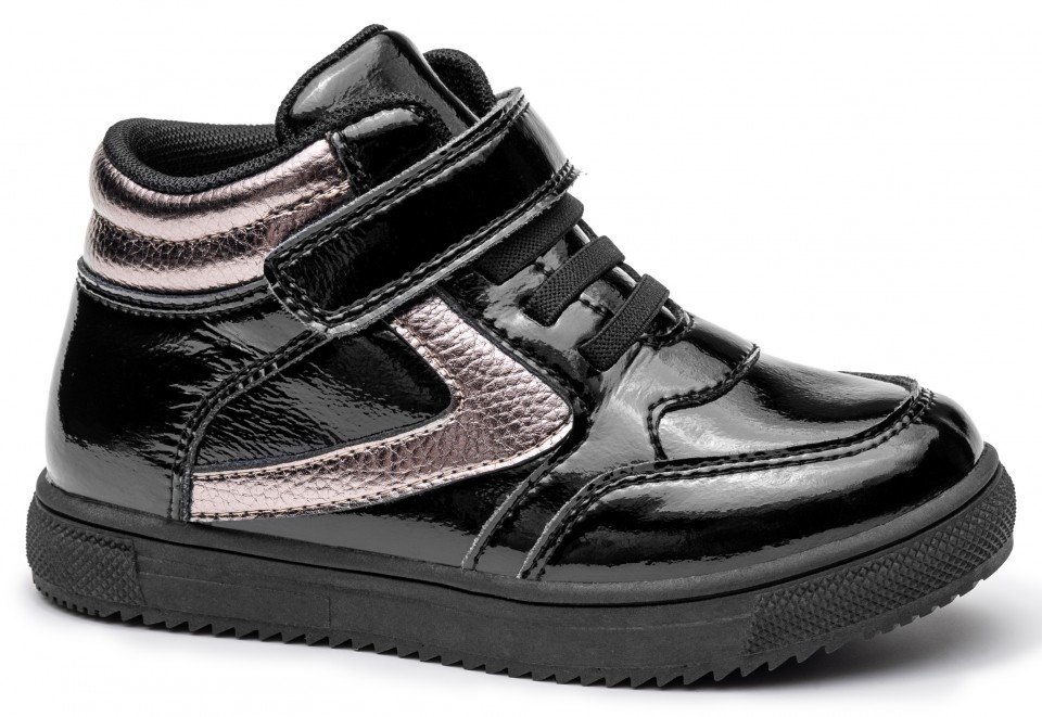 Štýlové celoročné topánky sú vyrobené z pravej lakovanej kože. Čierna farba zvršku je doplnená ružovými metalickými prvkami. Topánky majú elastické šnúrky aj suchý zips. Okolo členka je mäkký golierik. Vo vnútri majú vyberateľnú koženú stielku, ktorá jemne podporuje klenbu chodidla. Podošva je jemne "traktorová", odolná a ohybná.