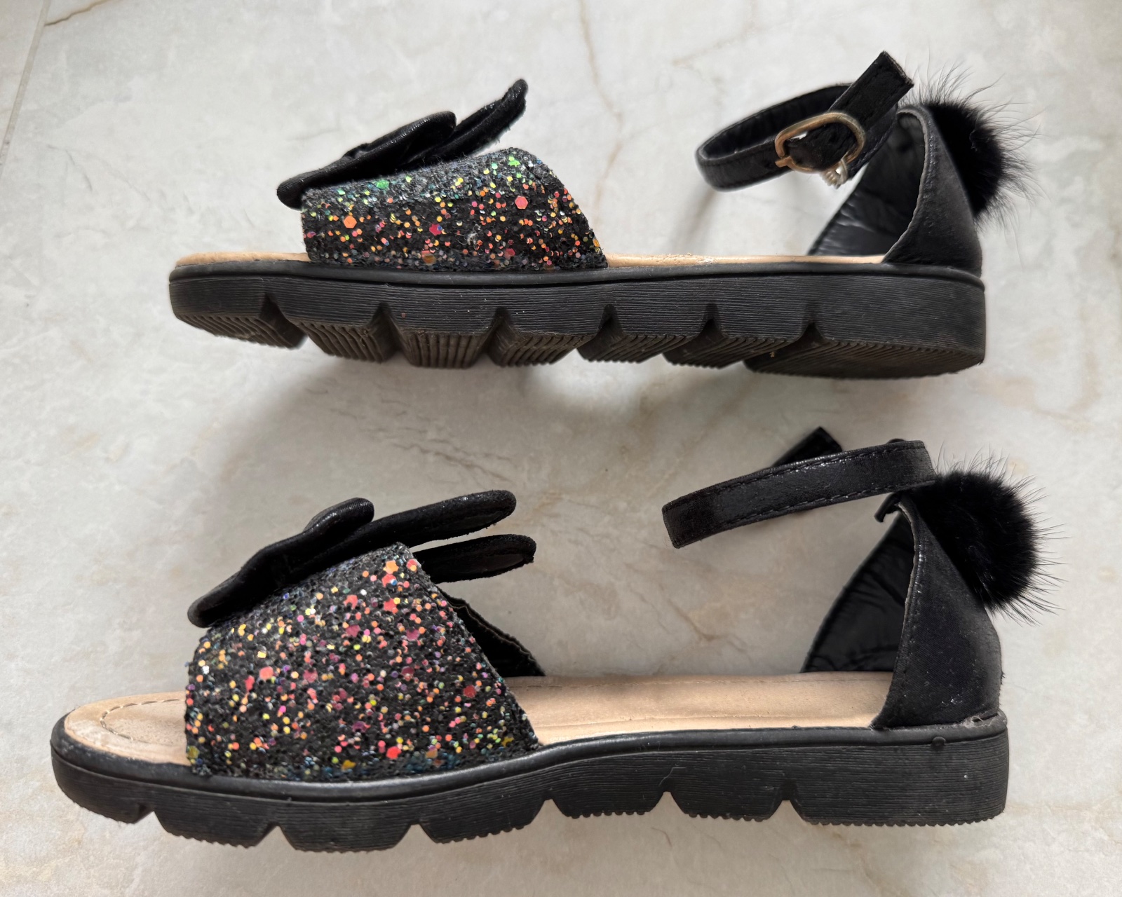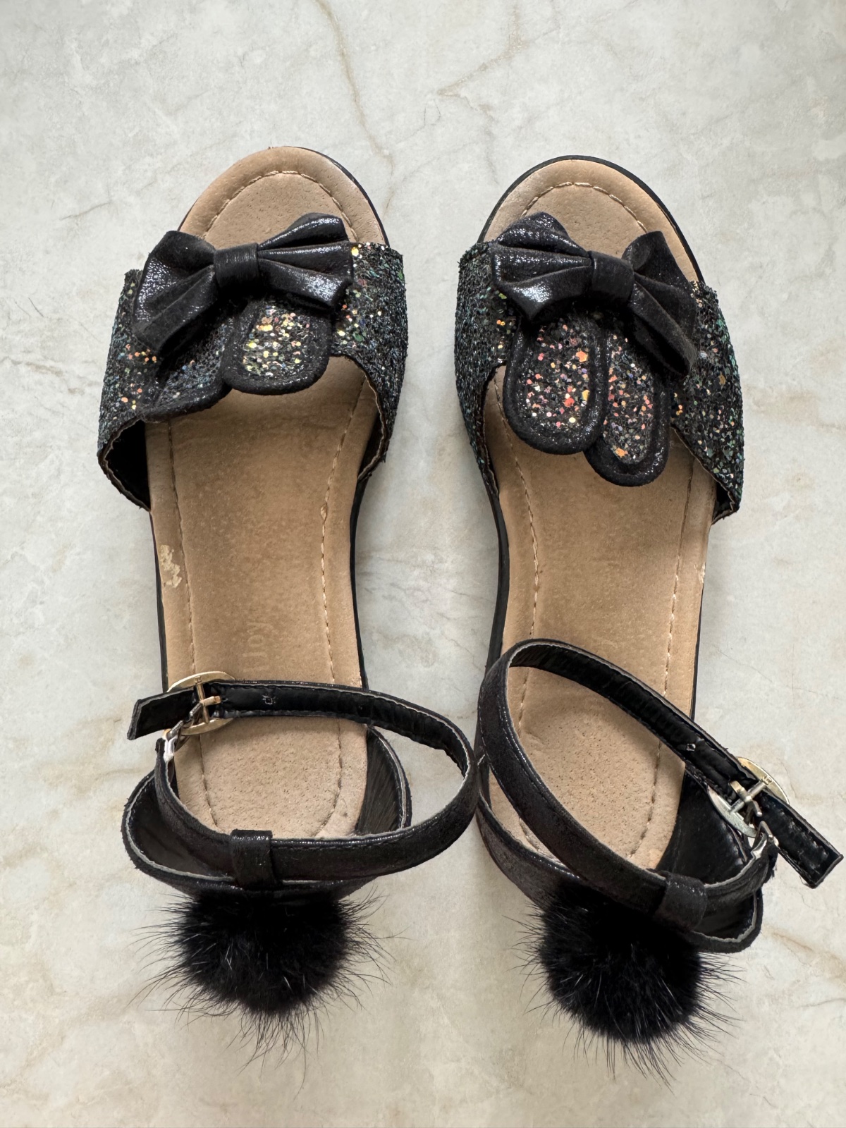 Milené sandálky s brmbolčekom na päte a mašličkou voredu. Celková dĺžka 21 cm.