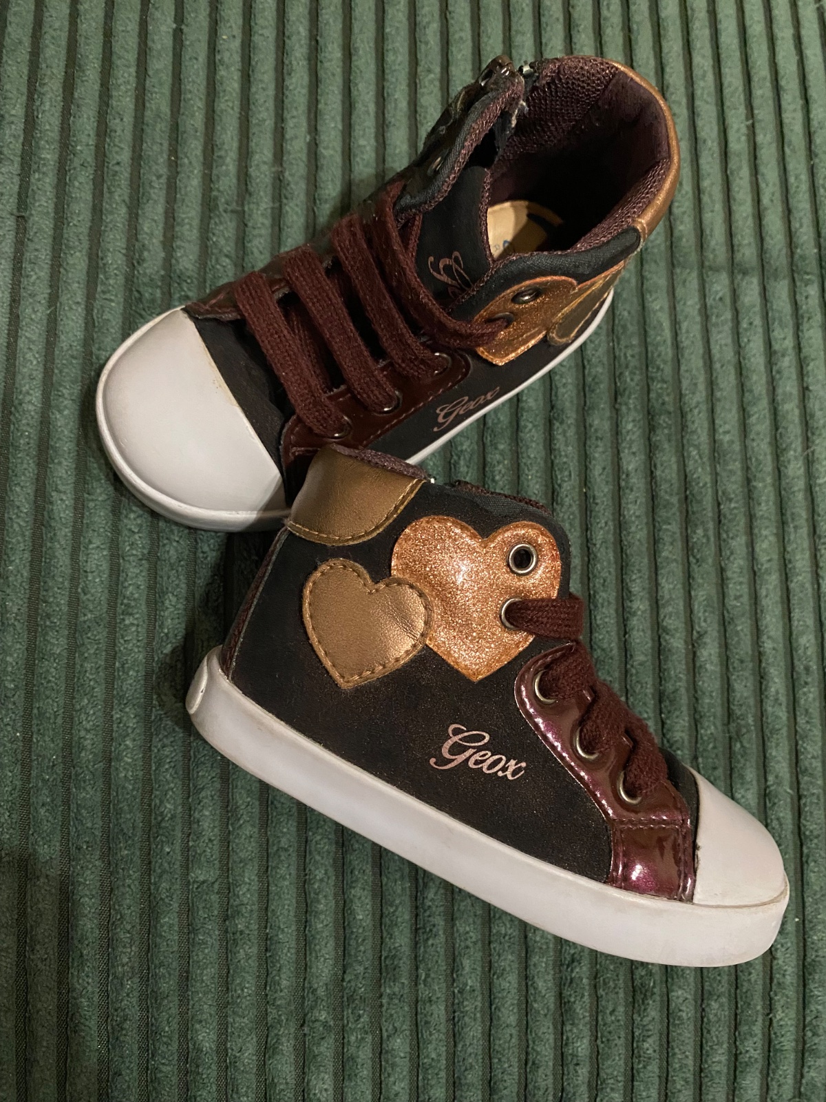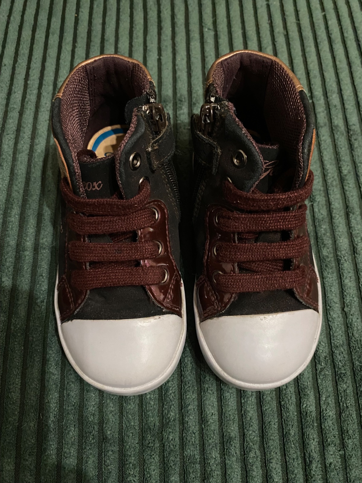 Predám blikajúce tenisky Geox, nosený stav. V predu trocha prasknutá koža a tiež jemno aj na boku len povrchovo. Ale určite ešte poslúžia, inak bez poškodenia.