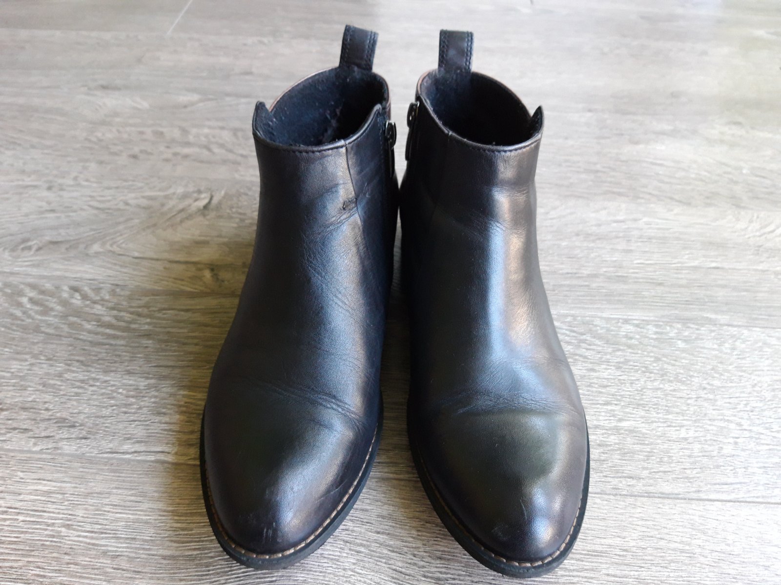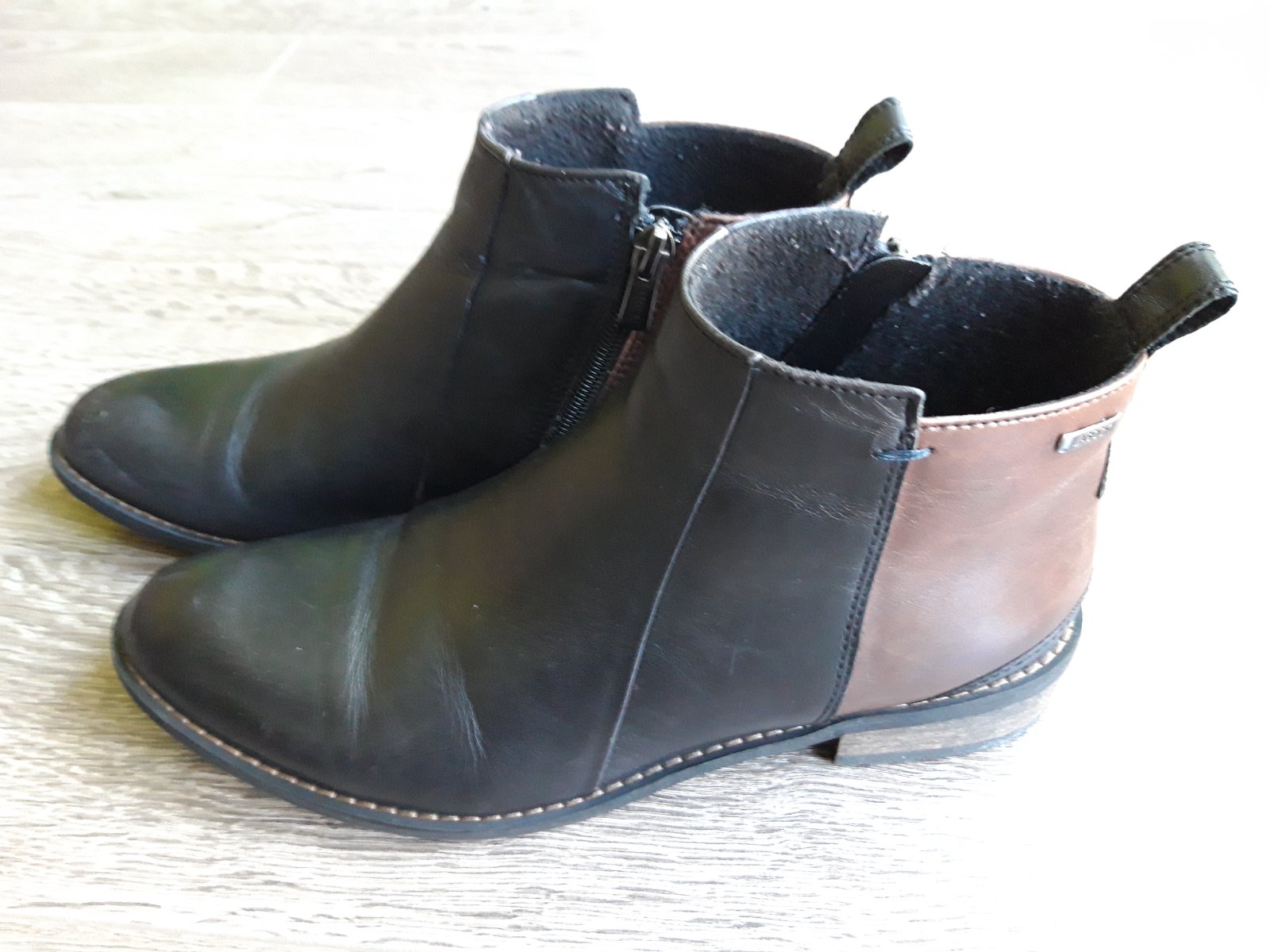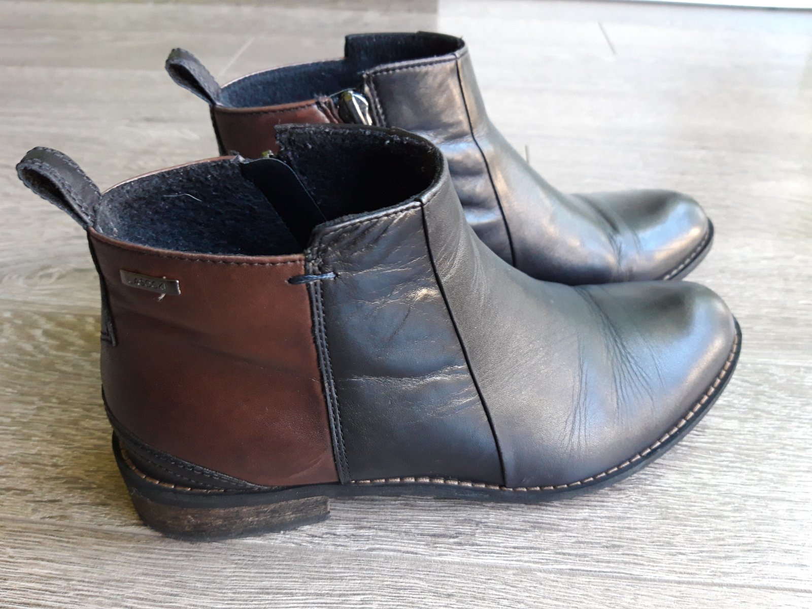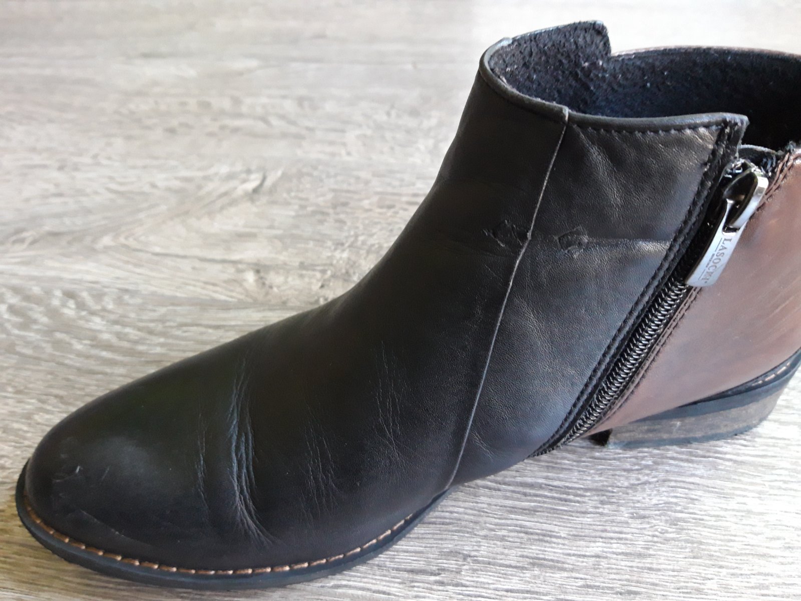 Nizke kozene cizmy znacky Lasocki skor na prechodne obdobie ako tuhu zimu. Topanky su cierno-hnede, celokozene. Velkost 37, vnutorna dlzka 24cm. Topanka na jednej strane mierne zatrhnuta, cena je tomu prisposobena - vid posledna foto (na foto viditelne viac nez v skutocnosti, pri beznom noseni) . Skor na uzsiu nohu.