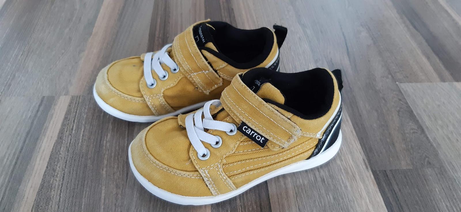 Ponúkam na predaj horčicové/okrové (žlté) plátenky CARROT pre chlapcov. Veľ. 25 (nameraná vnútorná dĺžka 15,5 cm), nosené, mierne ošuchnuté na jednej topánočke, stále vhodné na ihrisko, do piesku, odrážadlo, dvor, či behačku. Cena 1€.