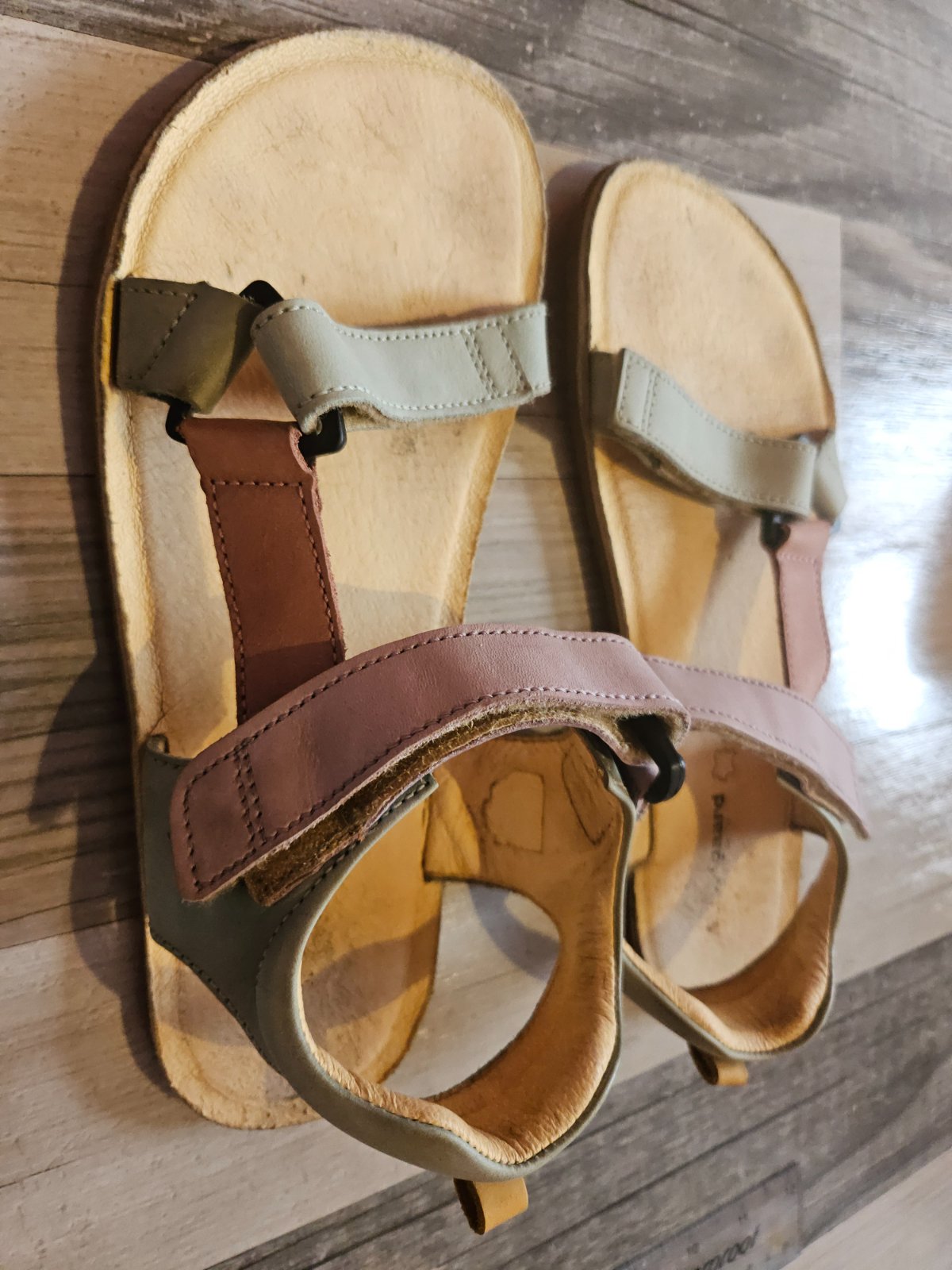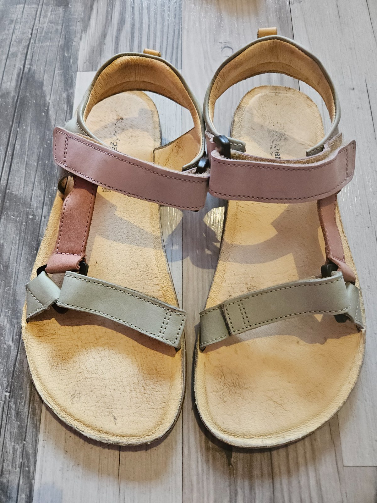 Druhýkrát kúpené, pohodlné kožené sandále. Celková dĺžka je 26,2cm, pozri na fotkách. PC cca 70eur